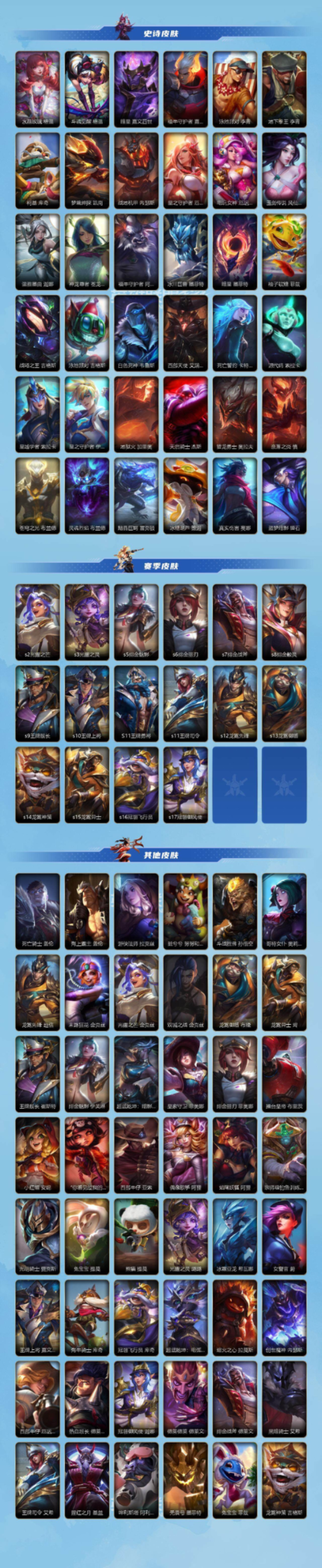 【传说皮肤】:神王 盖伦,暗星女王 拉克丝,心之钢 凯隐,源计划:净化 薇恩,光明哨兵 薇恩,星之守护者 金克丝,星之守护者 卡莎,魔女 伊芙琳,太空律动 “猫猫”布里和里茨 布里茨,K/DA ALL OUT 萨勒芬妮,黑夜使者 亚索,斗魂无双 亚索,御风墨影 亚索,星