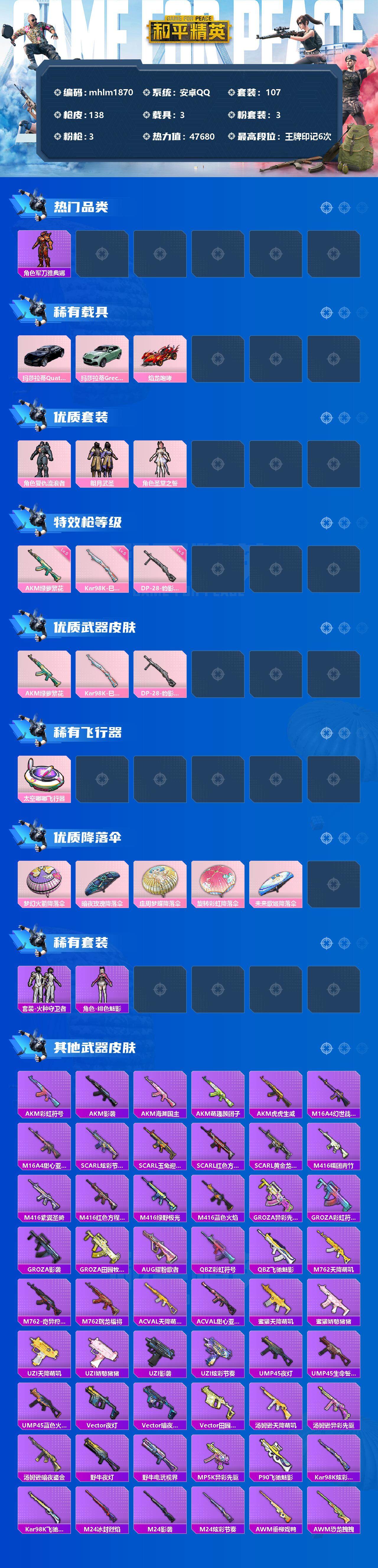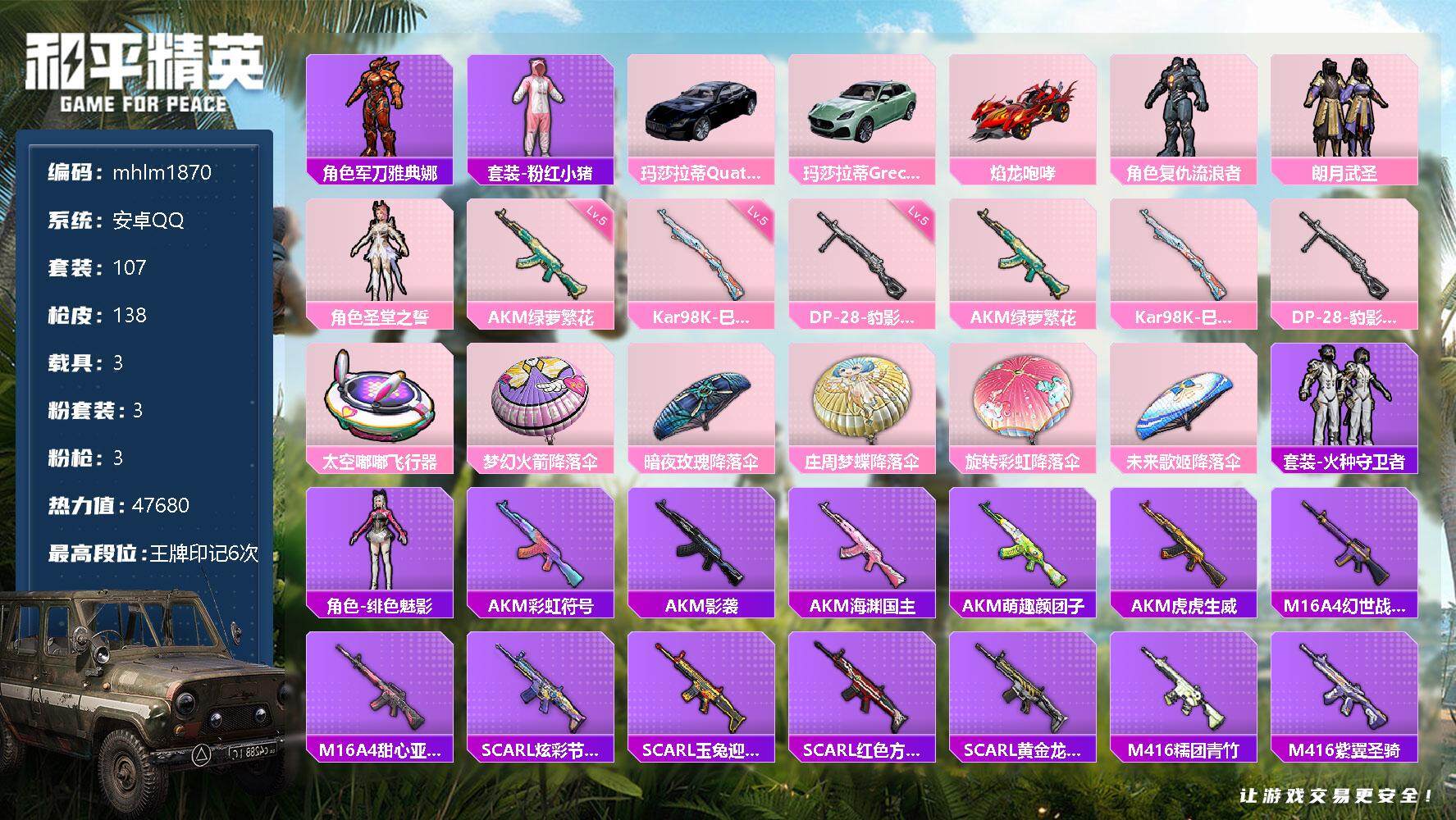 【mhlm1870】安卓 手Q-3粉装-3特效枪-3载具-1粉色飞行器-47680热力值-6王牌印记-107套装-138枪皮