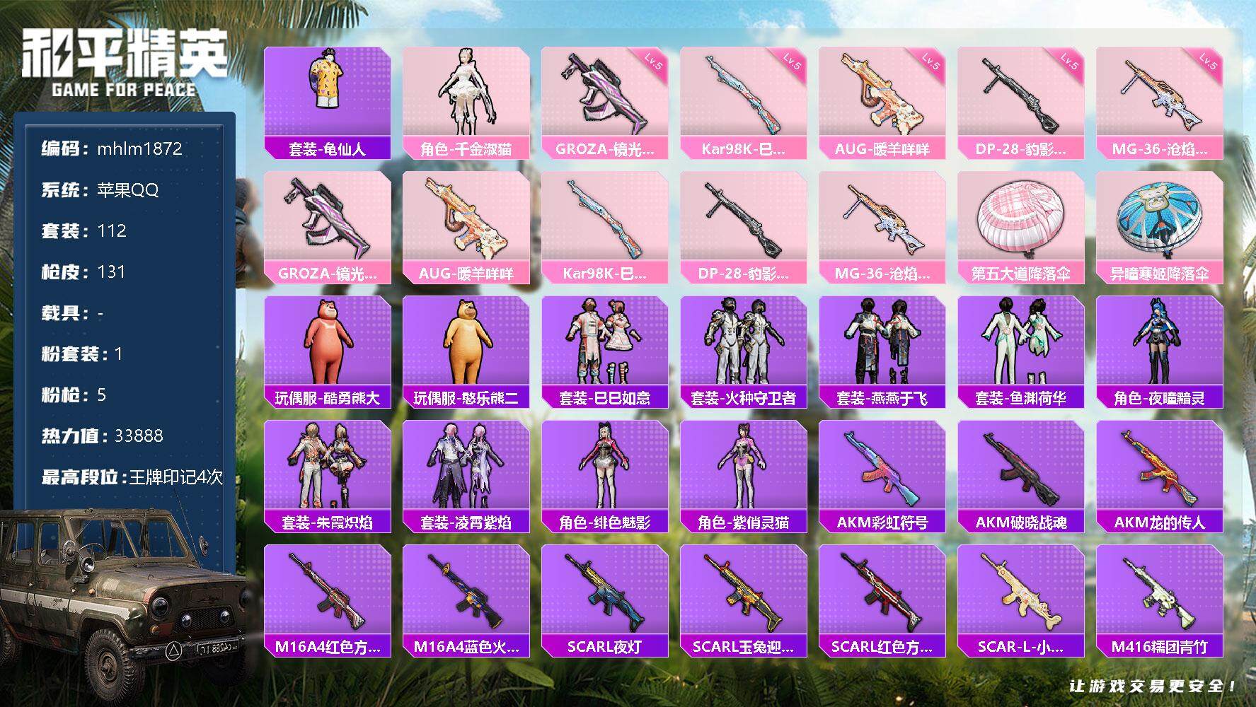 和平精英【苹果QQ】【mhlm1872】苹果 手Q-1粉装-5特效枪-0载具-0粉色飞行器-338