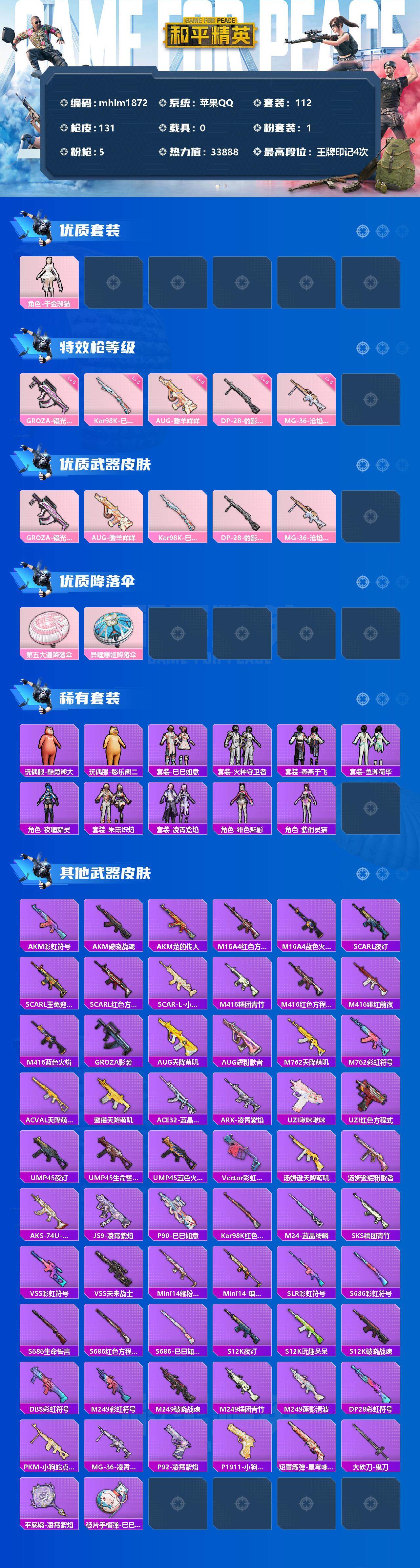 【mhlm1872】苹果 手Q-1粉装-5特效枪-0载具-0粉色飞行器-33888热力值-4王牌印记-112套装-131枪皮