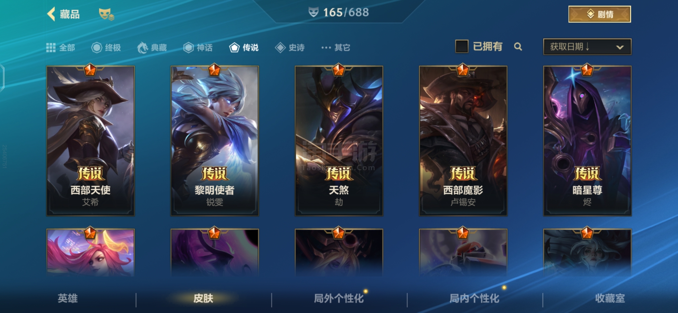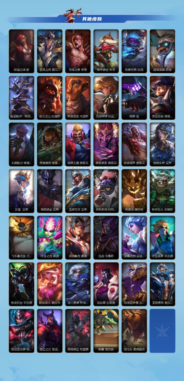 【传说皮肤】:神王 盖伦,光影巨翼 亚托克斯,暗星女王 拉克丝,心之钢 凯隐,光明哨兵 薇恩,星之守护者 金克丝,太空律动 “猫猫”布里和里茨 布里茨,K/DA ALL OUT 萨勒芬妮,黑夜使者 亚索,斗魂