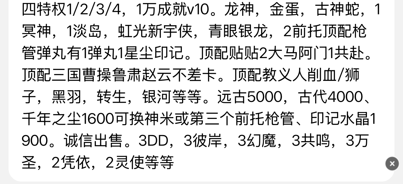 四特权1/2/3/4,1万成就v10。龙神,金蛋,古神蛇,1冥神,1淡岛,虹光新宇侠,青眼银龙,2前托顶配枪管弹丸有1弹丸1星尘印记。顶配贴贴2大马阿门1共赴。顶配三国曹操鲁肃赵云不差卡顶配教义人削血