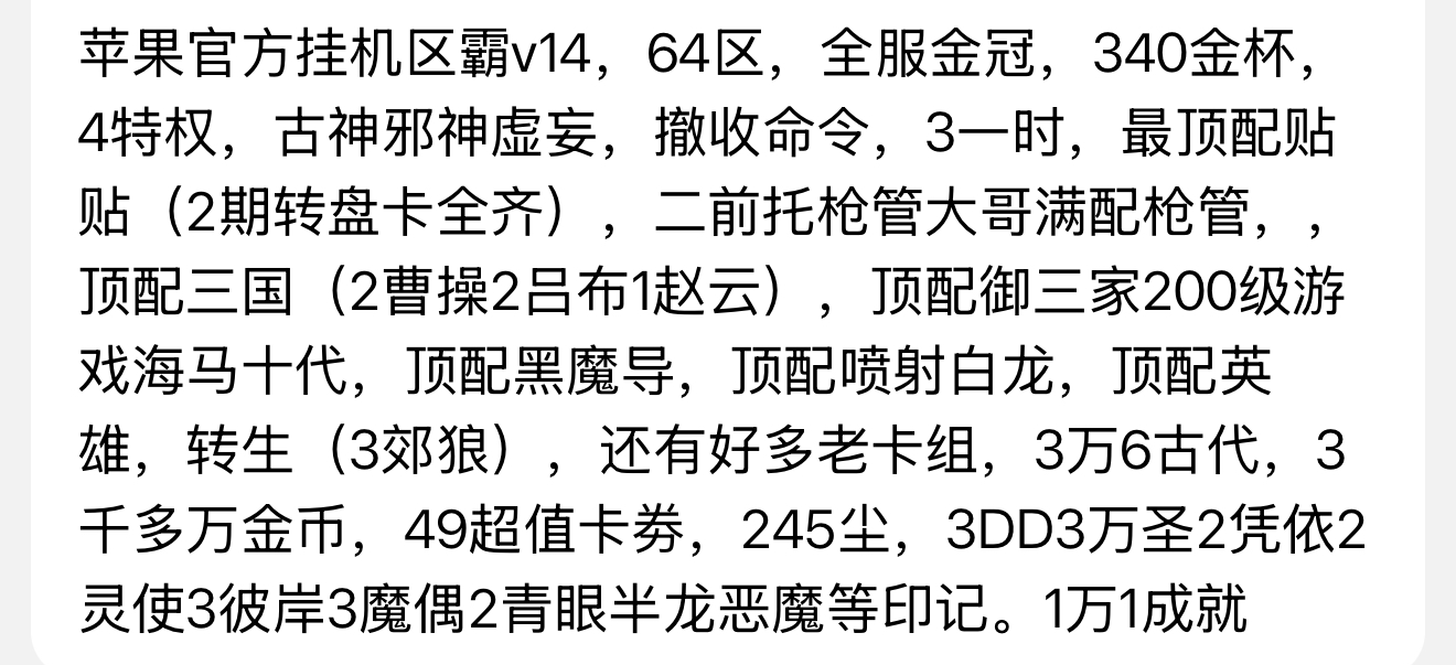v14,64区,全服金冠,340金杯,4特权,古神邪神虚妄,撤收命令,3一时,最顶配贴贴(2期转盘卡全齐),二前托枪管大哥满配枪管,,顶配三国(2曹操2吕布1赵云),满2百级白龙魔导英雄等49超值卡劵