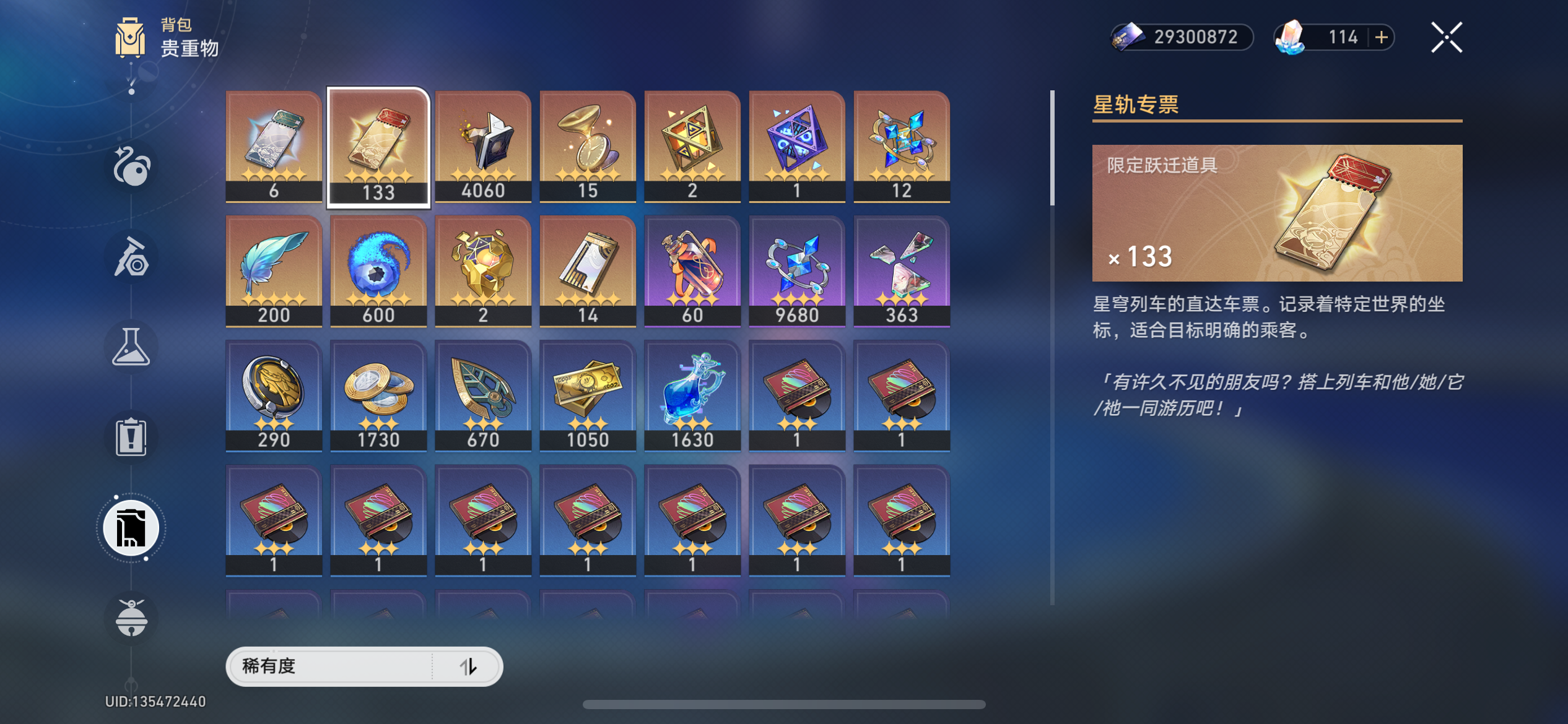 6+2昔涟+133专票欧皇号,角色和光锥都出过双金,剧情到长月夜,3深渊没动,模拟宇宙dlc只打了点,大量活动可做,可肝200-300抽,送网易wsm邮箱