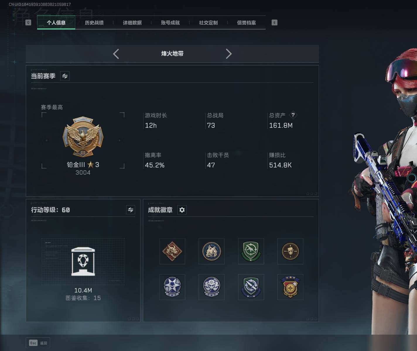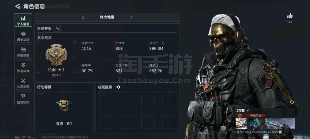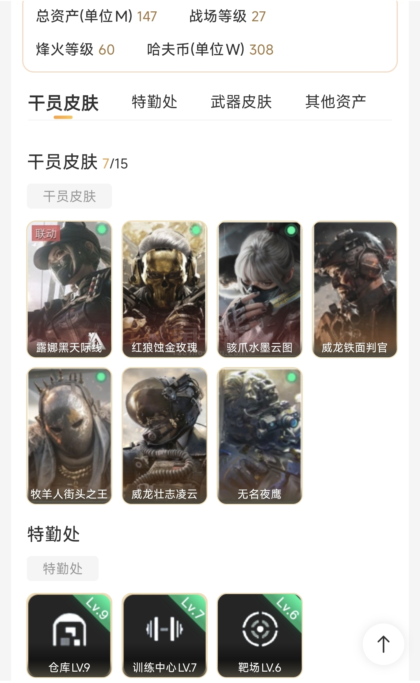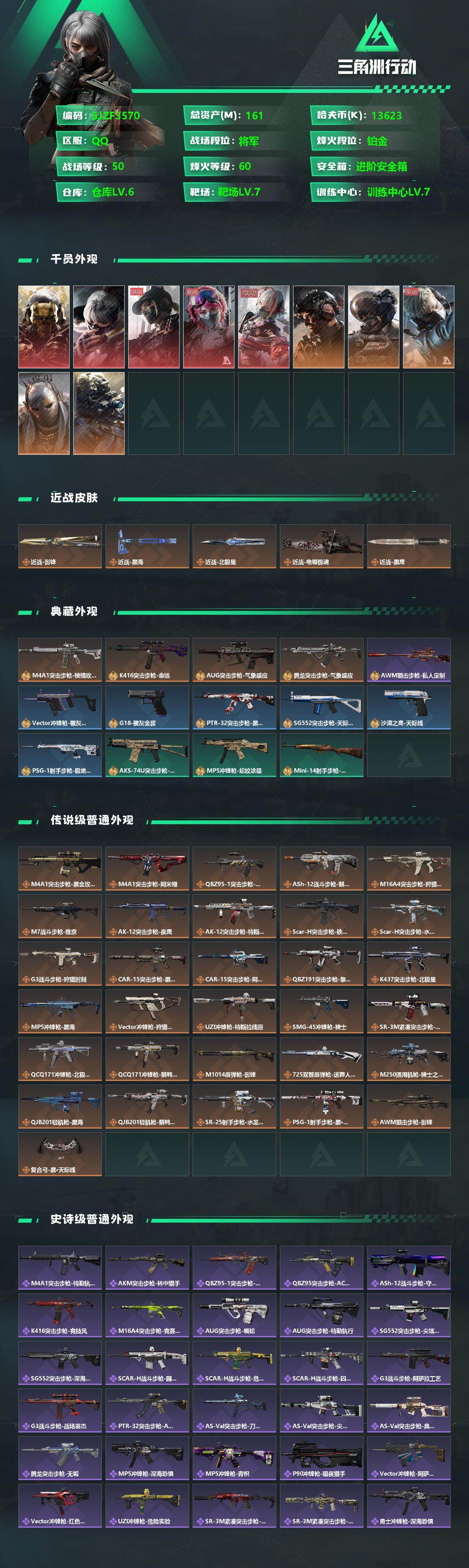三角洲行动【全服通用】总资产(M):161M/哈夫币(K):13623K/全面战场等级:50_段位:将军/烽火地带等级:60_段位:铂金/