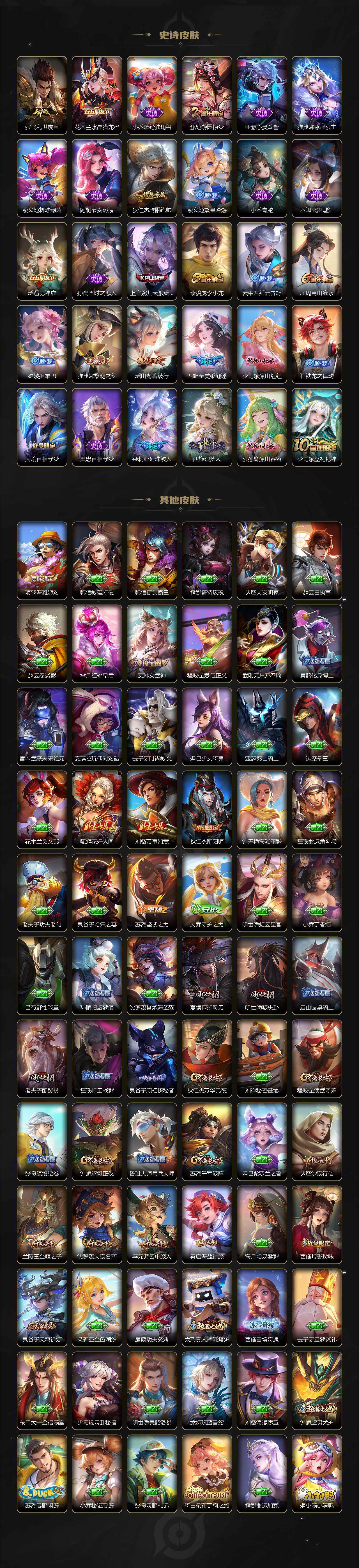 【传说皮肤】:后羿神树通天,西施续相思,女娲愿照千秋盛,妲己愿照众生和,蔡文姬愿照福禄聚,桑启鸣野蒿,干将莫邪久胜战神