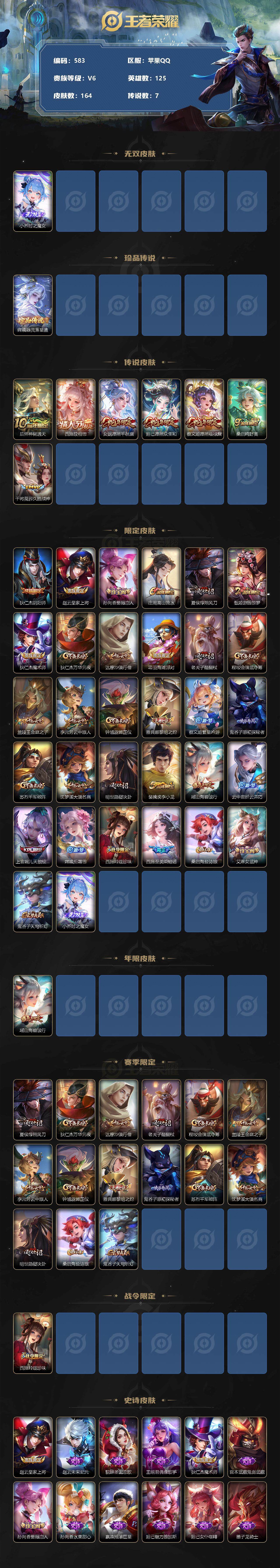 王者荣耀【苹果QQ】苹果Q-V6-最强王者段位-125英雄-164皮肤-0典藏-0珍品无双-1无双