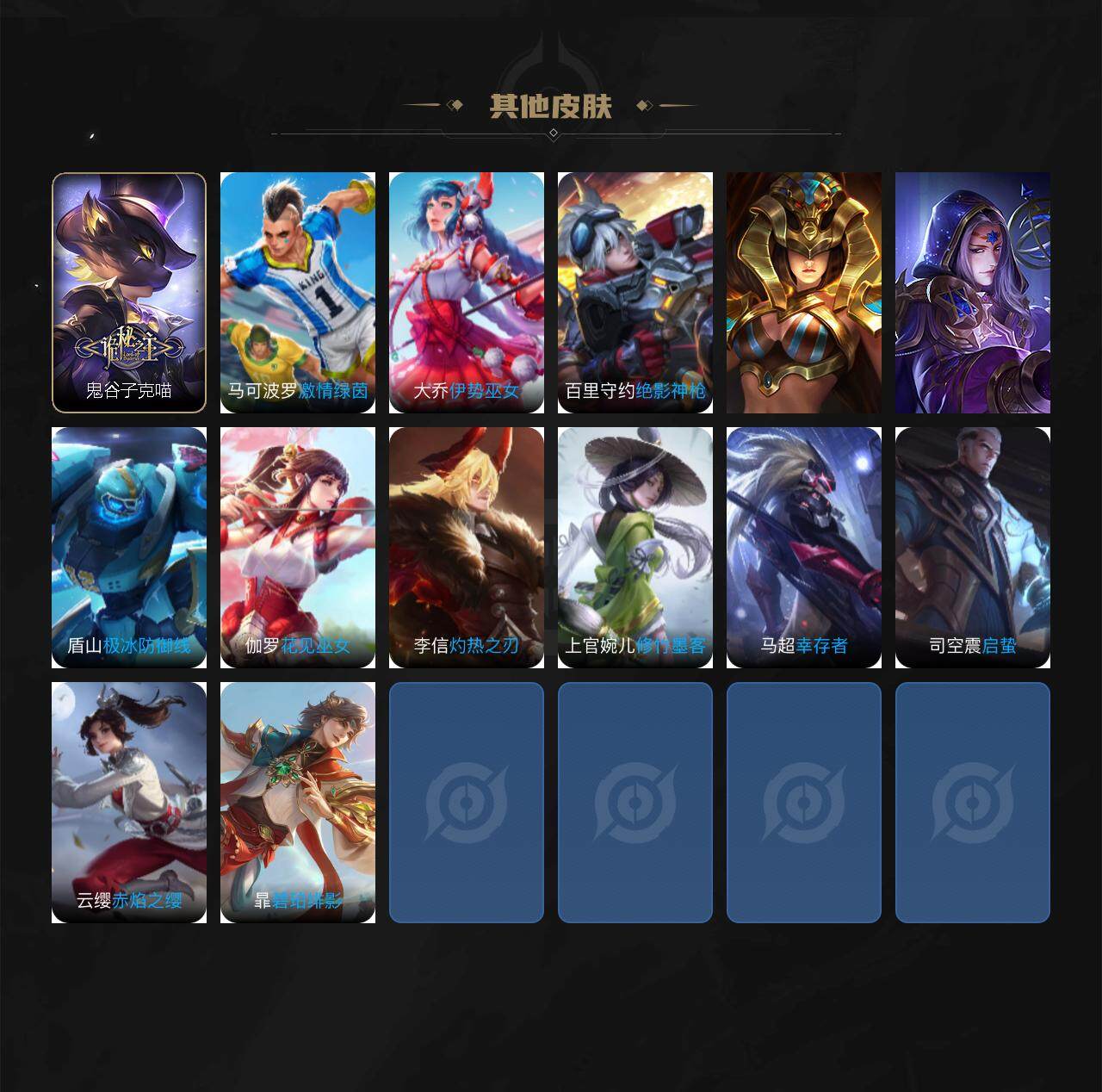 【限定皮肤】:狄仁杰阴阳师,赵云皇家上将,狄仁杰魔术师,项羽海滩派对,兰陵王影龙天霄,李元芳云中旅人,钟馗驱傩正仪,裴擒虎擒涛扼浪,鲁班大