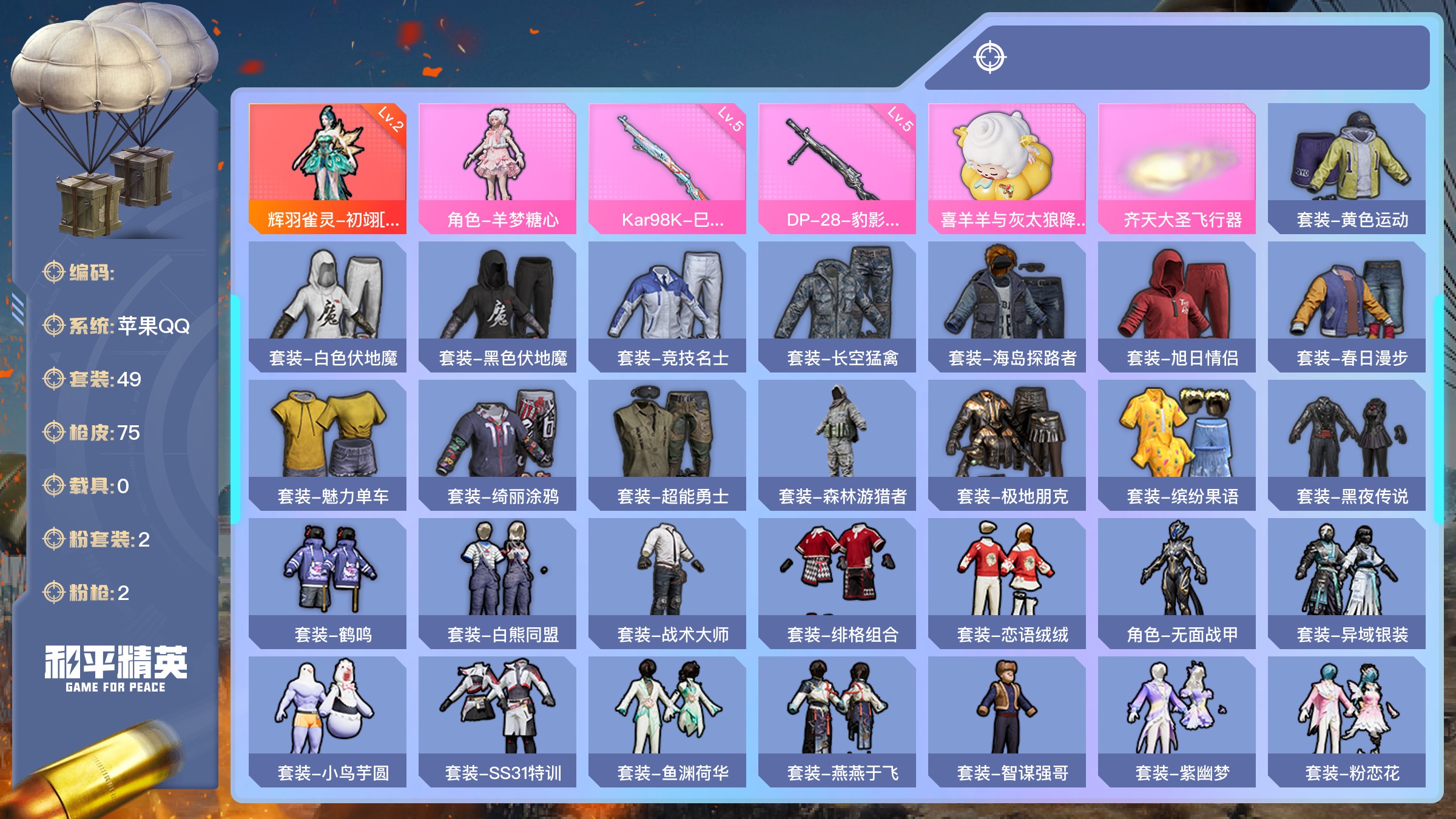 和平精英【苹果QQ】热力值:19229,2粉装,2粉枪,2粉色战备,49套装,