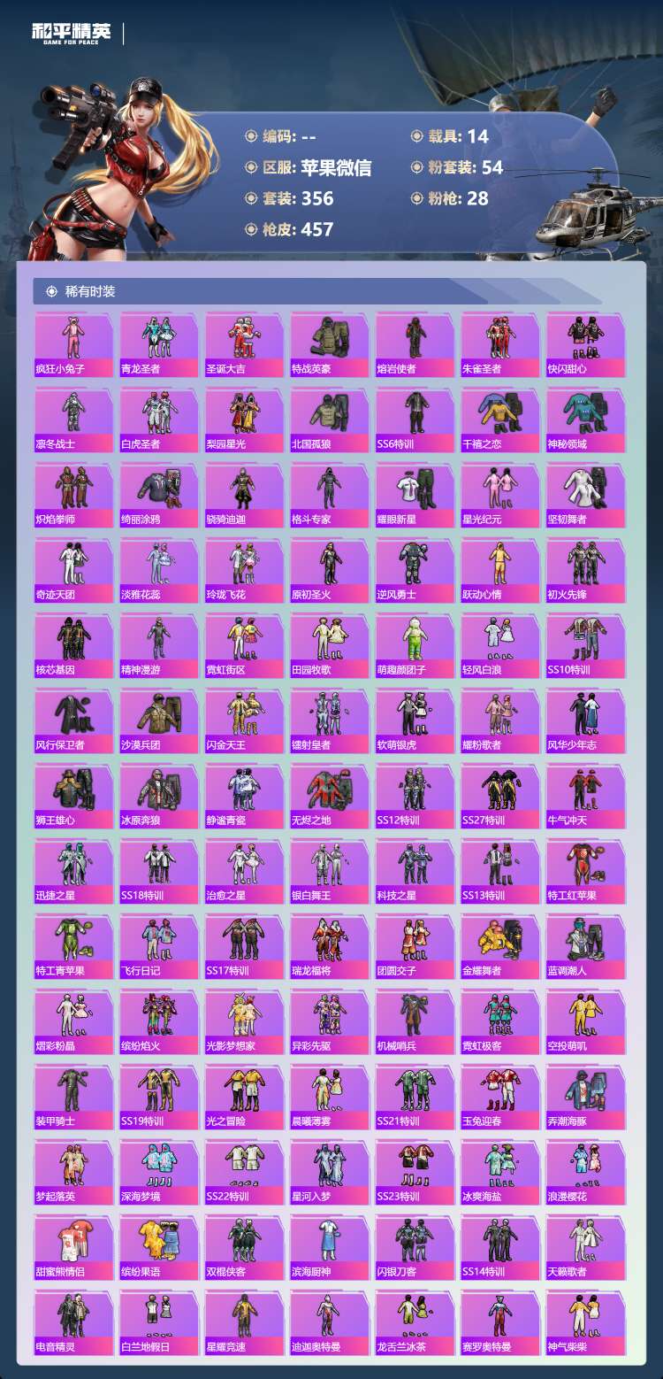 苹果v-22王牌印记-1红装-54粉装-28特效枪-14载具-215978热力值-356套装-45