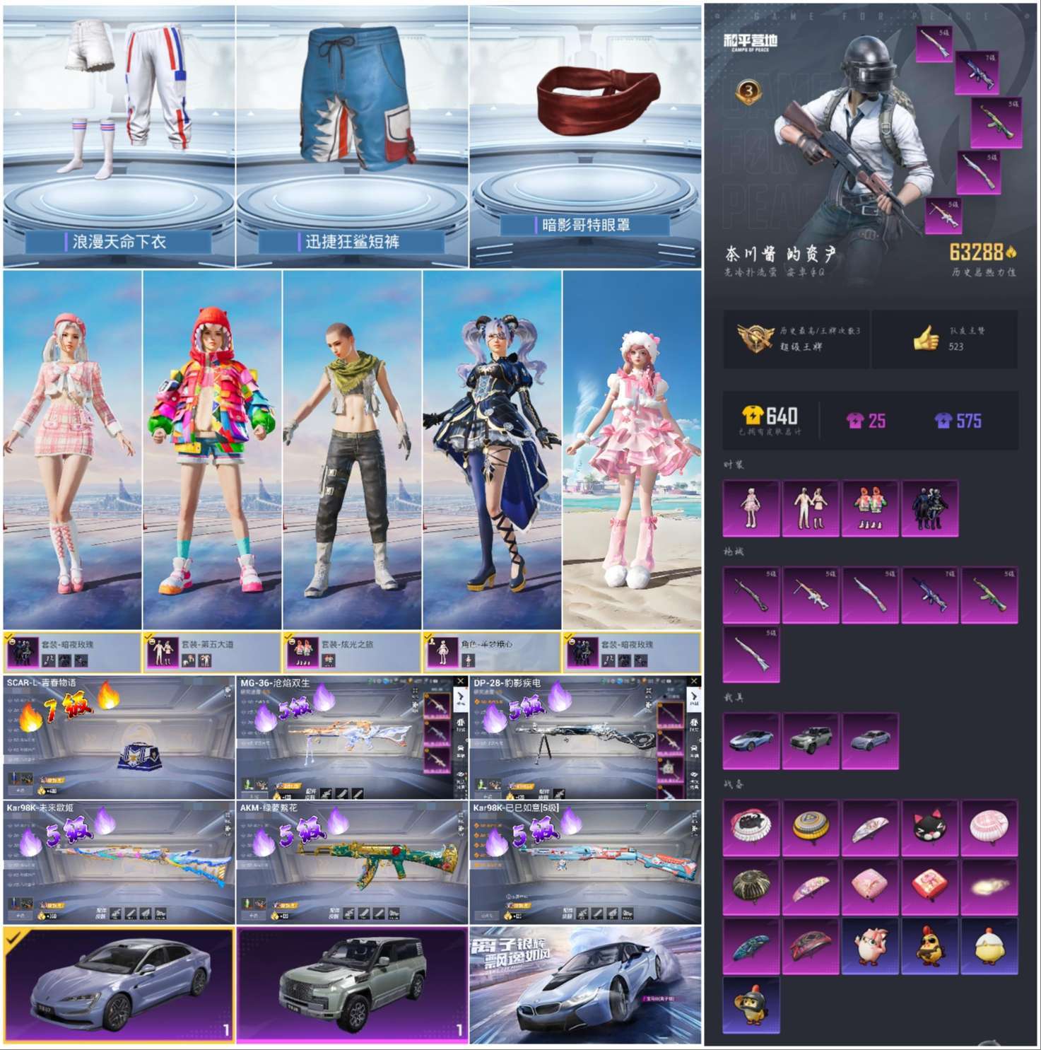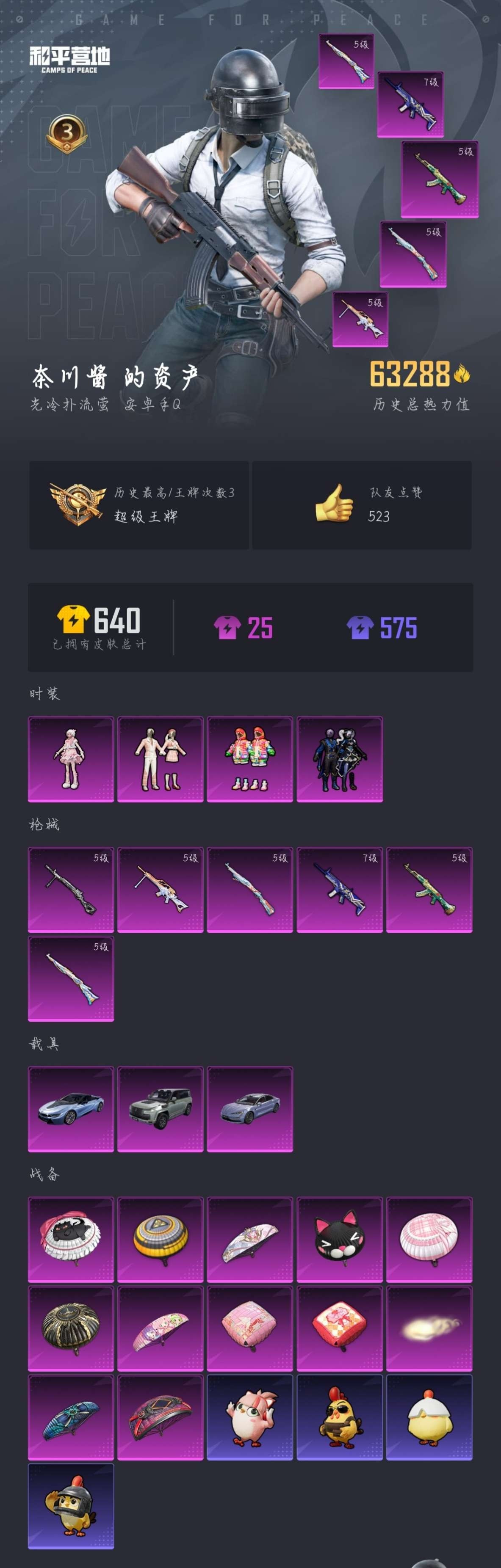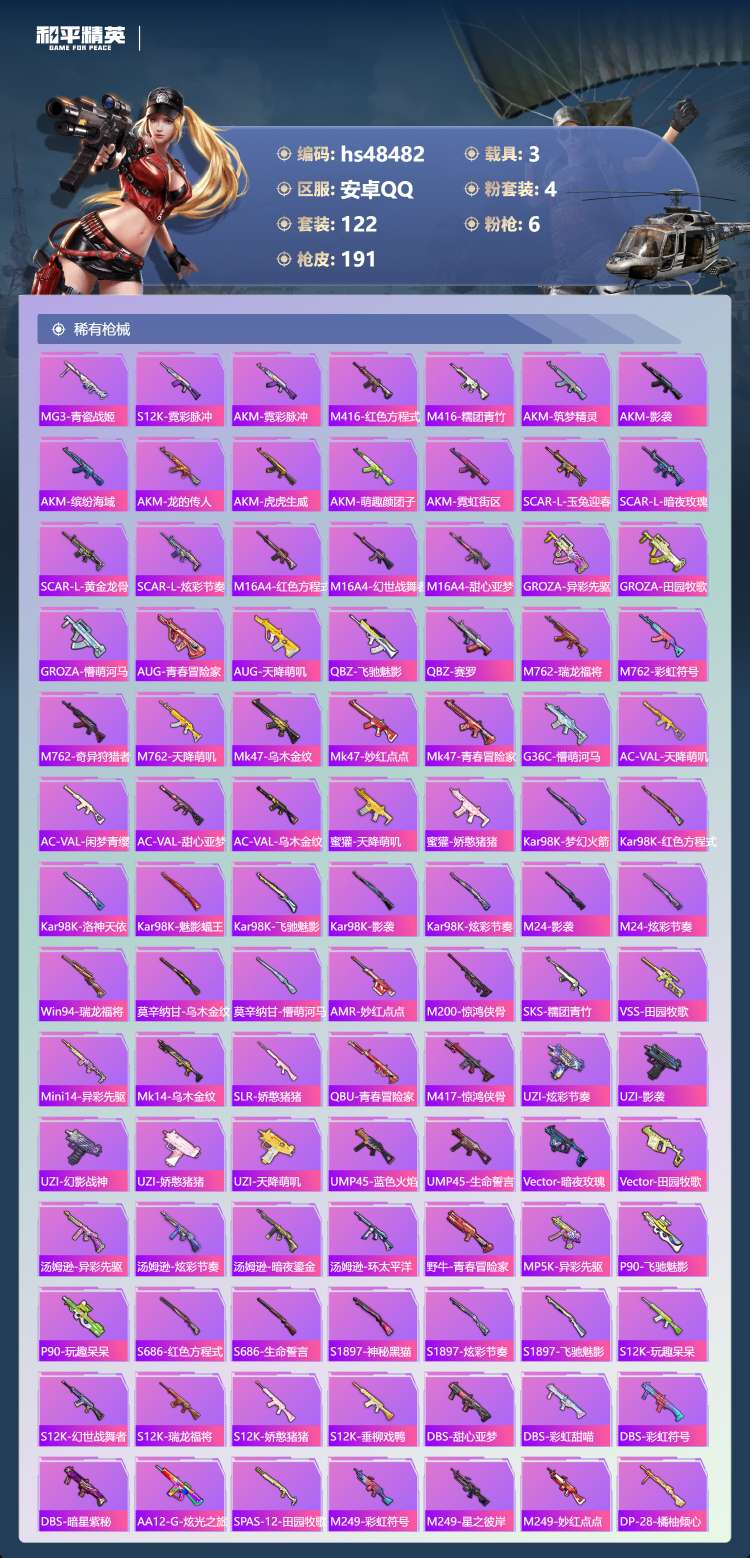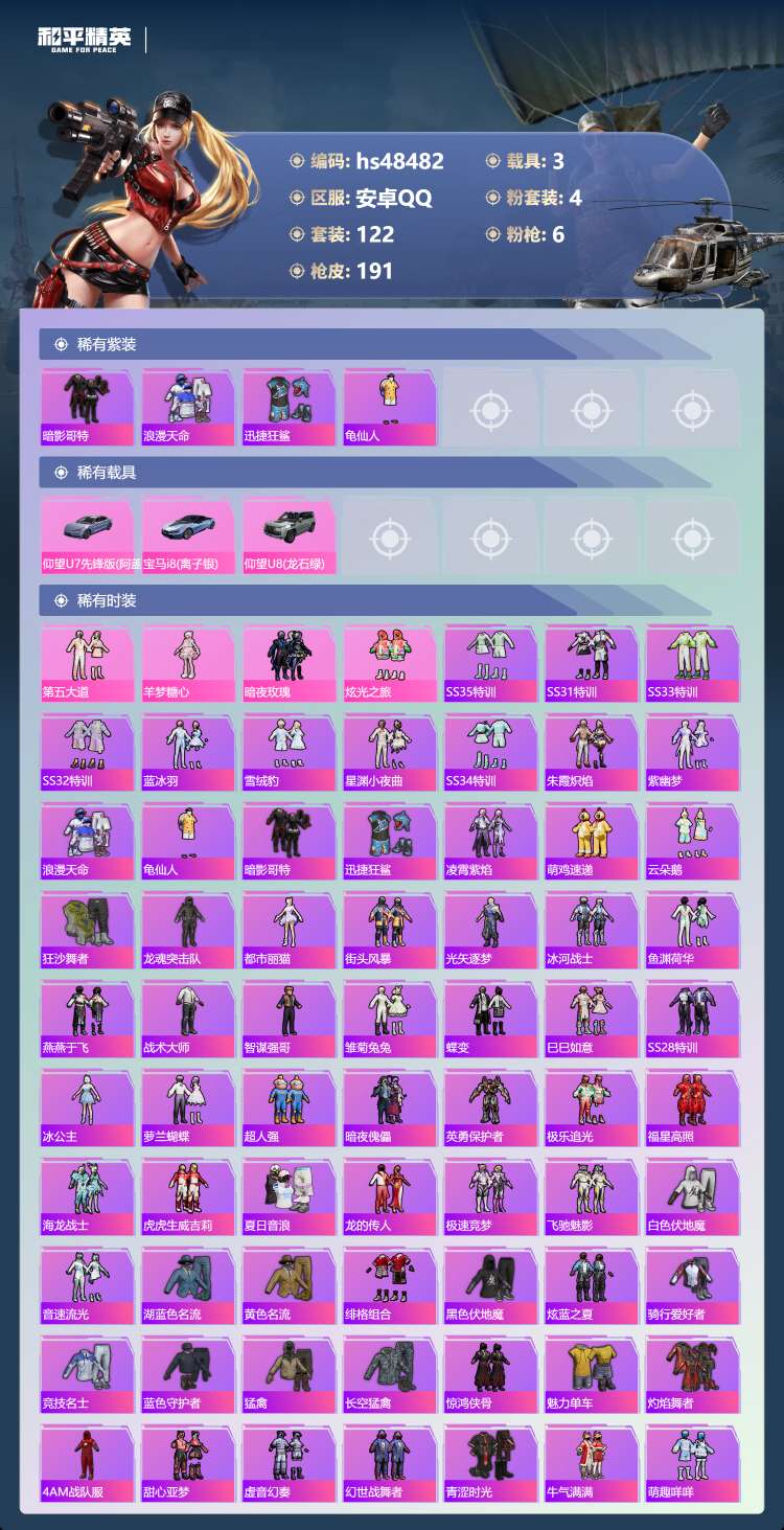 hs48482 安卓手Q-3王牌印记-4粉装-6特效枪-3载具-63288热力值-122套装-191