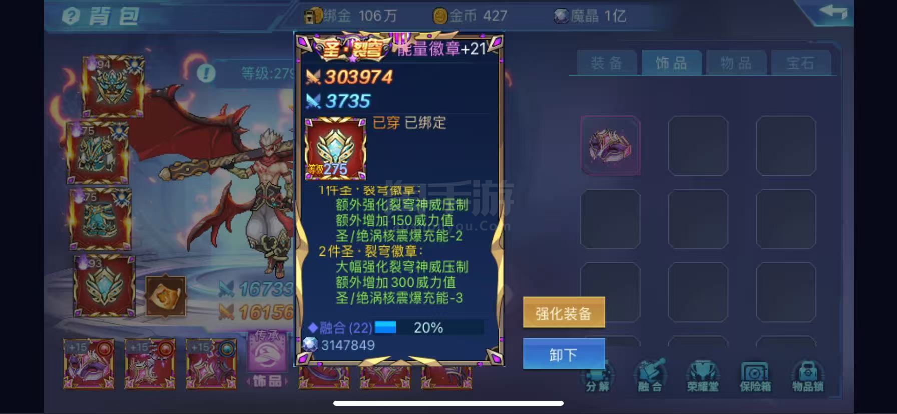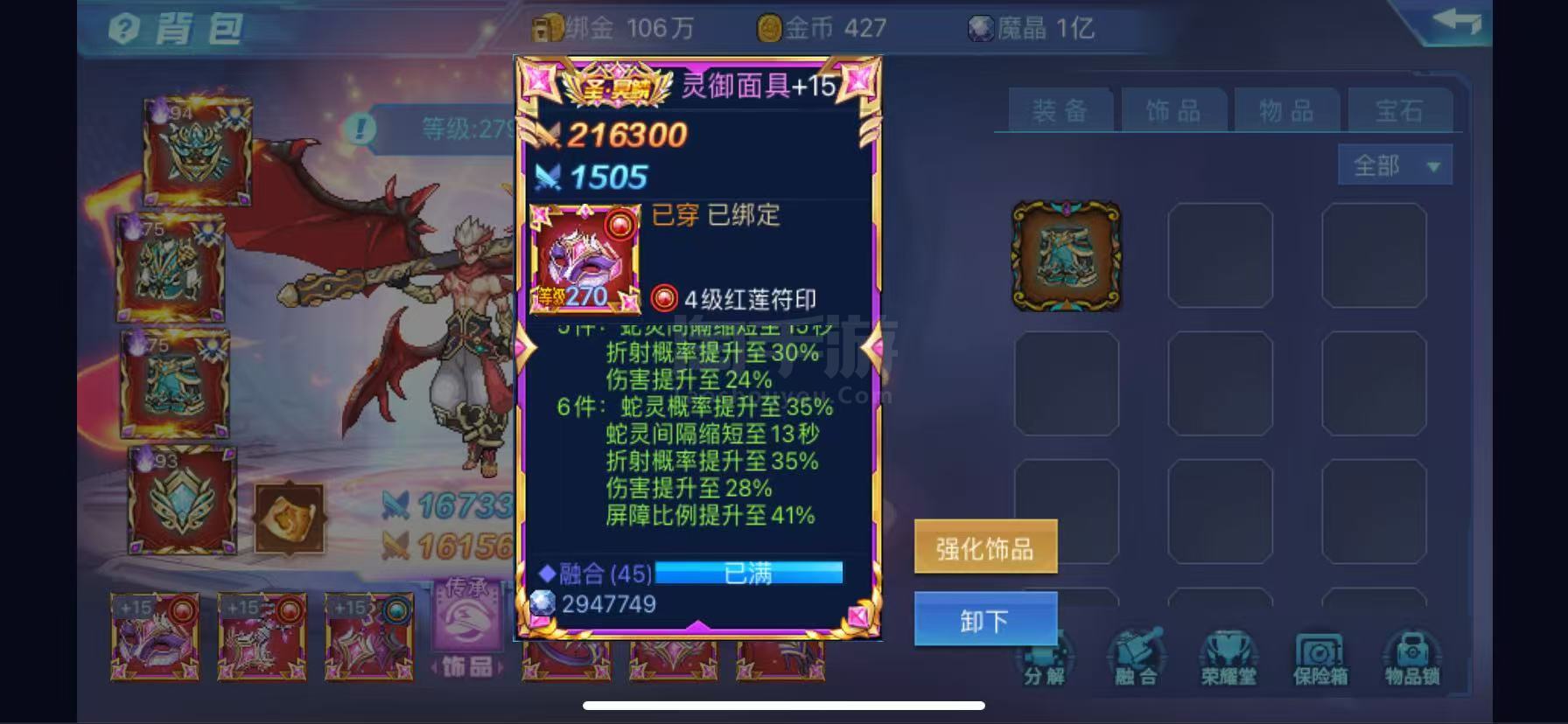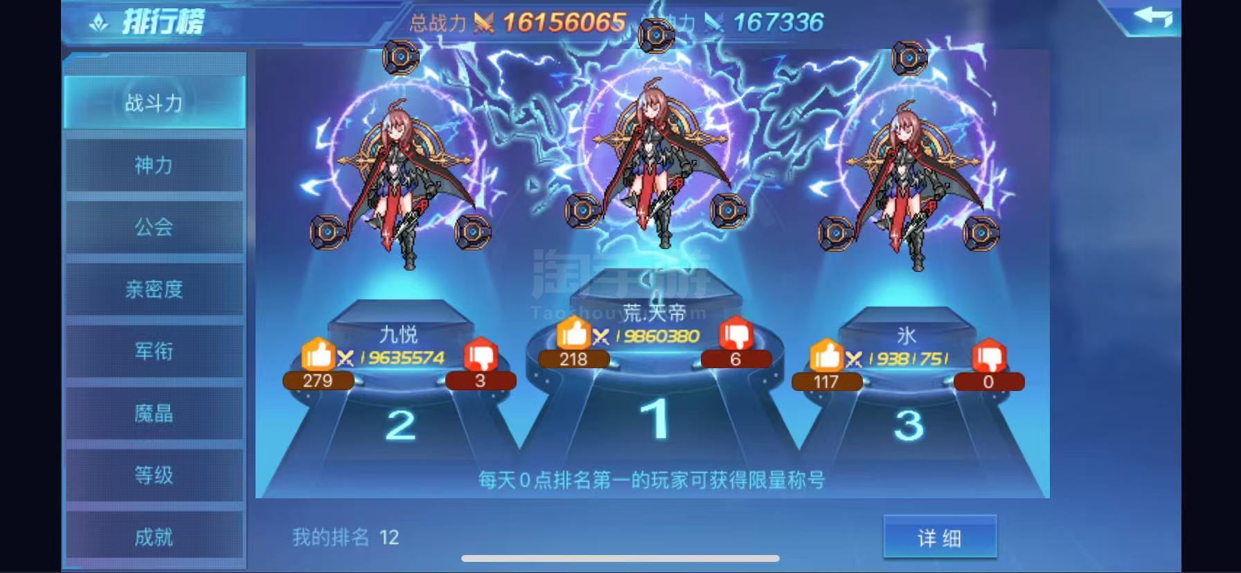 高力雷神全角色1610万战力战榜10多名,VIP39级,新角色和红武都有,5个满级光环,6个满级神话装置,饰品最新圣冥鳞六件套,装备圣裂穹八件套注灵650级,星月守护破防,星月对卡和全满魔核,两个宝宝,基本该有的都有了,上手即爽玩