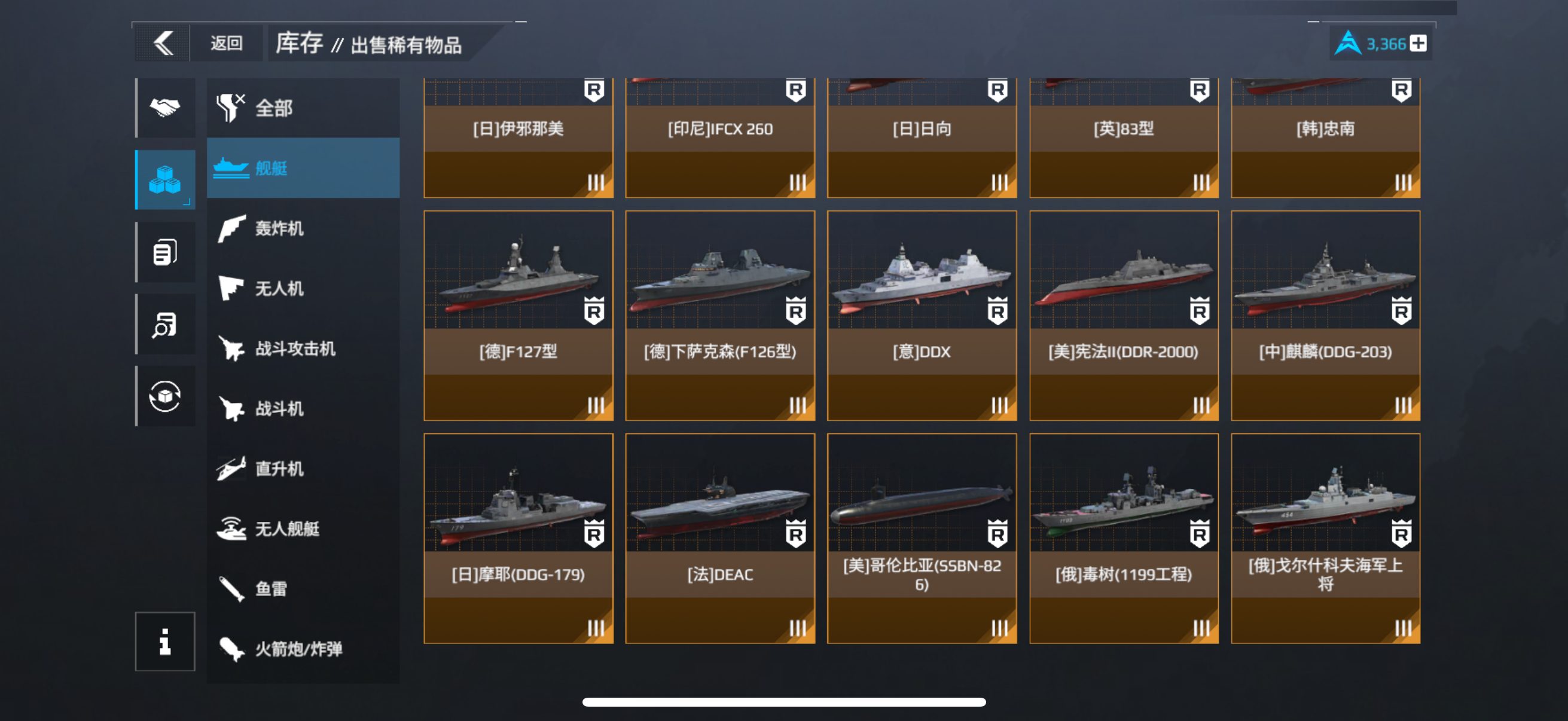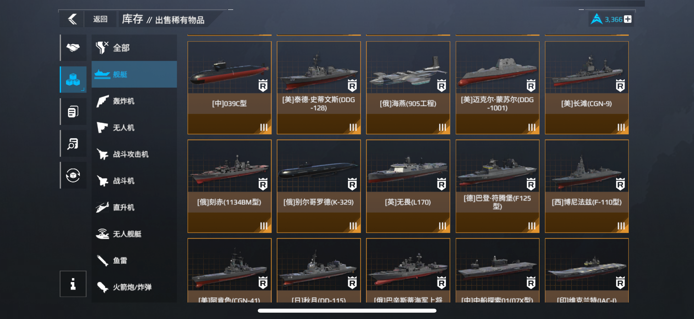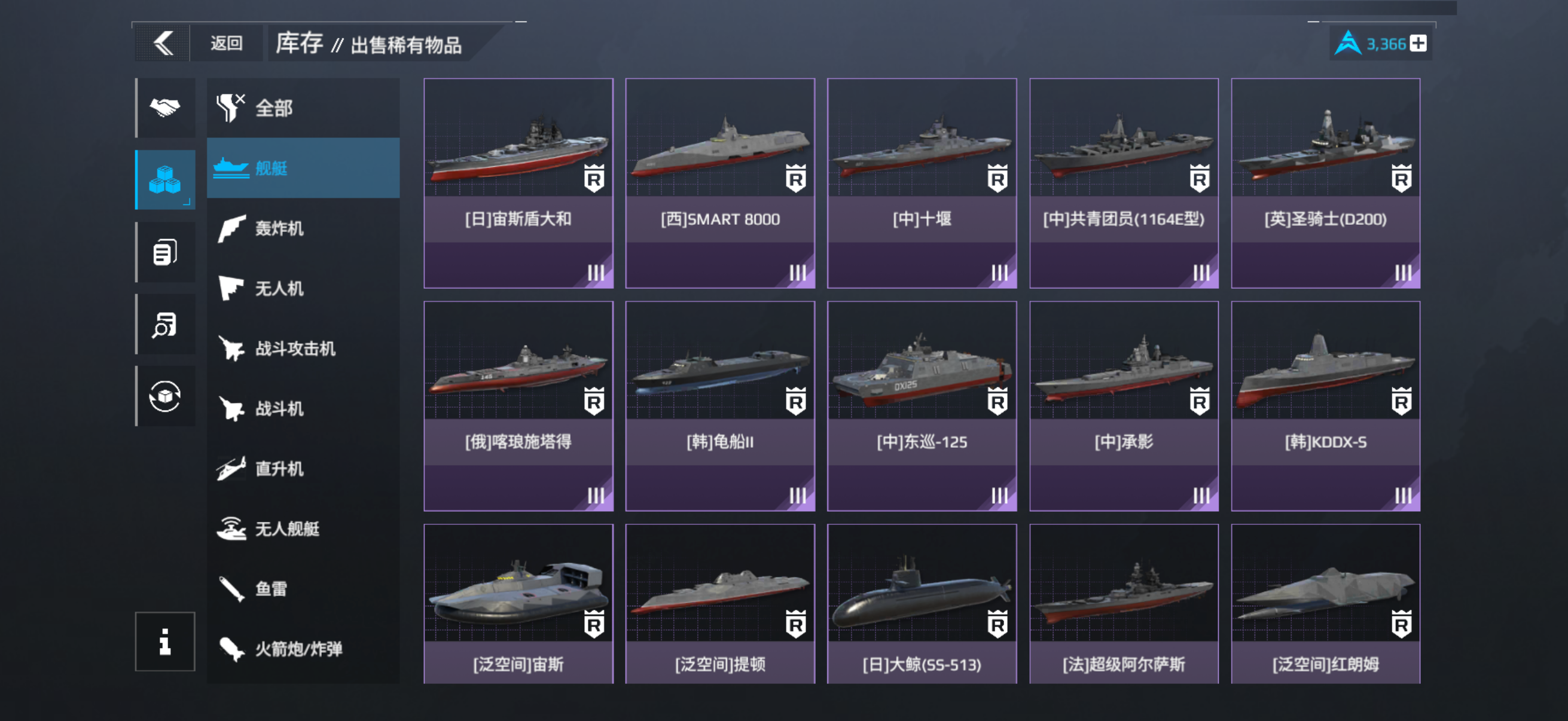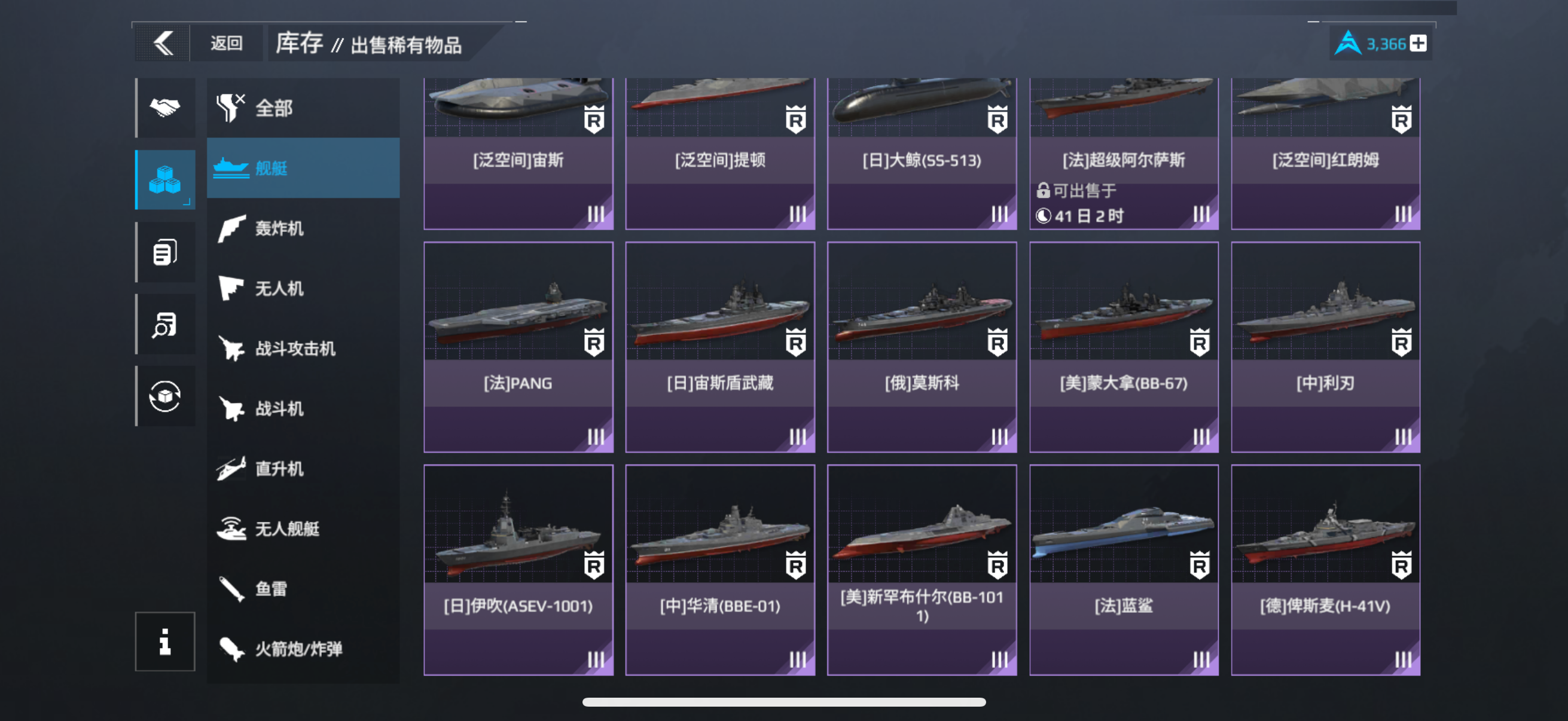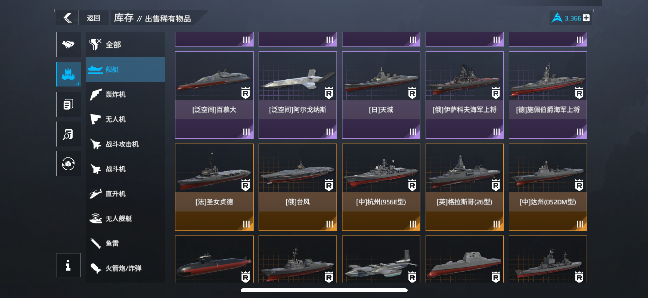 自己看截图吧,一共只有3艘船没有,这号所有顶级装备都有,甚至有很多的储备
