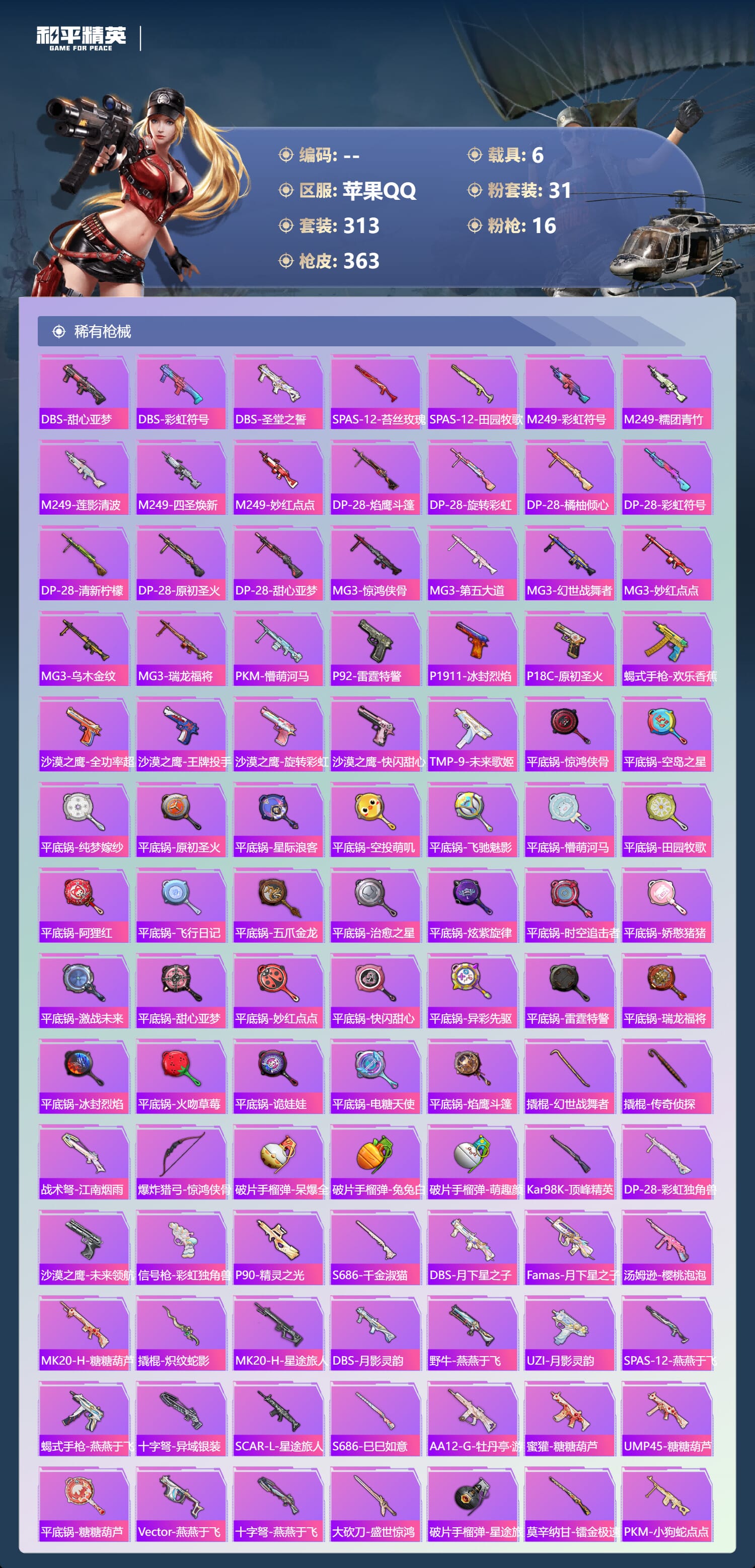 a4084/苹果QQ/-23王牌印记-1红装-31粉装-16特效枪-6载具-150789热力值-31