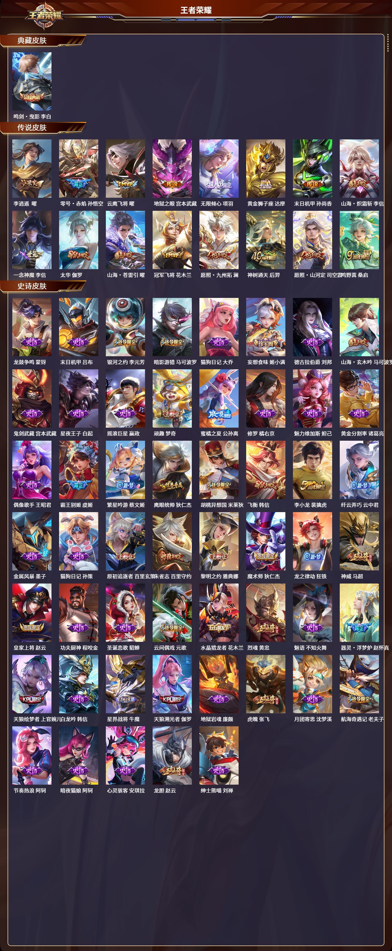 苹果v/至尊星耀/201皮肤/126英雄/1典藏/0珍品无双/0无双/0珍品传说/16传说/59史