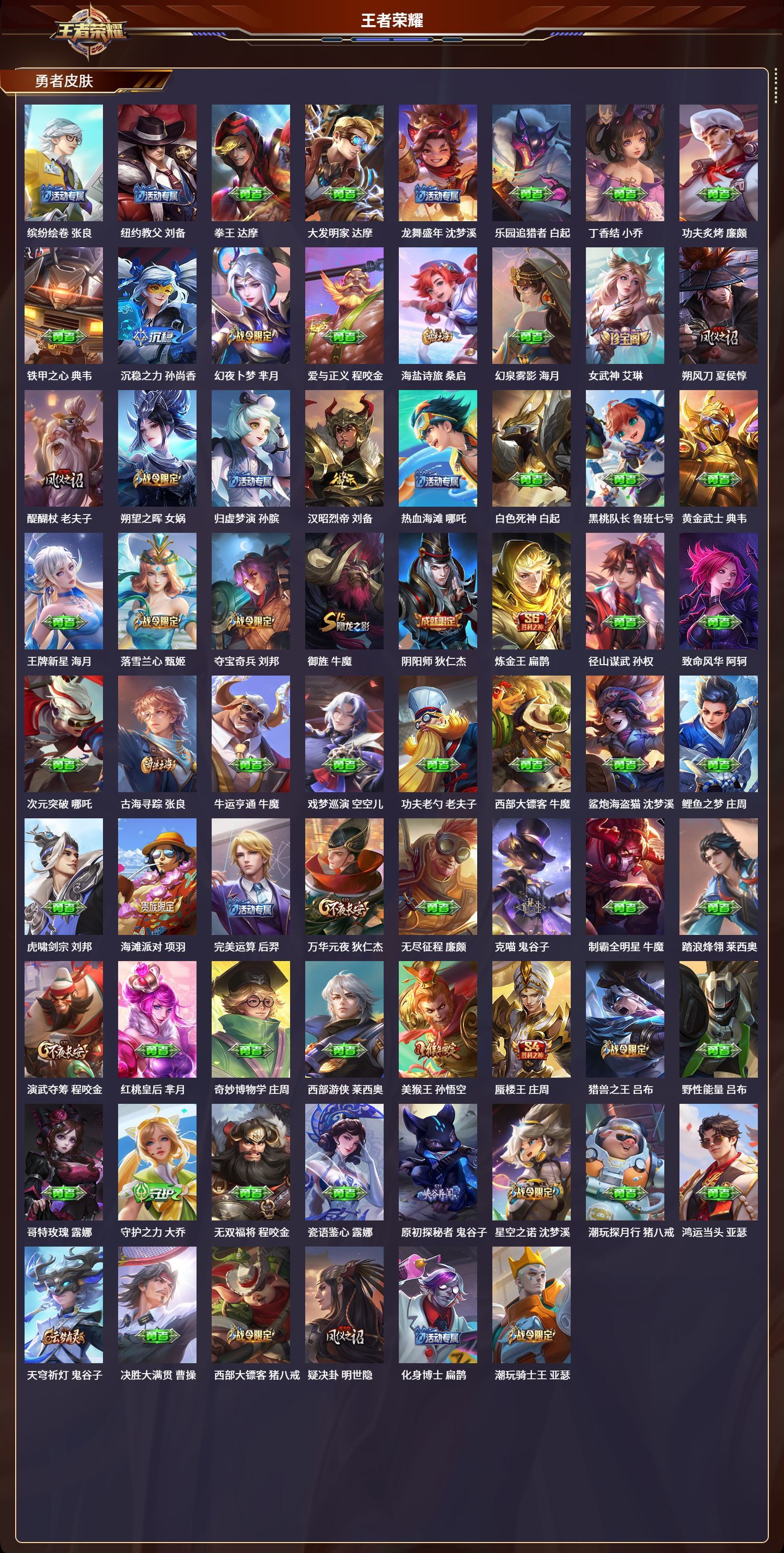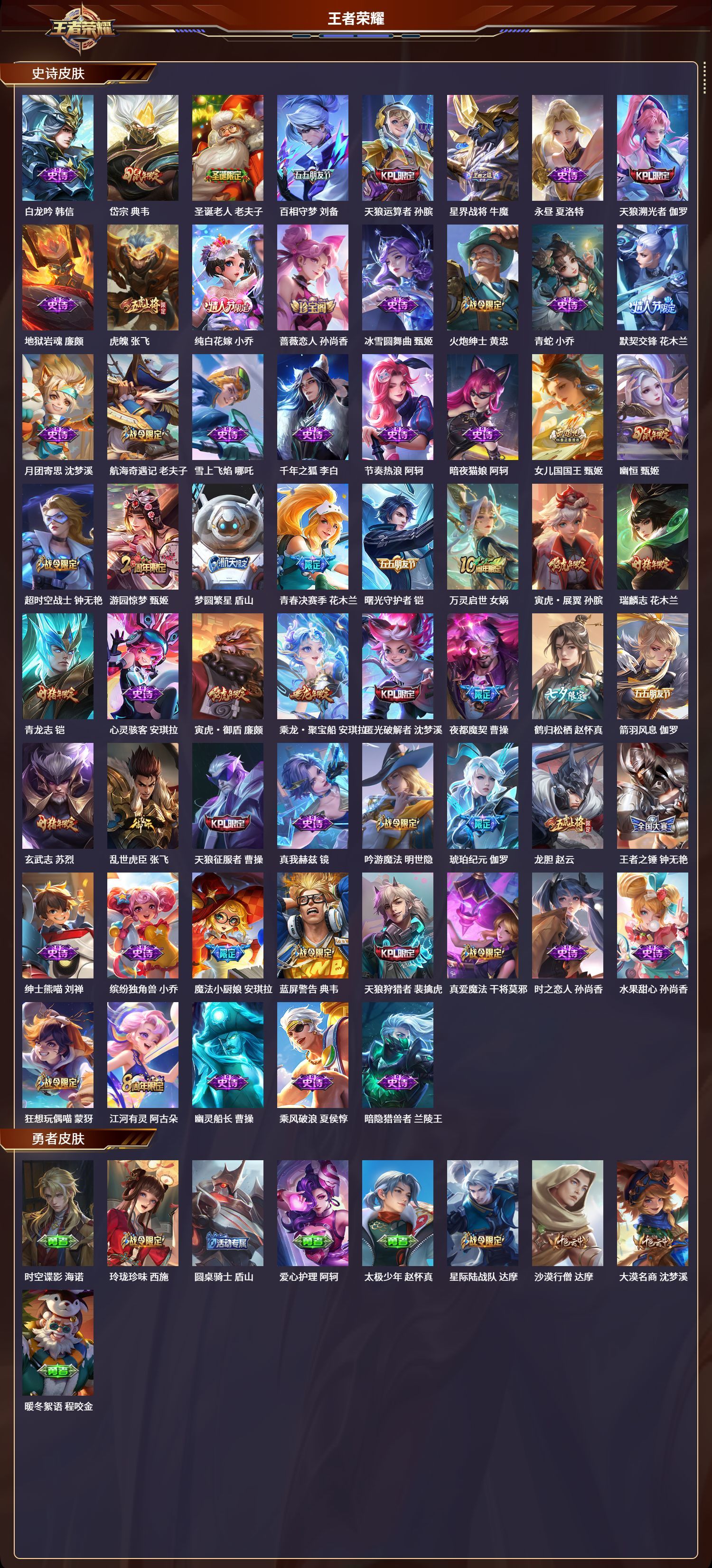 安卓QQ/至圣王者/604皮肤/128英雄/13典藏/0珍品无双/5无双/0珍品传说/105传说/2
