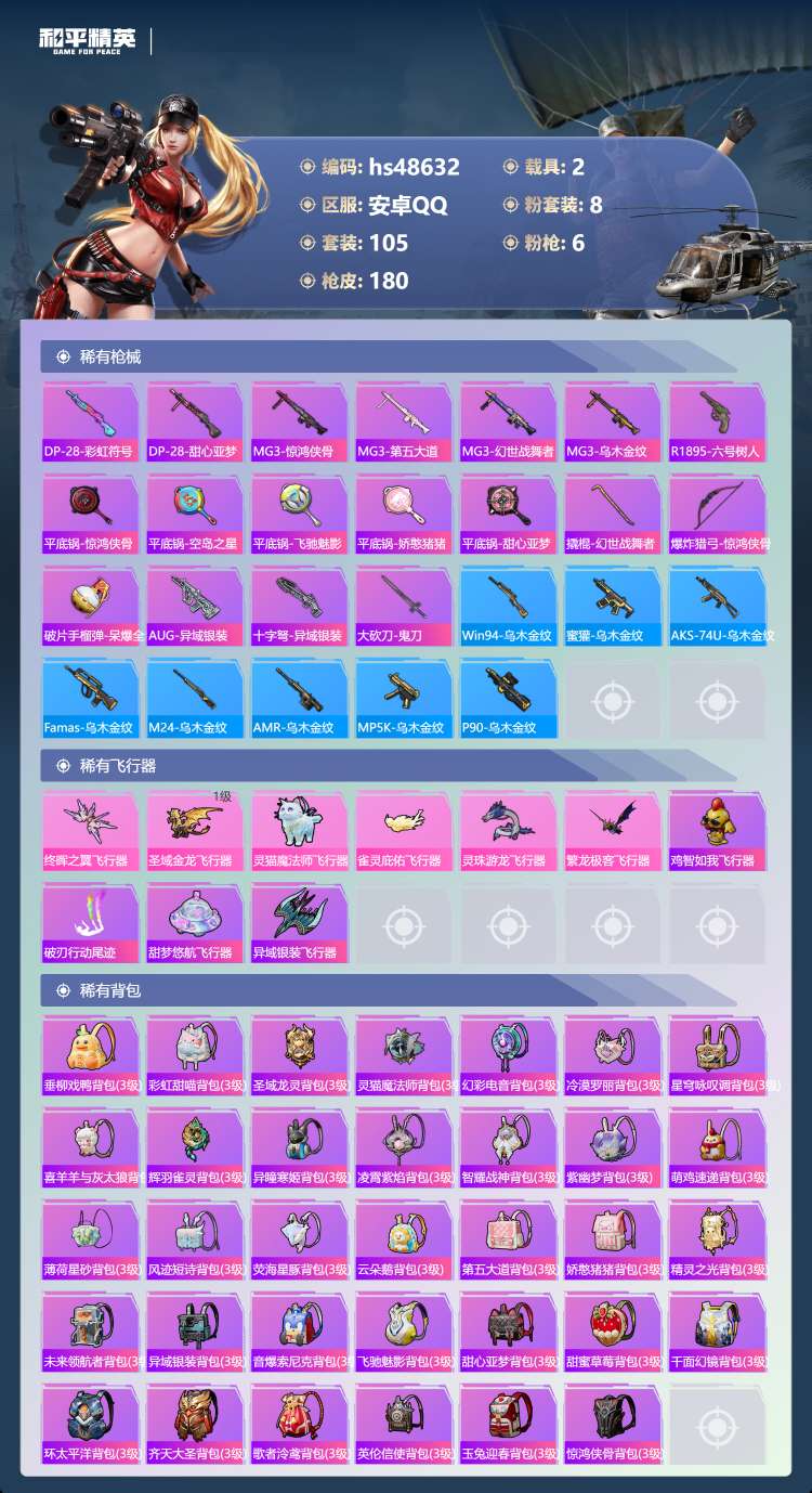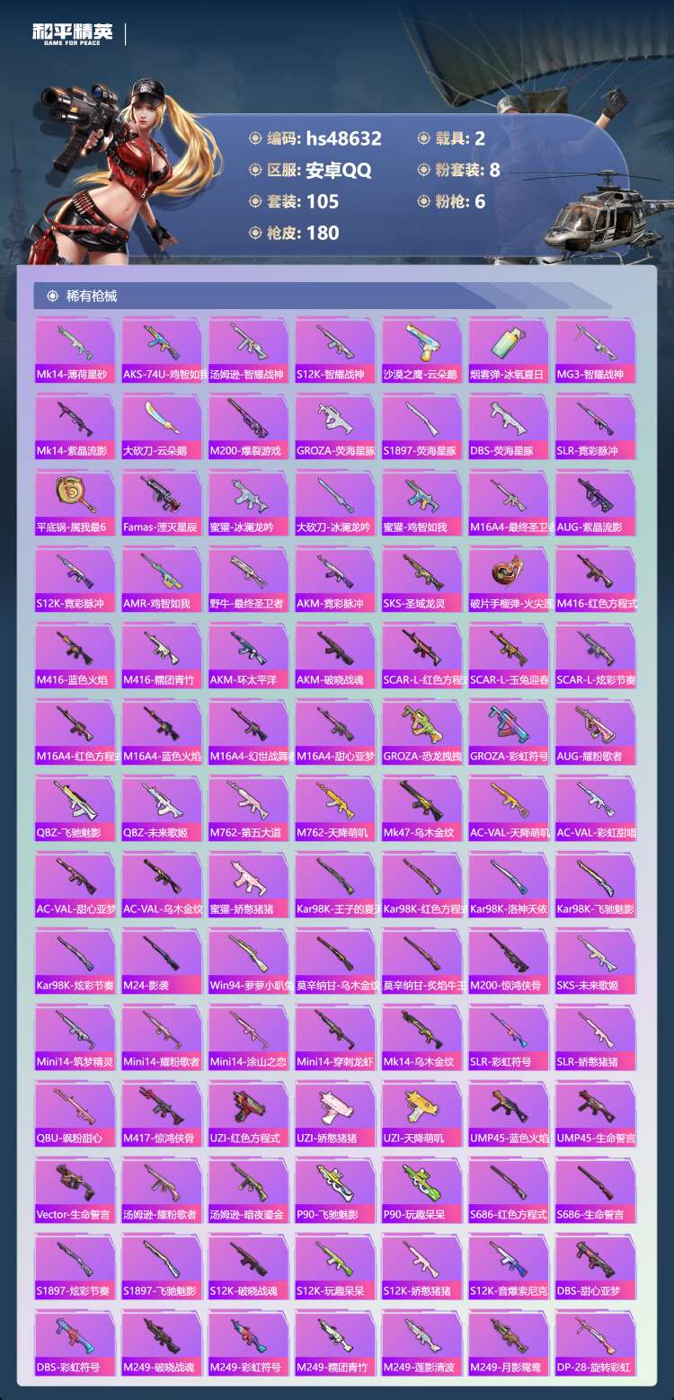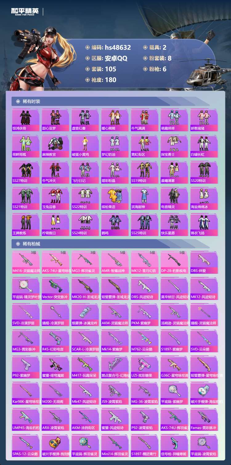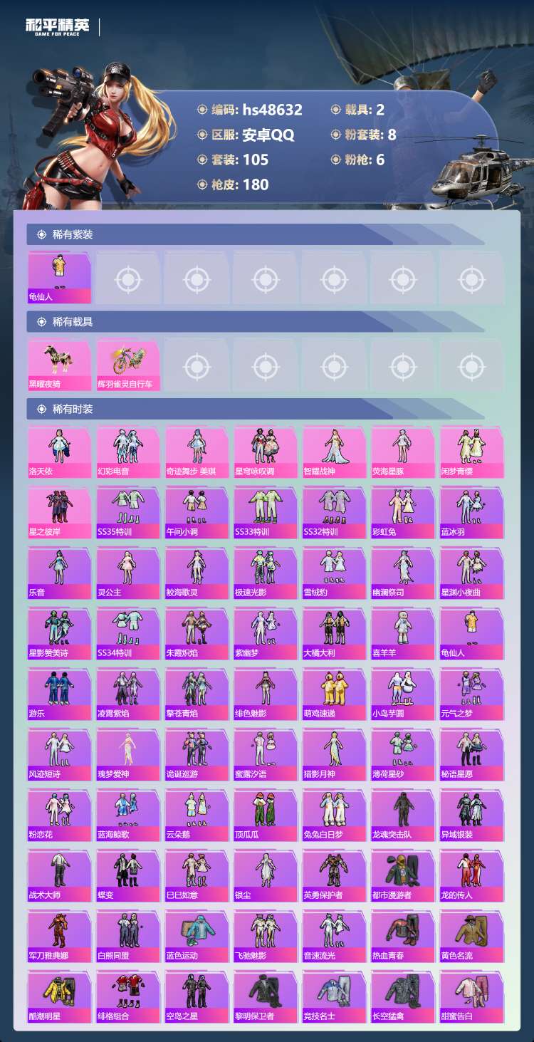 hs48632 安卓手Q-3王牌印记-8粉装-6特效枪-2载具-56704热力值-105套装-180