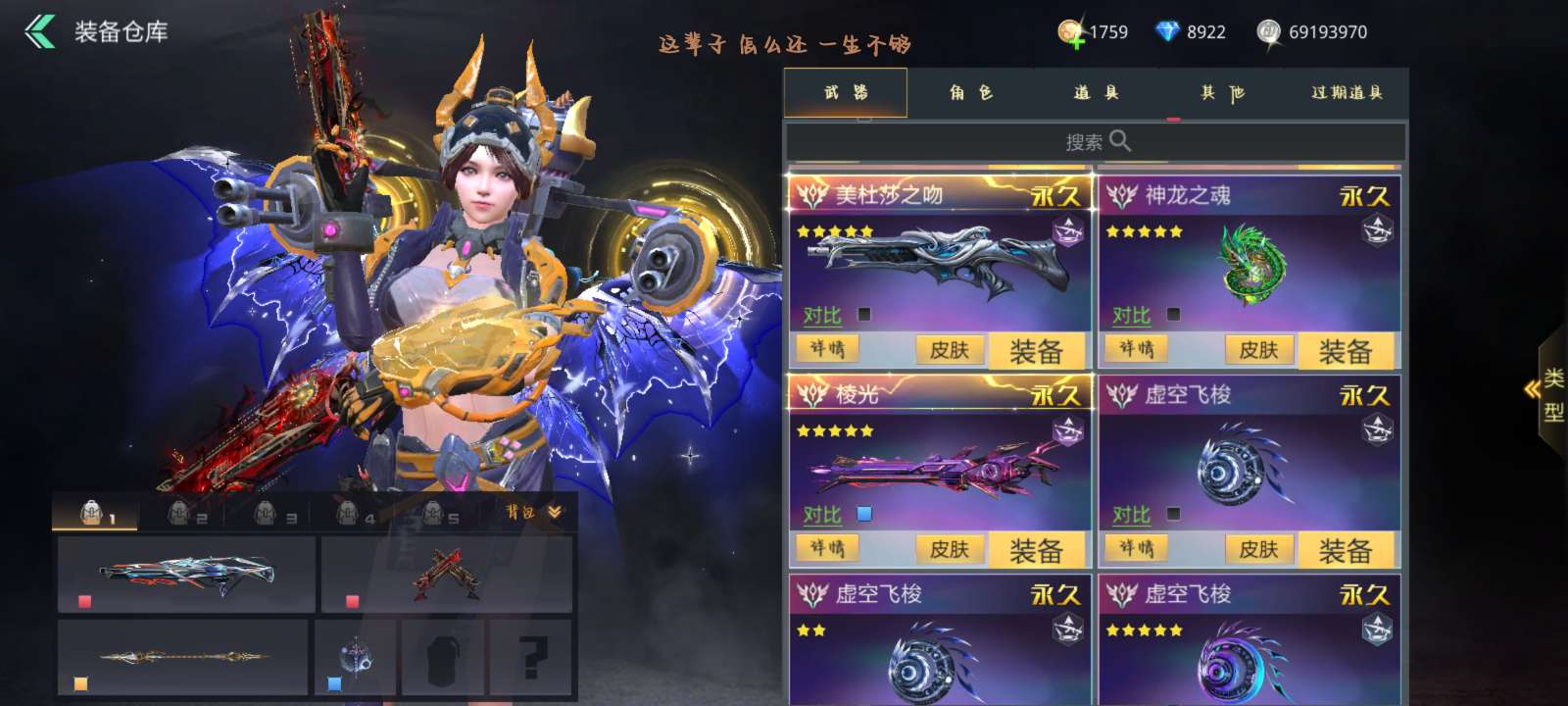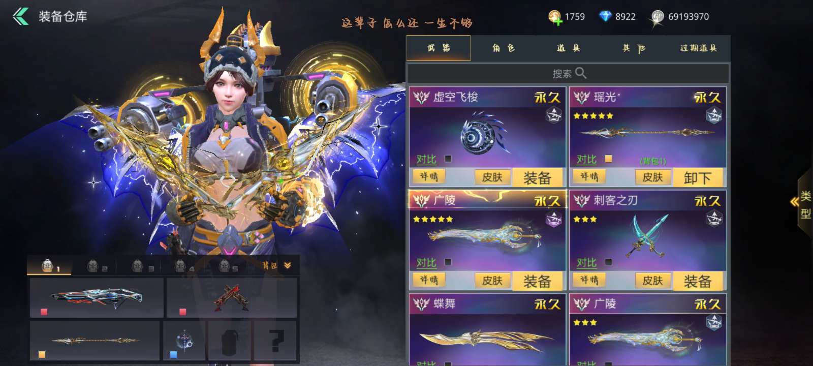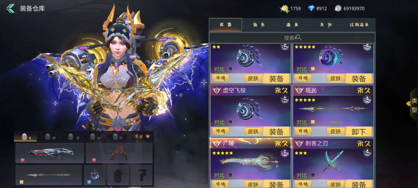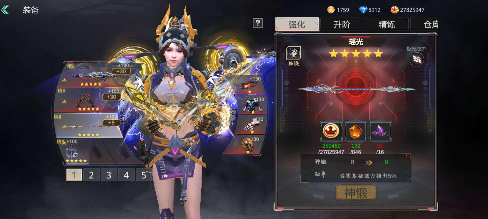 满觉万象电音棱光美杜莎广陵天际等等,全是极品娱乐武器,战力512w高战,瑶光五星一觉满强化精炼
