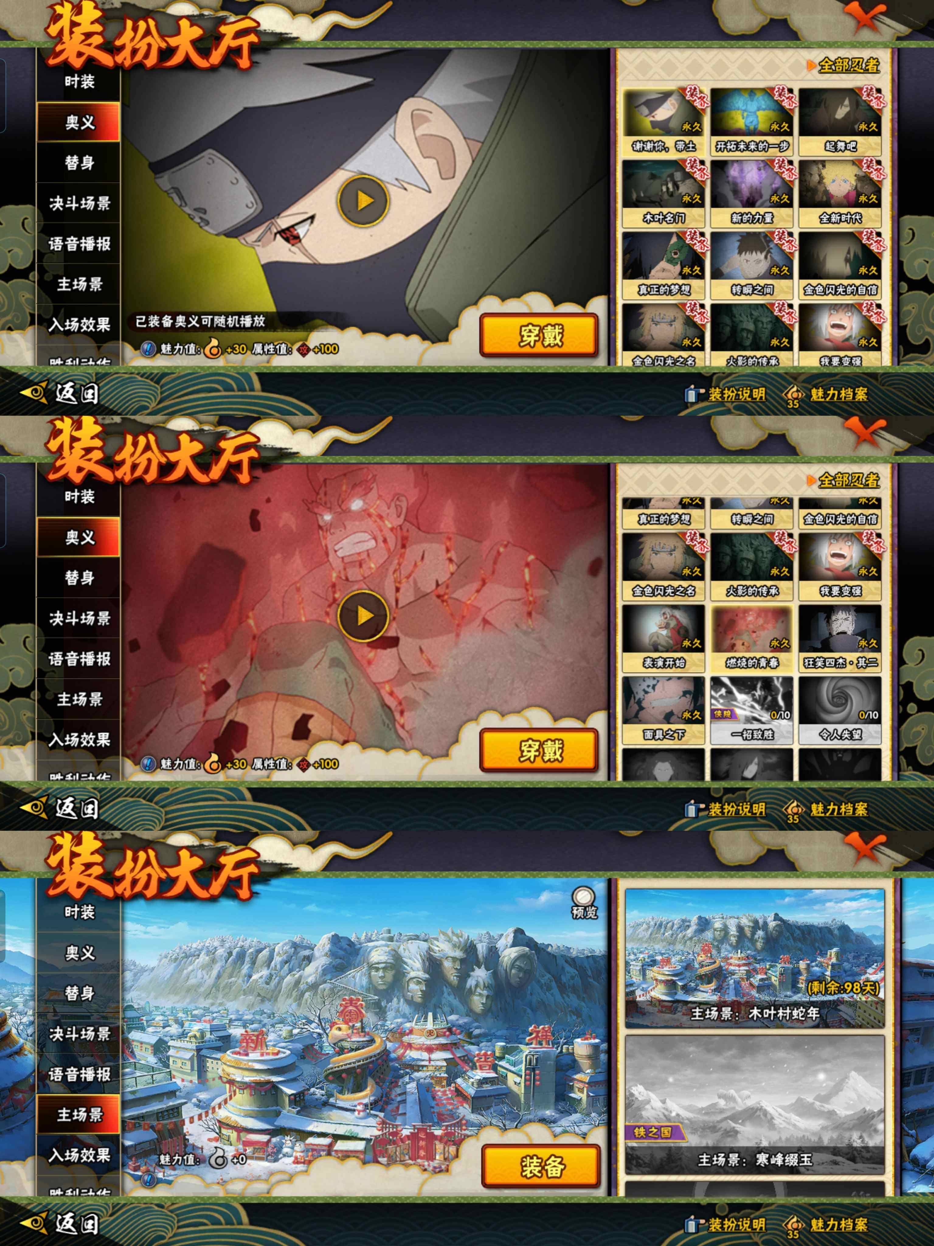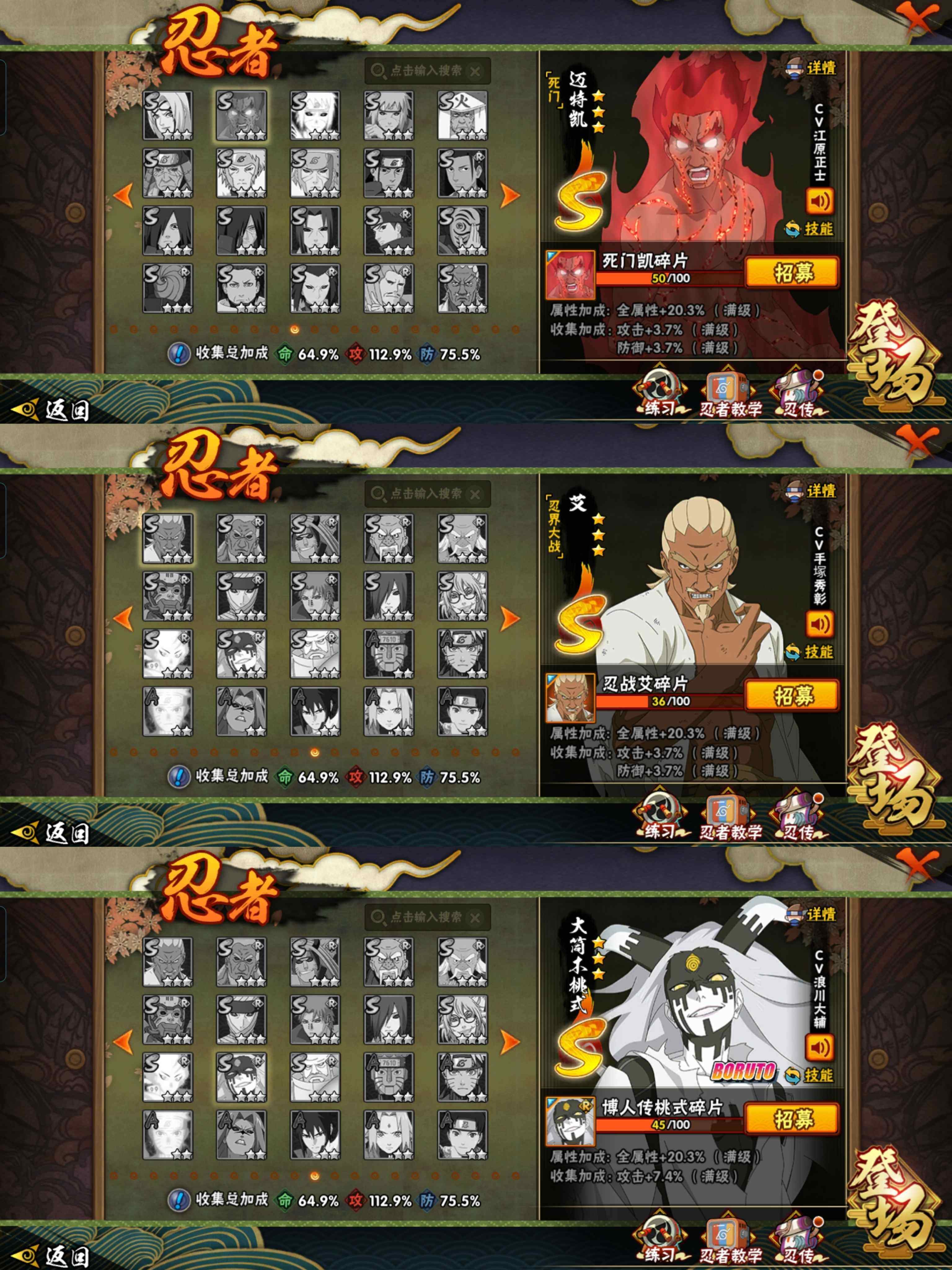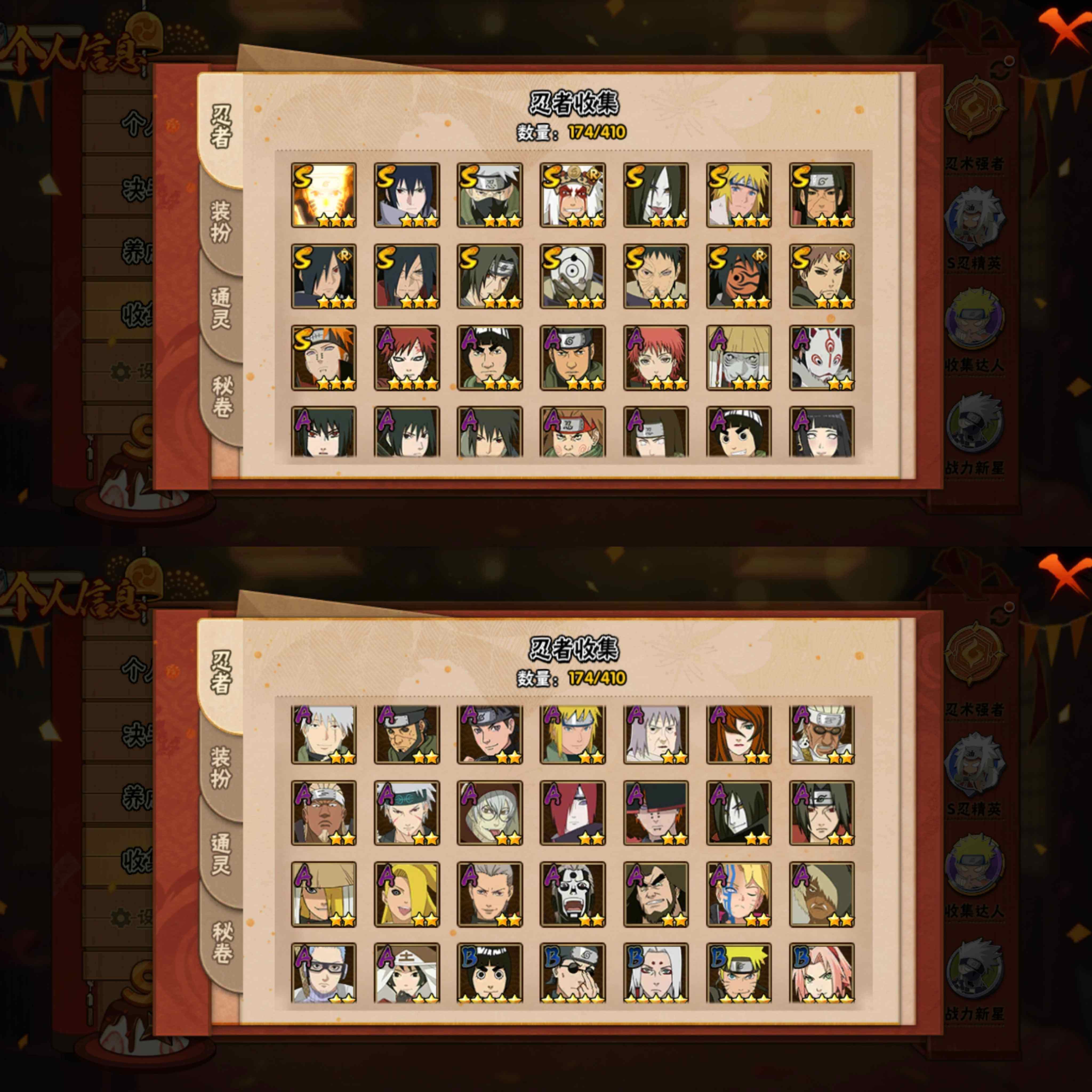t78,757万战,15s忍36a忍,漂泊六道万花筒佐助须佐卡卡西秽土柱间木叶斑秽土解斑须佐鼬罗砂忍者之路面麻秽土阿斯玛半蛇斗篷兜迪达拉,漩涡鸣人「九喇嘛连结」(3星),宇智波斑「木叶创立」(3星),佩恩「天道」(3星),宇智波佐助「永恒万花筒」(3星),宇智波斑「秽土转生·解」(3星),旗木卡卡西「须佐能乎」(3星),宇智波鼬「须佐能乎」(3星),自来也「舞之豪杰」(3星),宇智波带土「忍界大