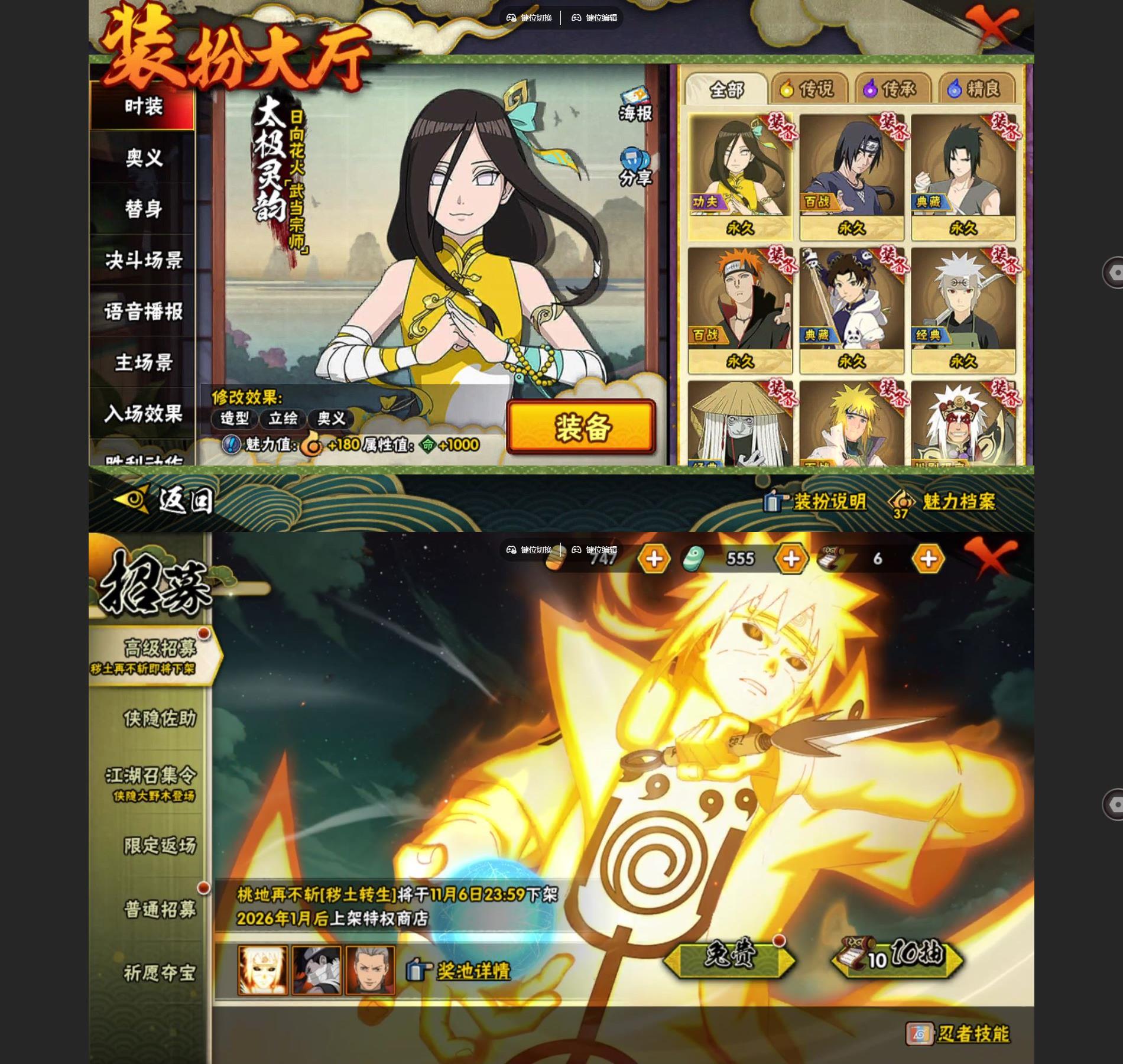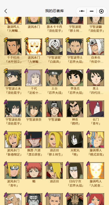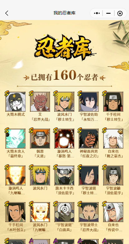 【S忍者】宇智波止水「须佐能乎」,艾「忍界大战」,大筒木桃式,宇智波斑「秽土转生·解」,千手柱间「木叶创立」,宇智波佐助「永恒万花筒」,神秘面具男「红夜之刃」,漩涡鸣人「九喇嘛连结」,宇智波带土「忍界大战」,千手柱间「秽土转生」,自来也「舞之豪杰」,旗木卡卡西「须佐能乎」,大筒木舍人「最终章」,自来也「传说中的三忍」,漩