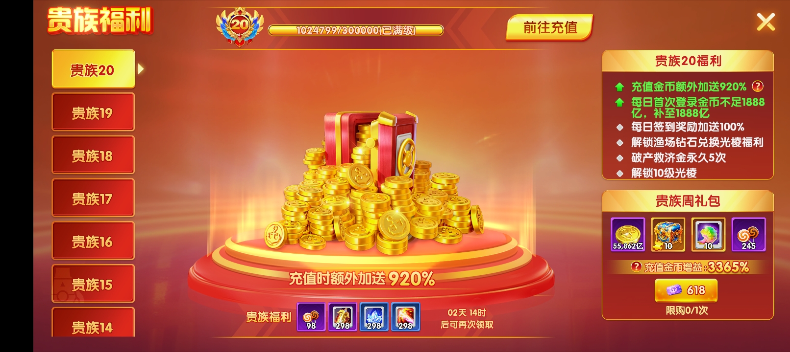 乐乐捕鱼【安卓官方】乐乐捕鱼极品V20充值1百多万,还有好多东西就不截图了,月卡够用一辈子,充值加成3365