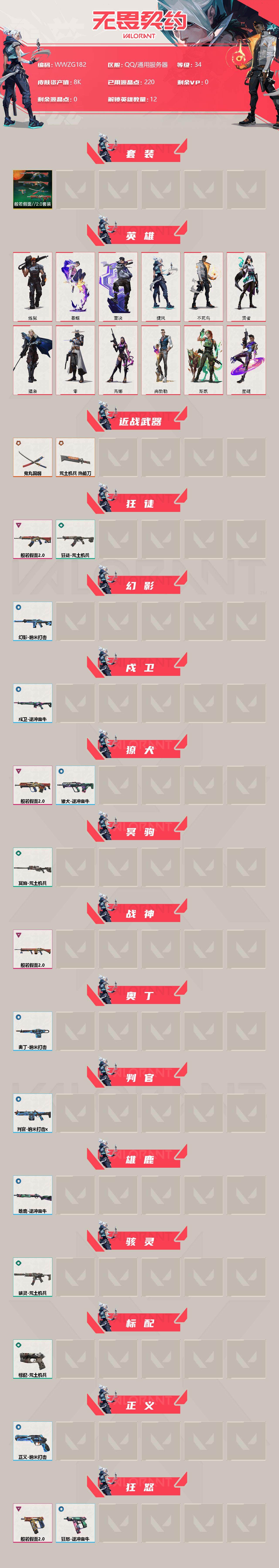 【WWZG182】终极*2/卓越*4/皮肤*18/等级*34/段位:未定级/般若假面//2.0套装/炼狱/暮蝶/壹决/捷风/不死鸟/贤者/猎枭/零/芮娜/尚勃勒/斯凯/星礈/近战武器-鬼丸国纲/近战武器-荒土机兵 热能刀/狂徒-般若假面//2.0/狂徒-荒土机兵/幻影-纳米打击/戍卫-逆冲蛮牛/獠犬-般若假面//2.0/獠犬-逆冲蛮牛/冥驹-荒土机兵/战神-般若假面//2.0/奥丁-纳米打击/判官-纳米打击x/雄鹿-逆冲蛮牛/骇灵-荒土机兵/标配-荒土机兵/正义-纳米打击/狂怒-般若假面//2.