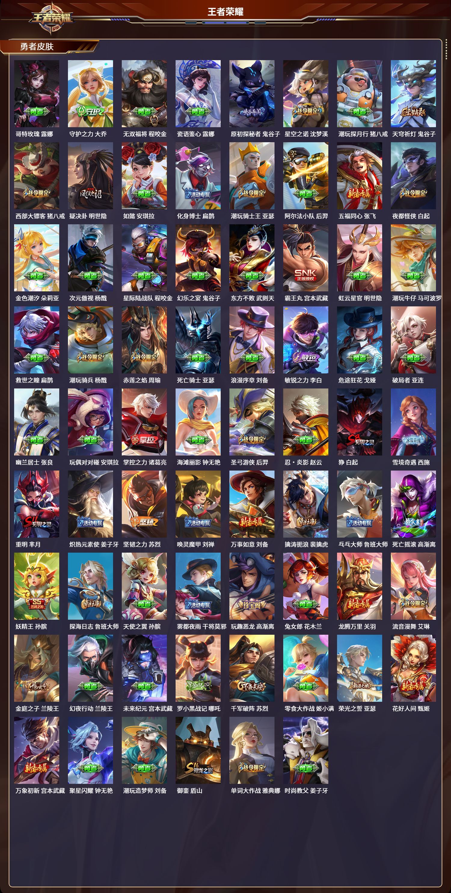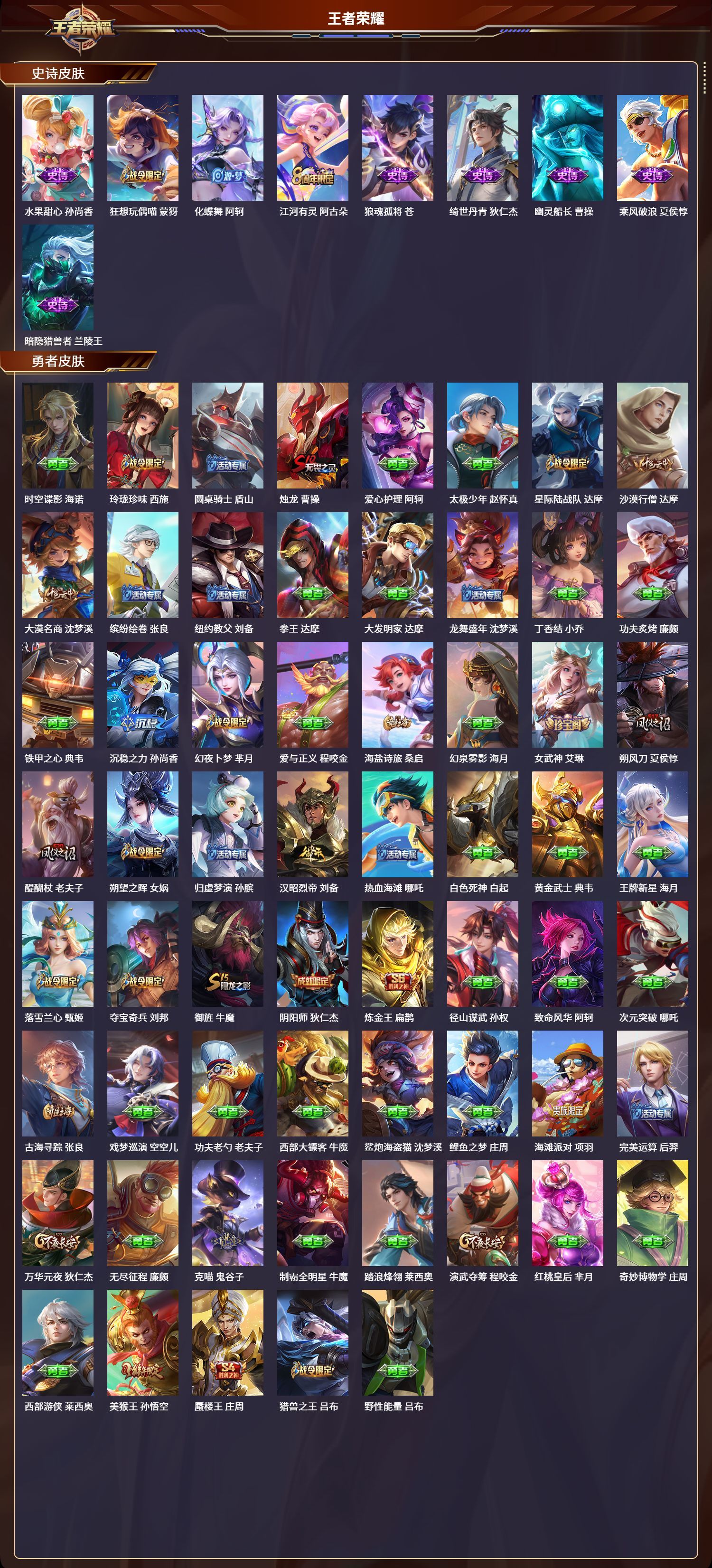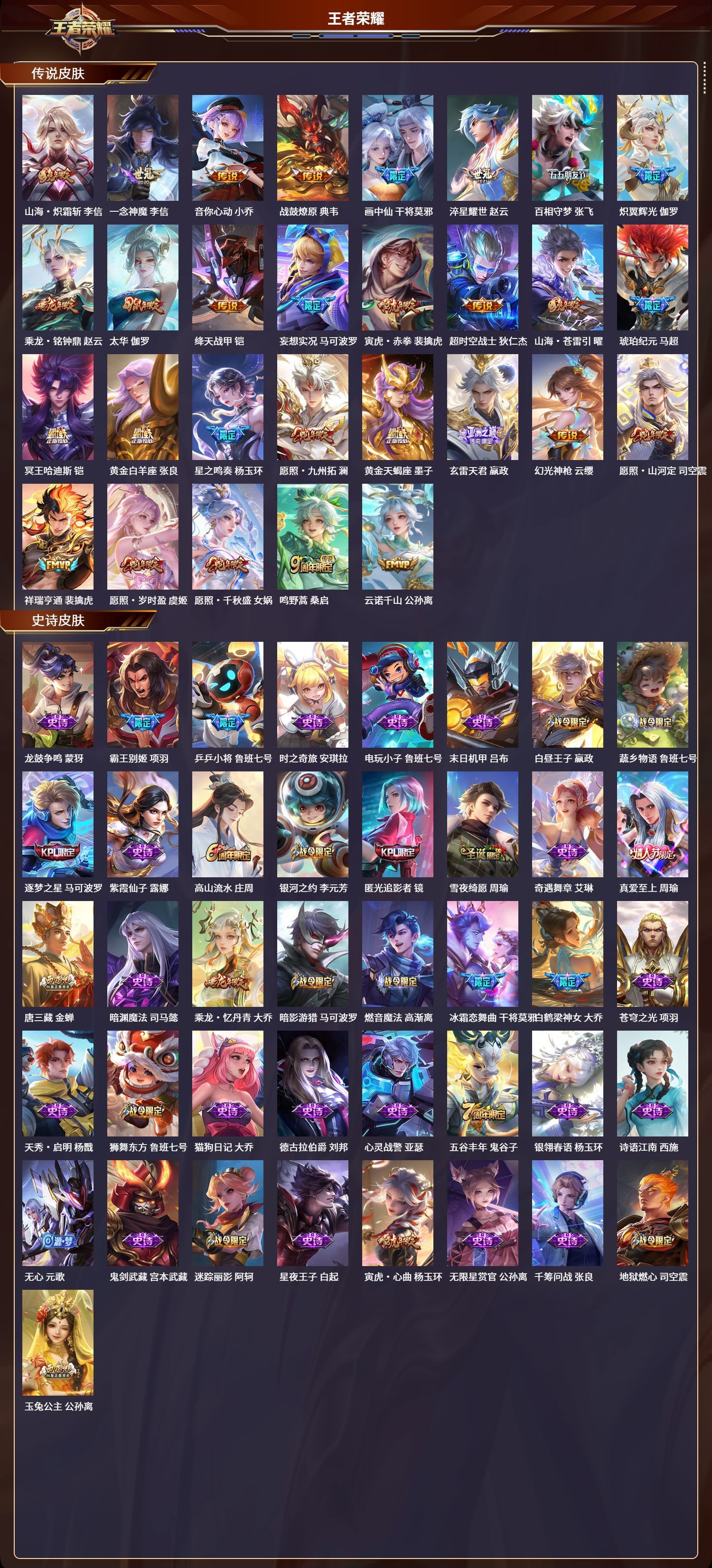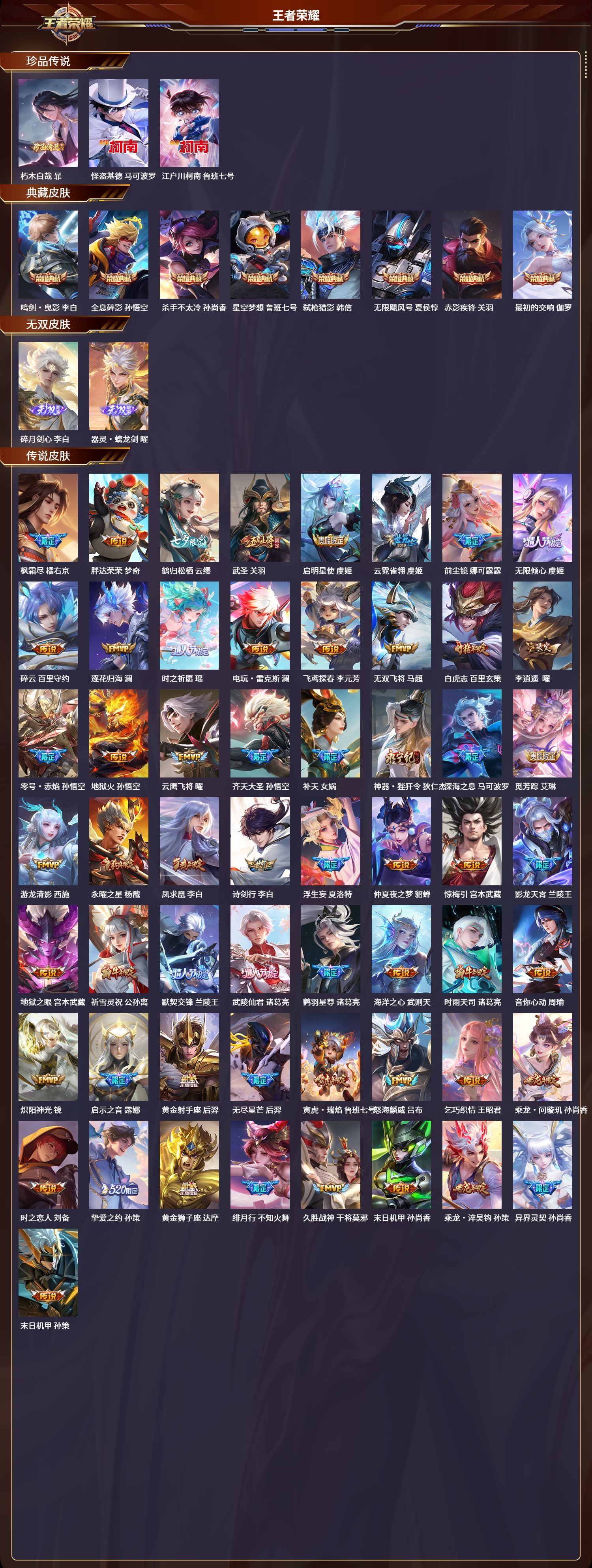 苹果QQ/最强王者/569皮肤/128英雄/8典藏/0珍品无双/2无双/3珍品传说/86传说/190