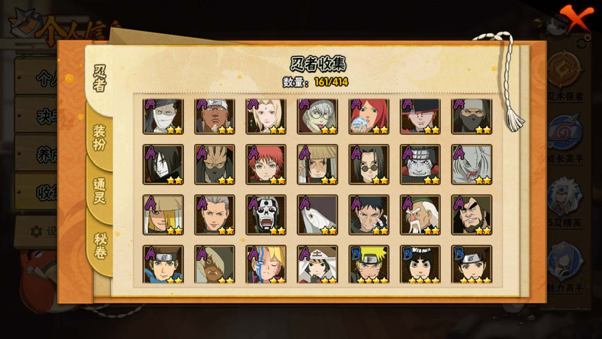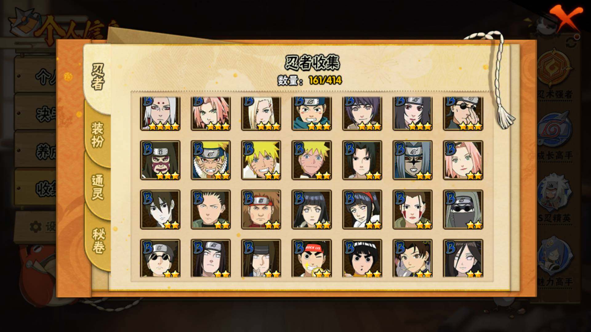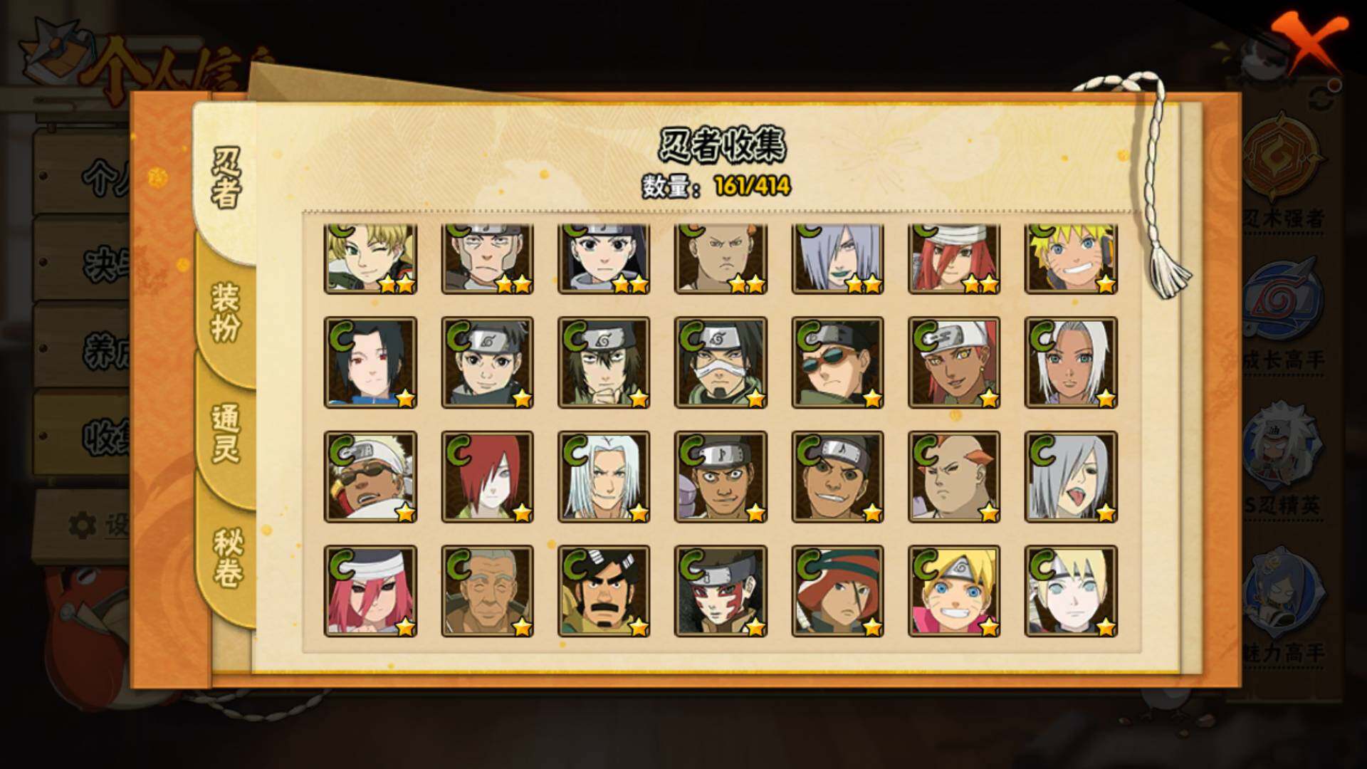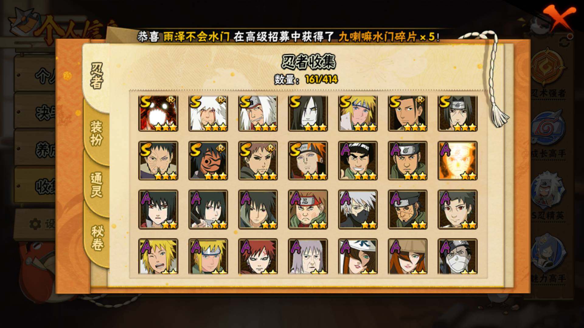【S级忍者】:宇智波带土「忍界大战」(3星),宇智波鼬「须佐能乎」(3星),千手柱间「木叶创立」(3星),罗砂「四代目风影」(3星),自来也「舞之豪杰」(3星),大蛇丸(3星),自来也「传说中的三忍」(3星),波风水门(3星),神秘面具男「红夜之刃」(3星),佩恩「天道」(3星),漩涡鸣人「暴怒