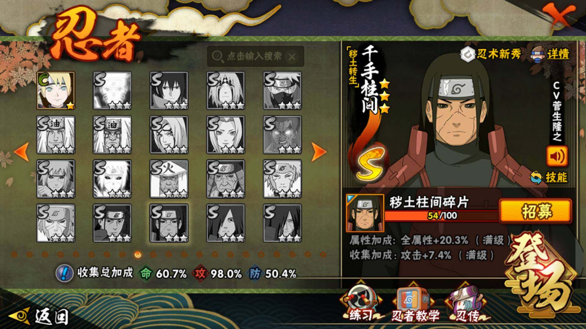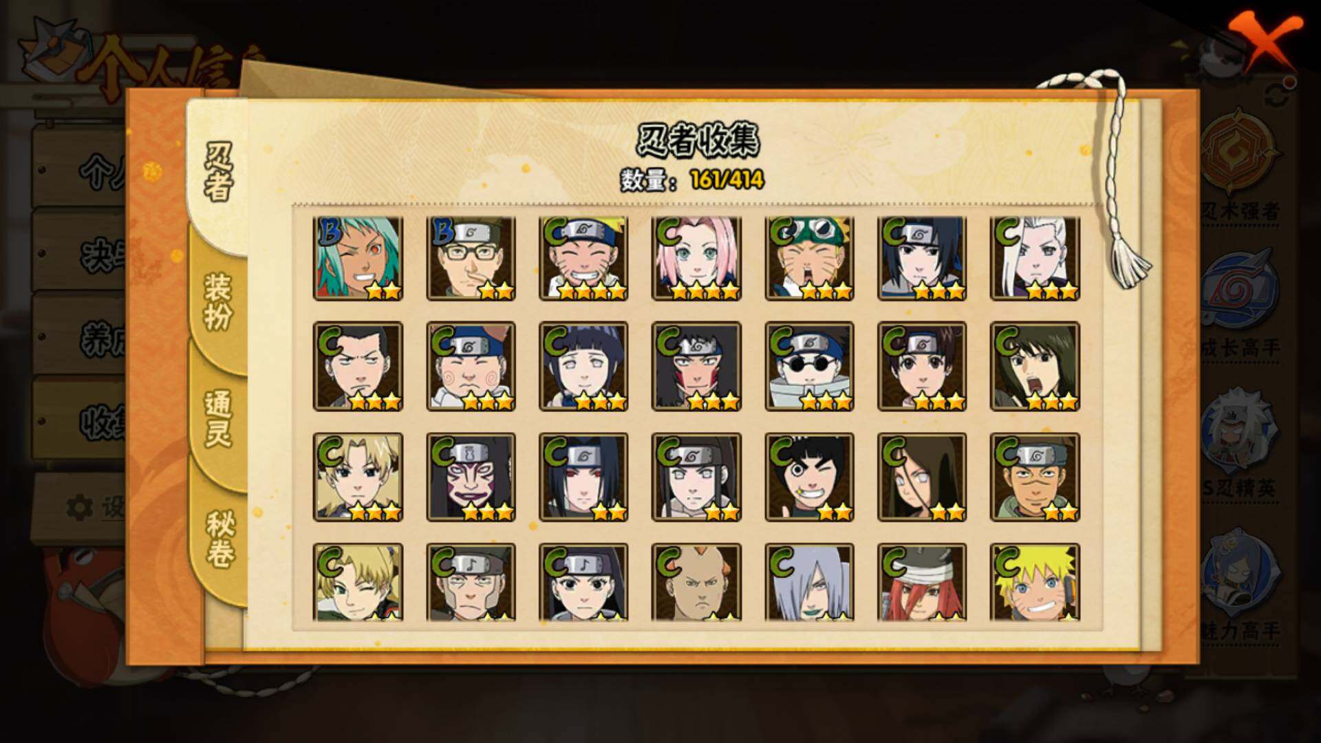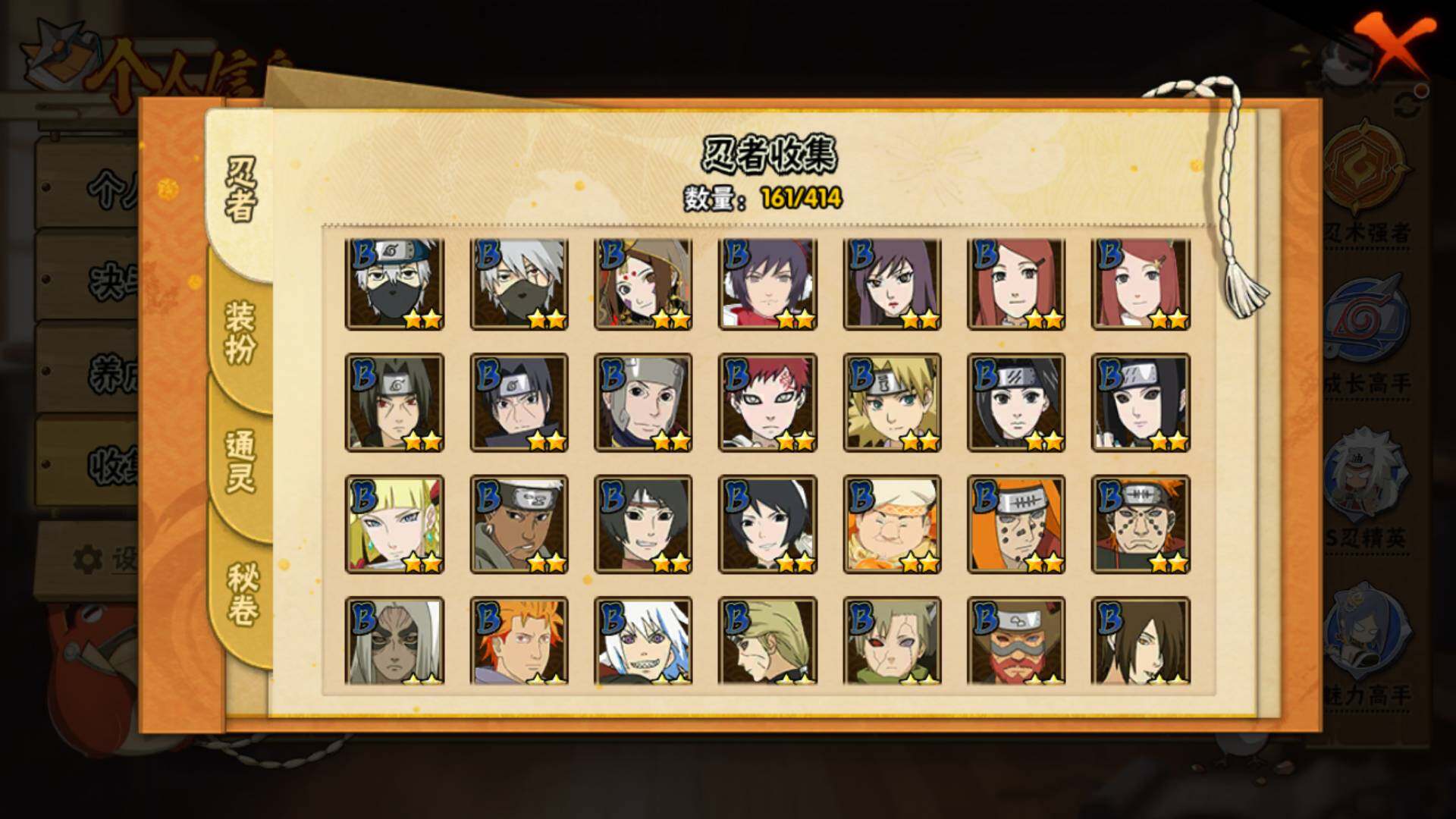 【S级忍者】:宇智波带土「忍界大战」(3星),宇智波鼬「须佐能乎」(3星),千手柱间「木叶创立」(3星),罗砂「四代目风影」(3星),自来也「舞之豪杰」(3星),大蛇丸(3星),自来也「传说中的三忍」(3星),波风水门(3星),神秘面具男「红夜之刃」(3星),佩恩「天道」(3星),漩涡鸣人「暴怒