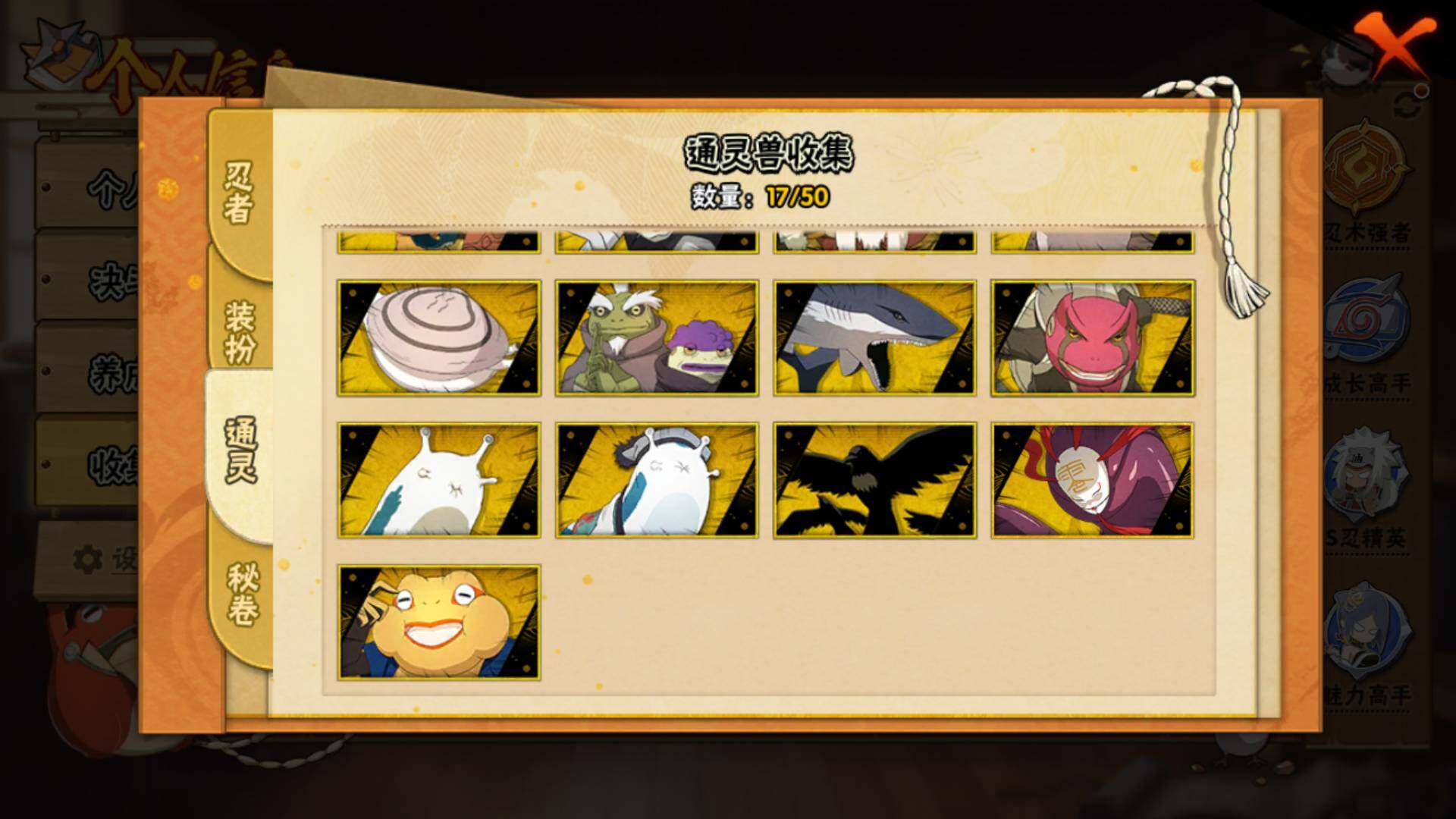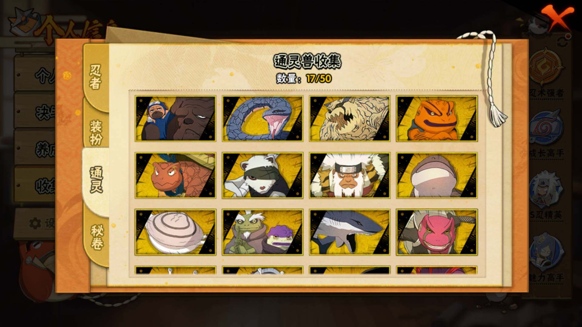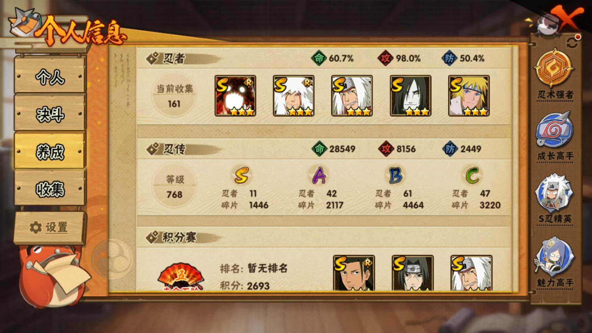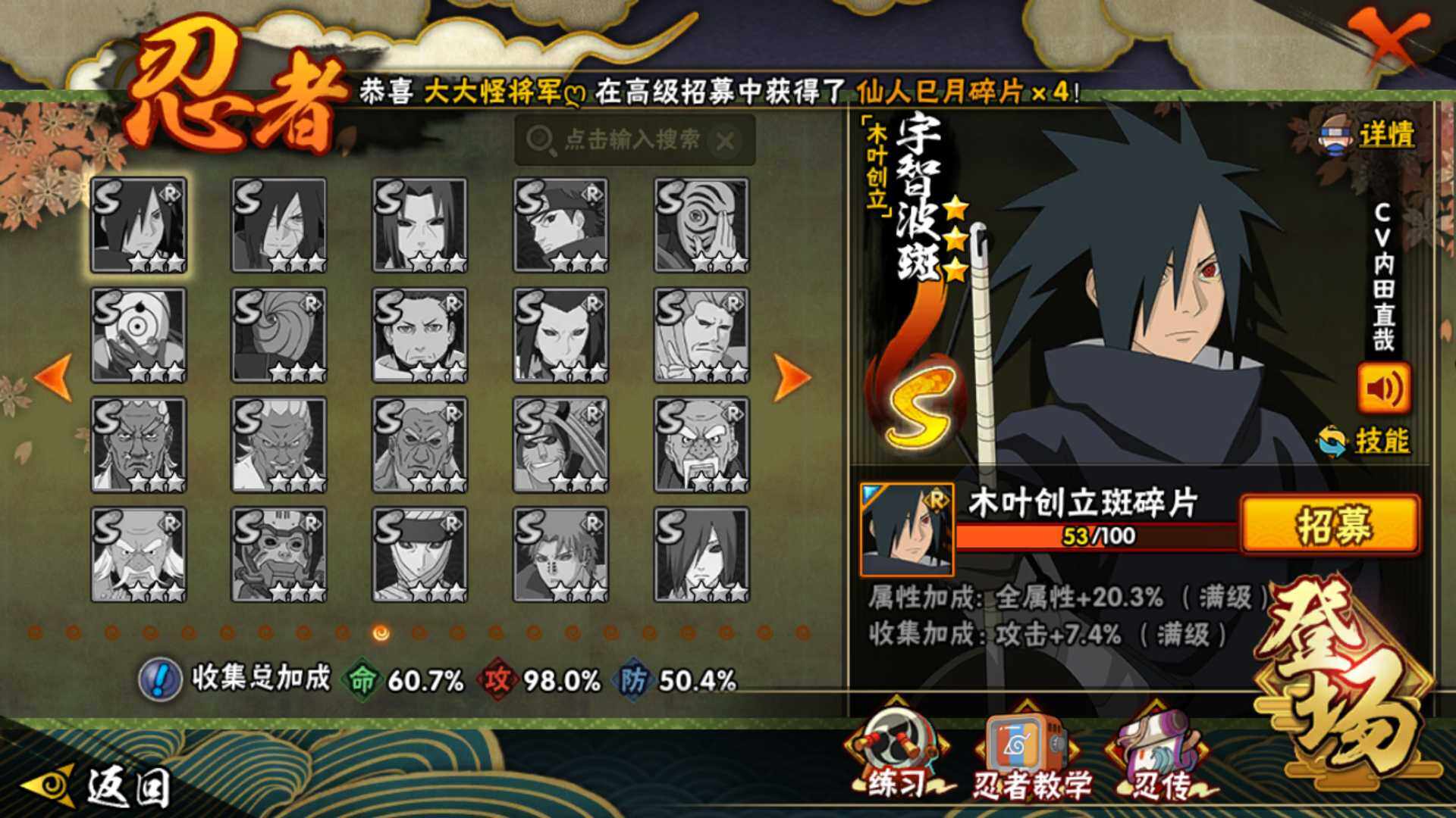【S级忍者】:宇智波带土「忍界大战」(3星),宇智波鼬「须佐能乎」(3星),千手柱间「木叶创立」(3星),罗砂「四代目风影」(3星),自来也「舞之豪杰」(3星),大蛇丸(3星),自来也「传说中的三忍」(3星),波风水门(3星),神秘面具男「红夜之刃」(3星),佩恩「天道」(3星),漩涡鸣人「暴怒