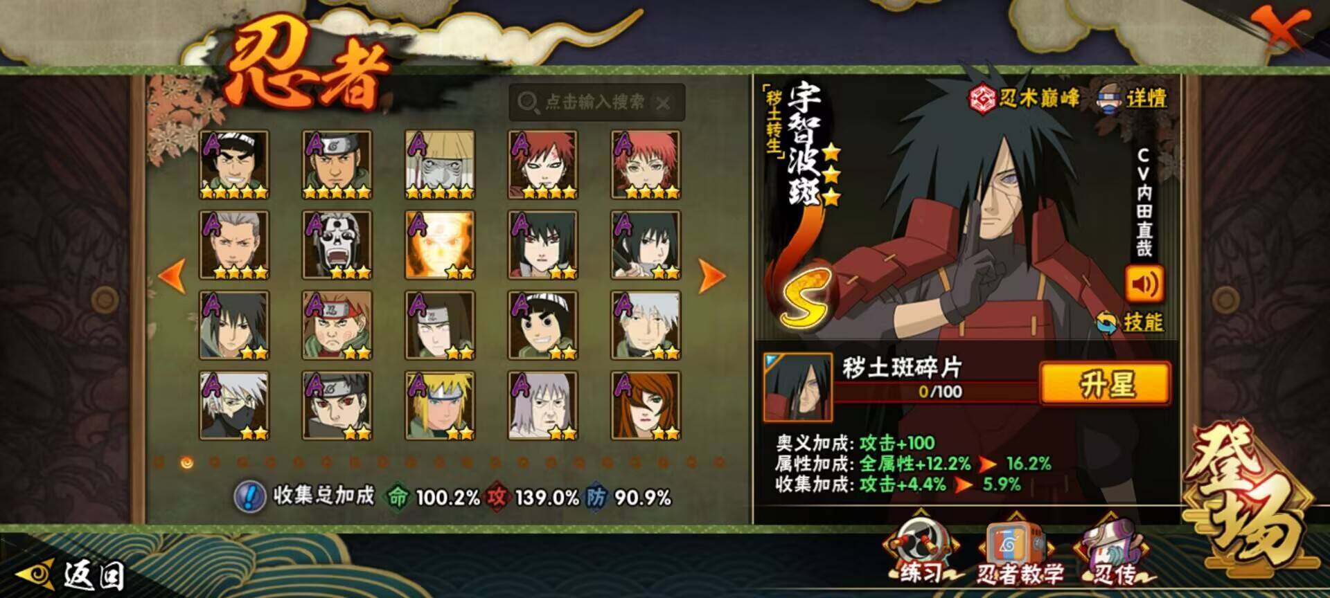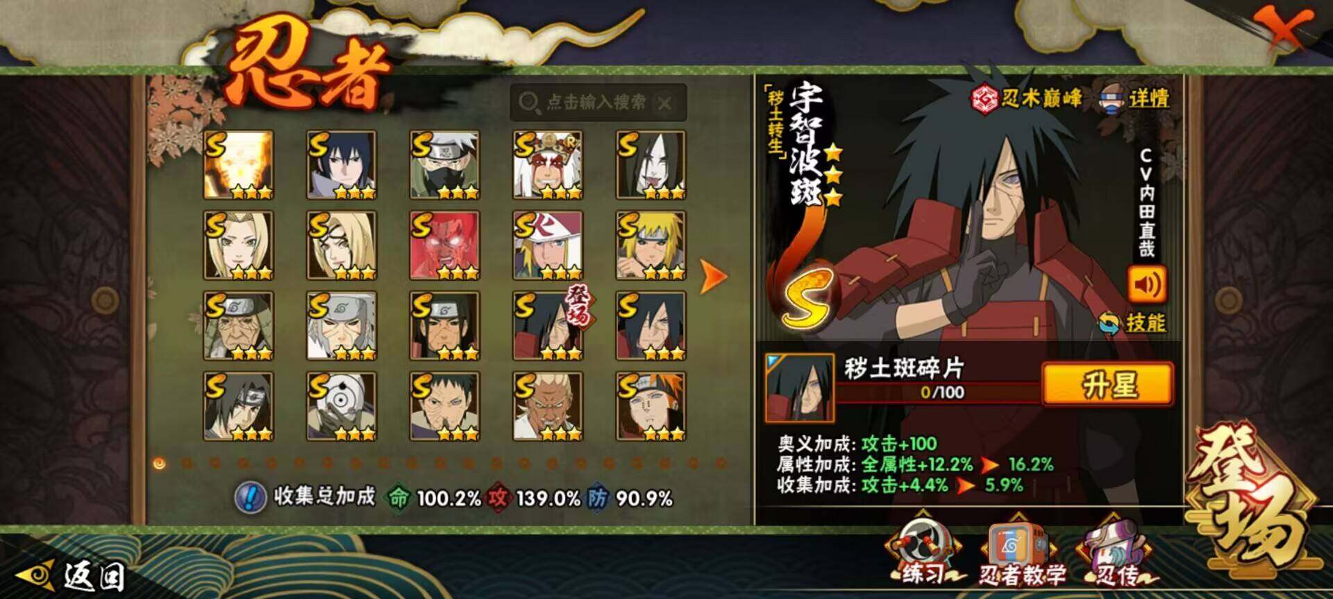 【HYD85】V6/战力1219W/S忍20/A忍38/秽土转生-宇智波斑/百豪-纲手/纲手/五代目雷影-达鲁伊/宇智波止水/5星猿飞阿斯玛/须佐能乎-旗木卡卡西/秽土转生-猿飞日斩/五代目水影-照美冥/5星迈特凯/忍界大战-奇拉比/秽土转生-千手扉间/六代目水影-长十郎/2星蝎「绯流琥」/2星桃地再不斩「秽土转生」/白面具-宇智波斑/死门-迈特凯/四代目土影-黑土/秽土转生-迪达拉/半蛇斗篷-药师兜/3星飞段「死司凭血」/万花筒写轮眼-宇智波佐助/迪达拉/4星我爱罗「疾风传」/小南/九尾查克拉