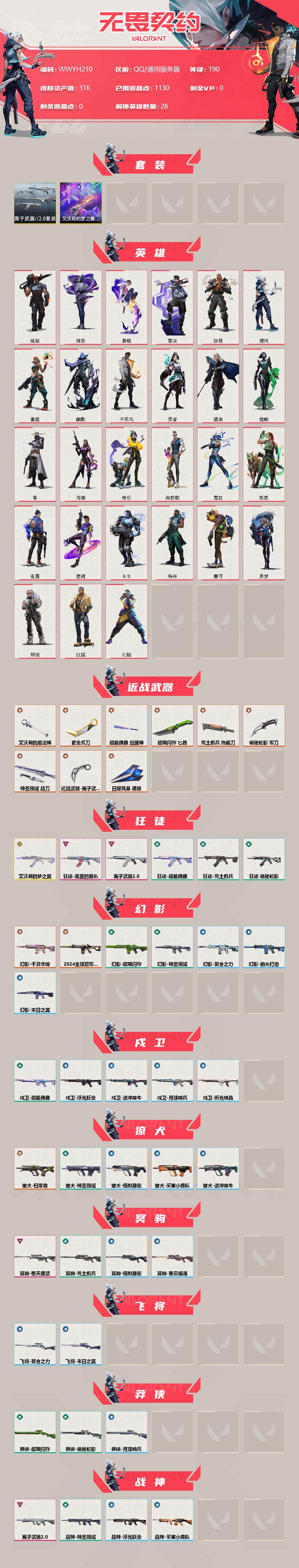 【WWYH210】终极*13/传奇*4/卓越*8/皮肤*99/等级*190/段位:钻石/艾沃莉的梦之翼套装/离子武器//2.0套装/幻棱/炼狱/维斯/暮蝶/钛狐/壹决/铁臂/捷风/雷兹/幽影/不死鸟/贤者/猎枭/蝰蛇/零/芮娜/奇乐/尚勃勒/霓虹/斯凯/夜露/星礈/K/O/海神/盖可/黑梦/钢锁/近战武器-紫金爪刀/近战武器-艾沃莉的魔法棒/近战武器-离子武器//2.0 爪刀/近战武器-超能偶像 应援棒/近战武器-超限闪存 匕首/近战武器-荒土机兵 热能刀/近战武器-诡秘蛇影 军刀/近战武器-神