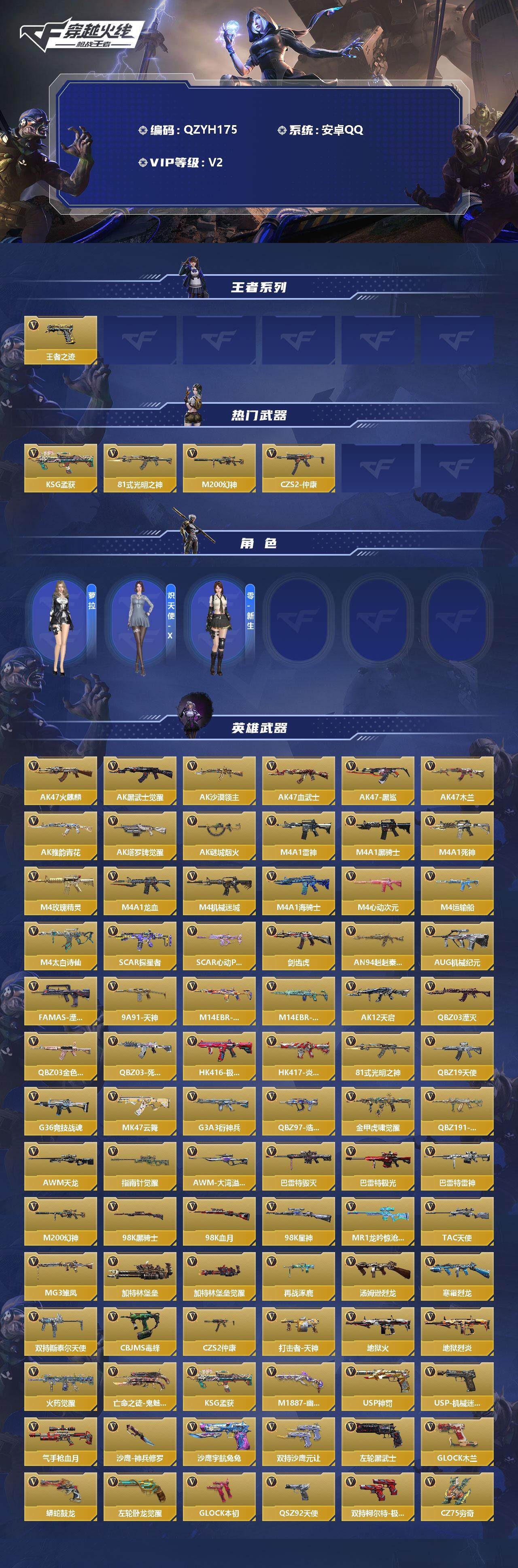 【QZYH175】VIP2/175V/王者之迹/KSG-孟获/81式-光明之神/M200-幻神/CZS2-仲康/萝拉/炽天使-X/零-新生/AK47-火麒麟/AK47-黑武士觉醒/AK47-沙漠领主/AK47-血武士/AK47-黑鲨/AK47-木兰/AK47-雅韵青花/AK47-塔罗牌觉醒/AK47-谜城烟火/M4A1-雷神/M4A1-黑骑士/M4A1-死神/M4A1-玫瑰精灵/M4A1-龙血/M4A1-机械迷城/M4A1-海骑士/M4A1-心动次元/M4A1-运输船/M4A1-太白诗仙/SCA