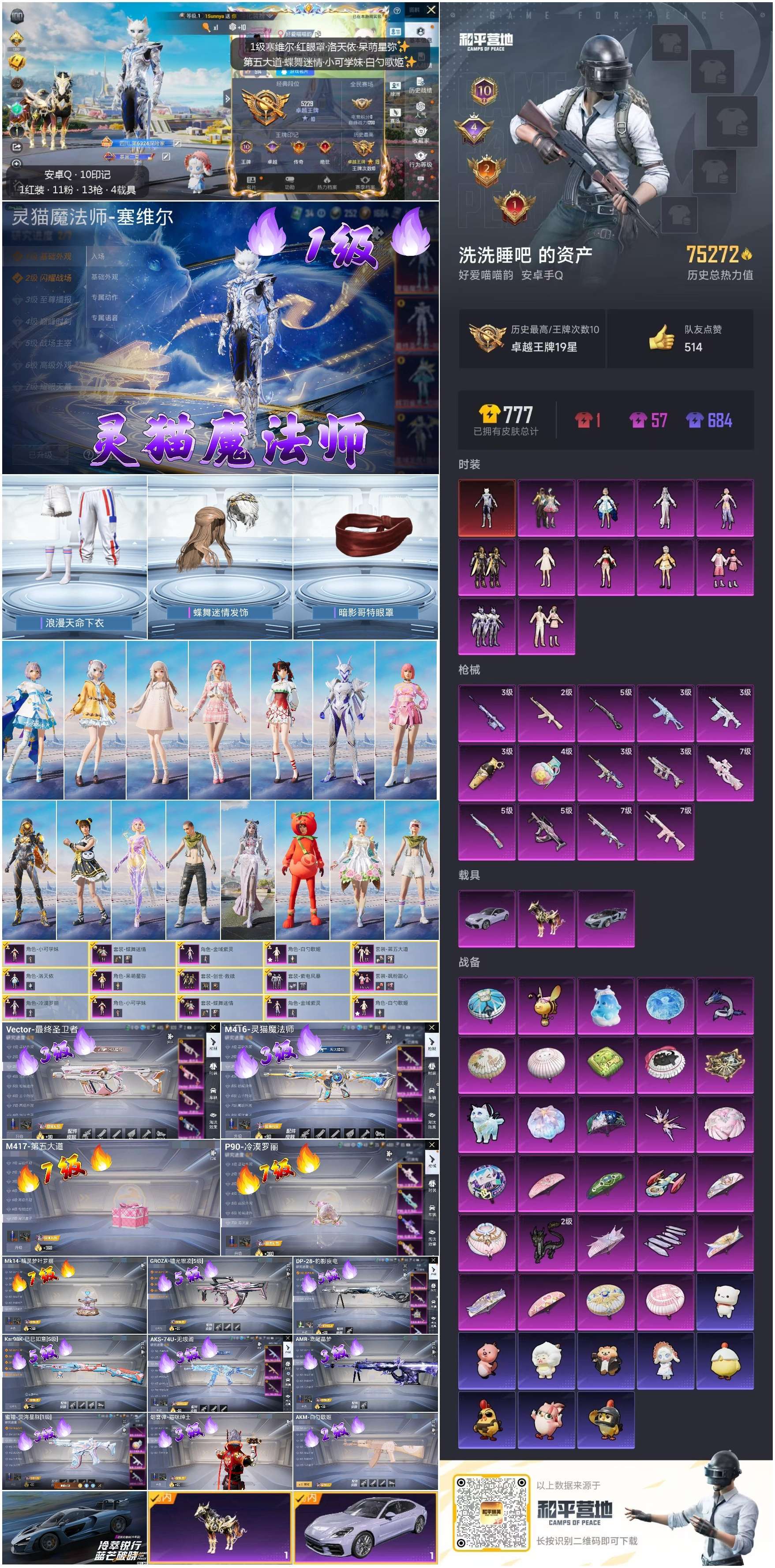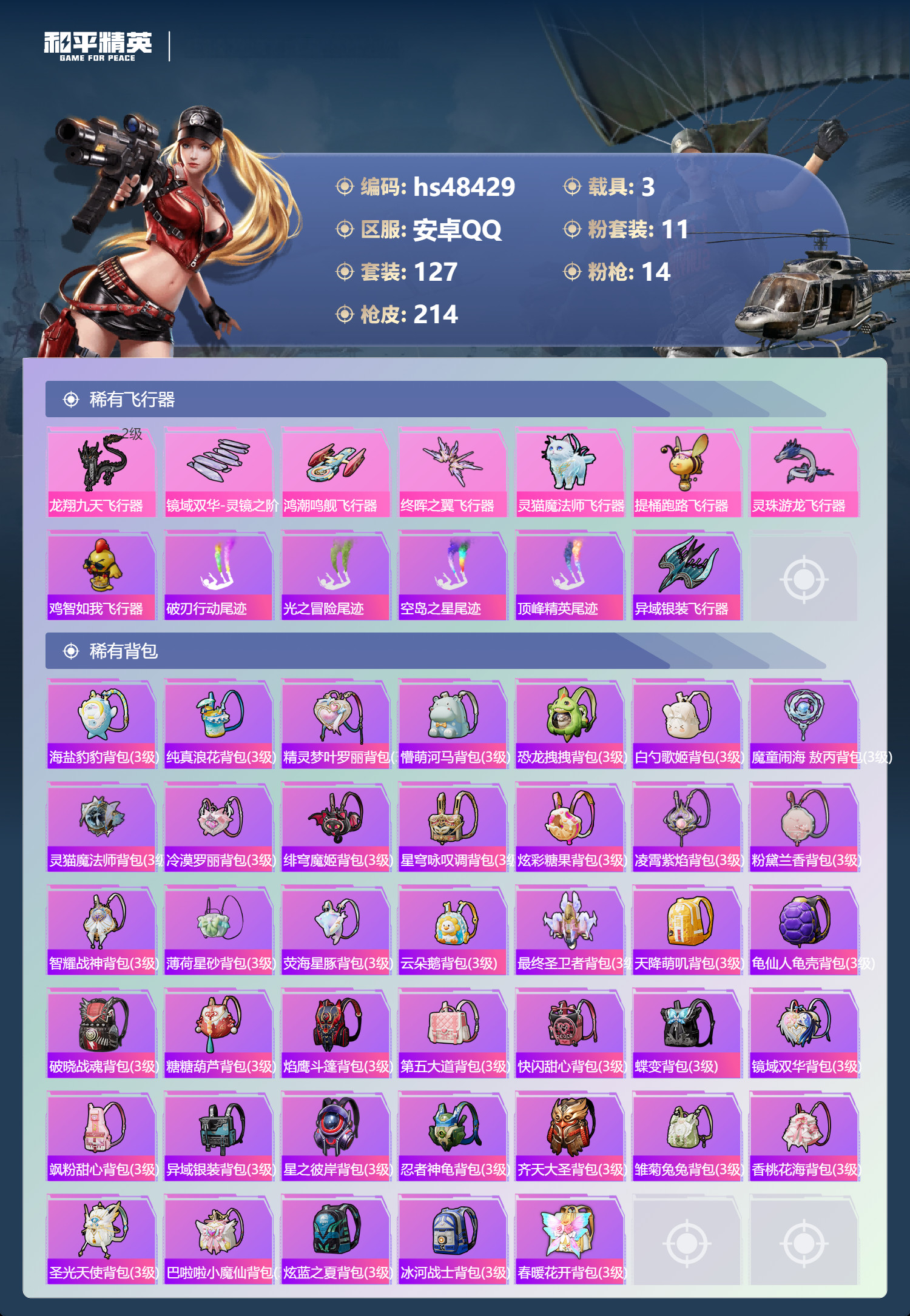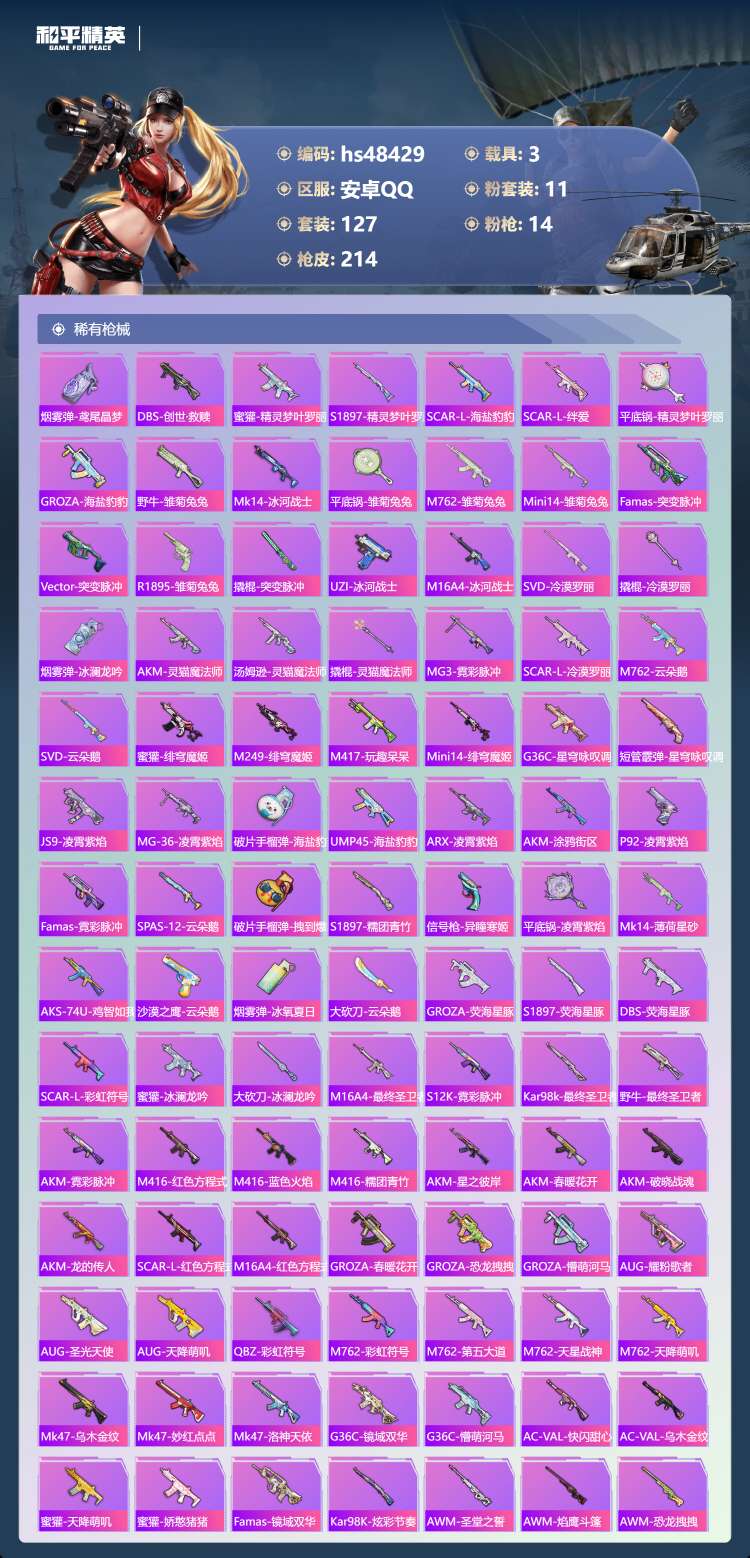 hs48429 安卓手Q-10王牌印记-1红装-11粉装-14特效枪-3载具-75272热力值-12