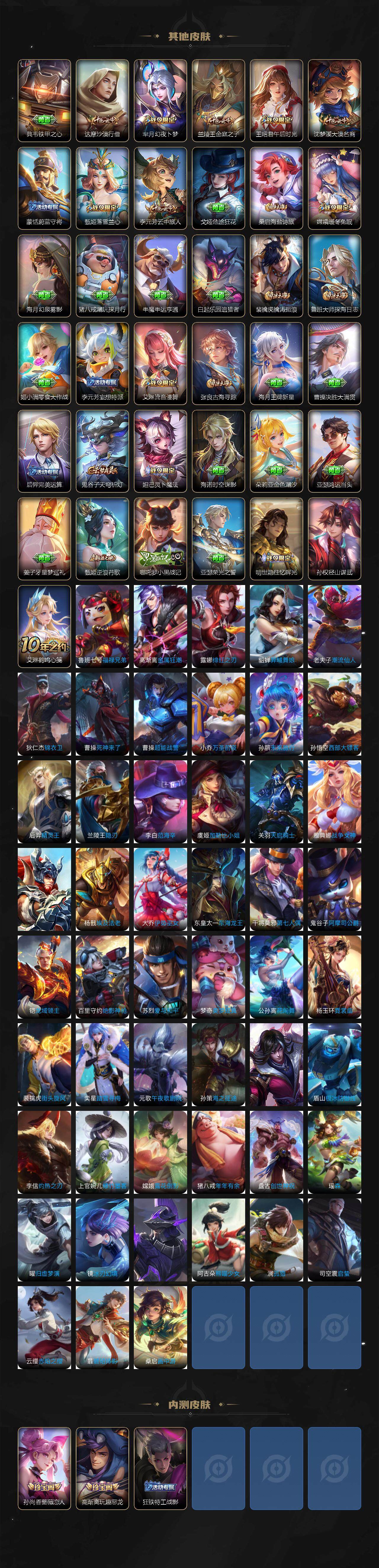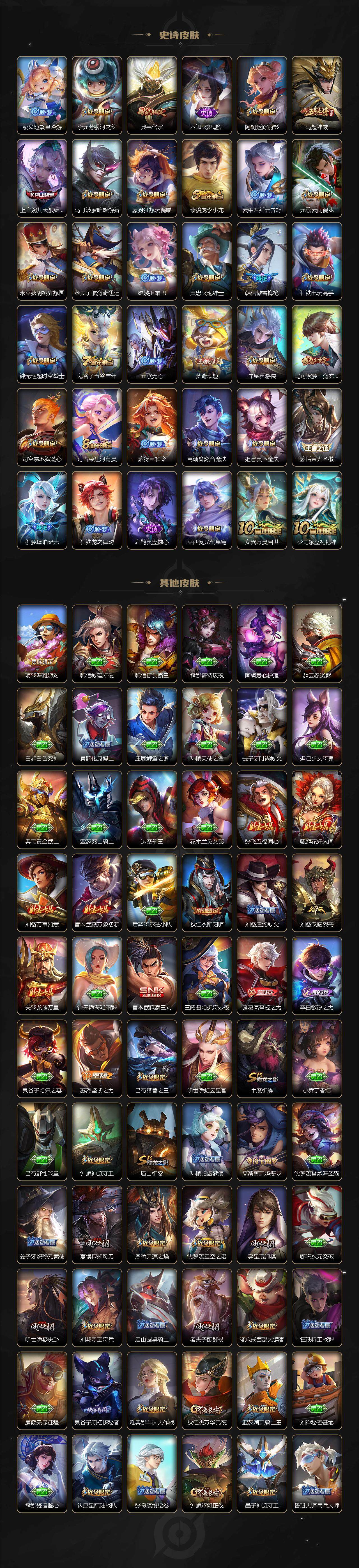 【传说皮肤】:杨戬纵目迁山,后羿神树通天,曹操万灵伏威,赵云乘龙铭钟鼎,王昭君永恒水手月亮,马可波罗妄想实况,李白诗剑行,诸葛亮时雨天司,虞姬启明星使,曜云鹰飞将,李信一念神