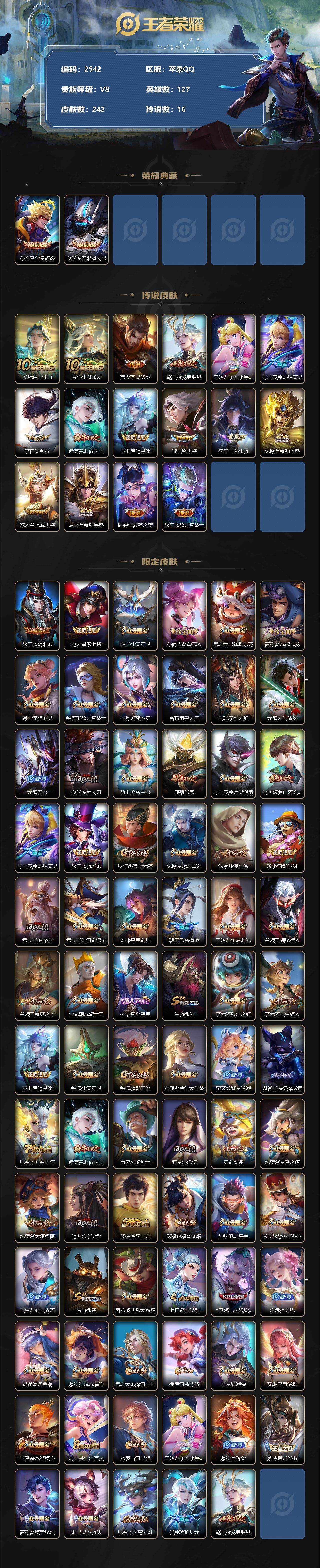 王者荣耀【苹果QQ】苹果Q-V8-最强王者段位-127英雄-242皮肤-2典藏-0珍品无双-0无双