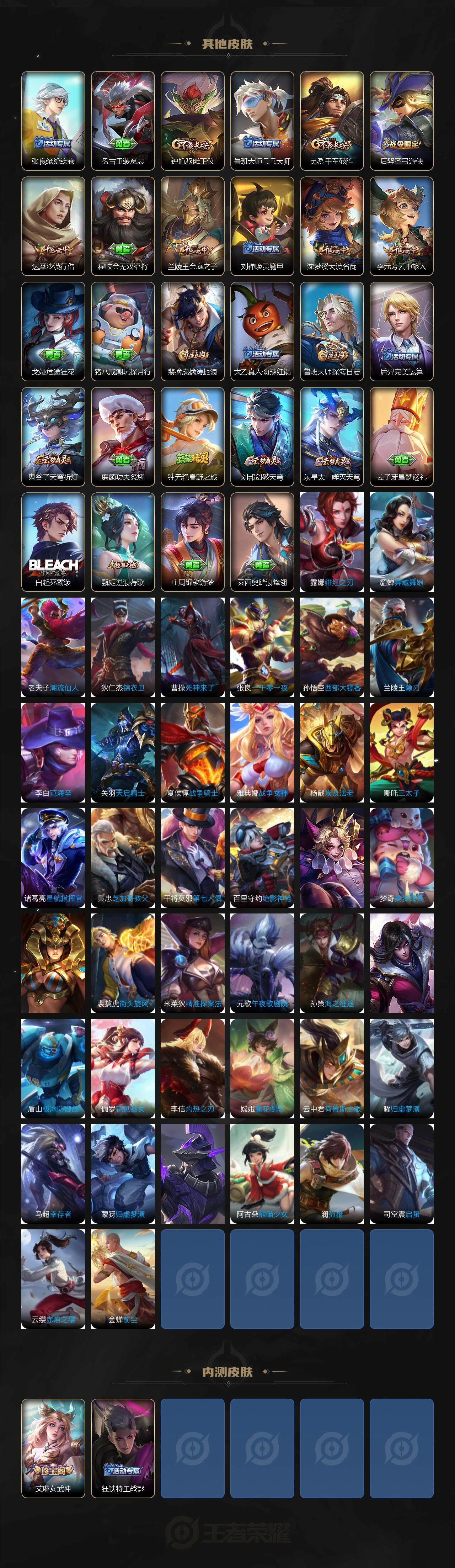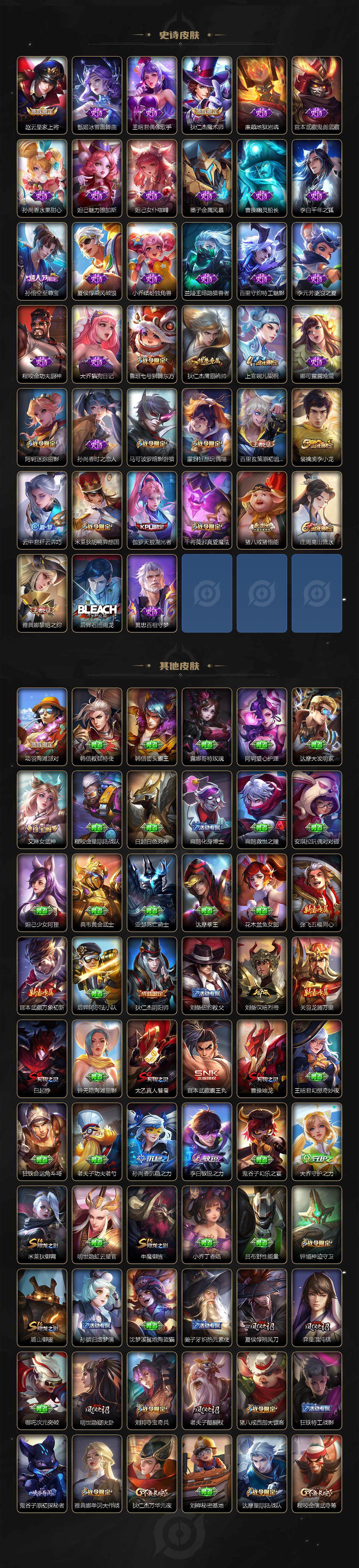 【限定皮肤】:白起狰,狄仁杰阴阳师,赵云皇家上将,鲁班七号狮舞东方,庄周高山流水,阿轲迷踪丽影,夏侯惇朔风刀,曹操烛龙,马可波罗暗影游猎,狄仁杰魔术师,狄仁杰万华元夜,达摩星际陆战队