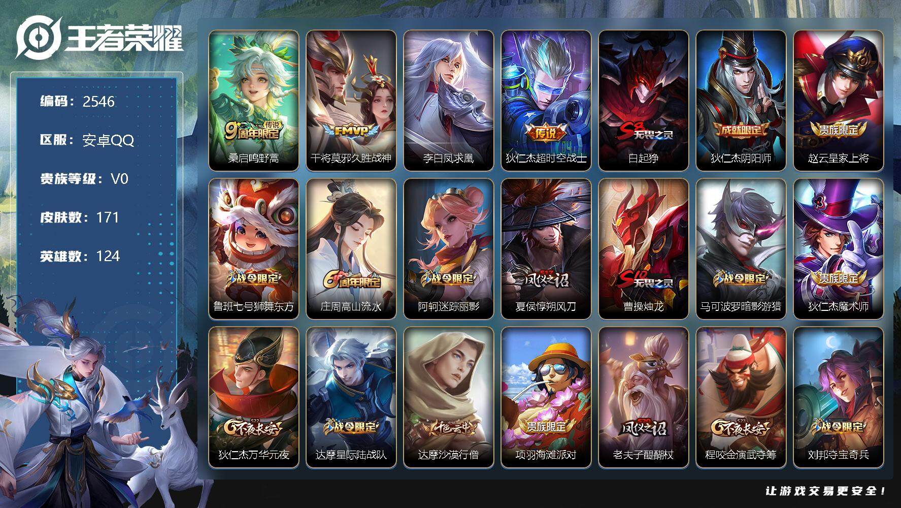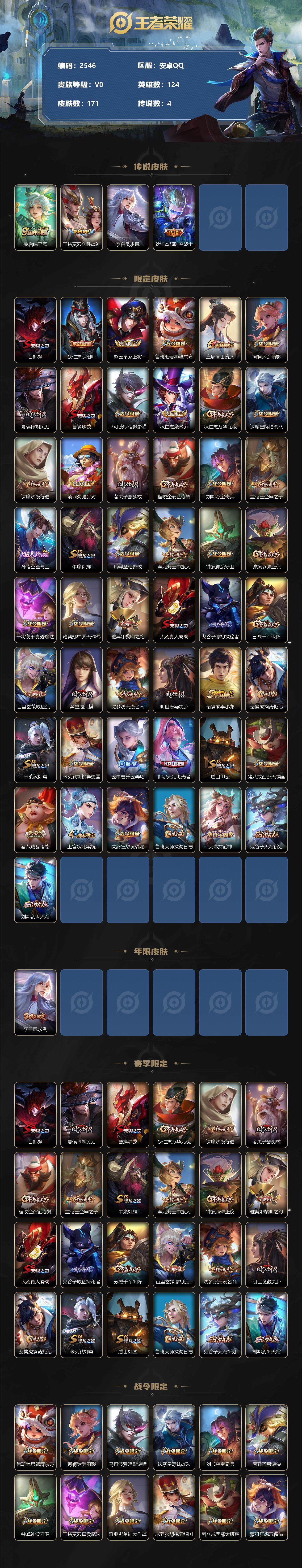 王者荣耀【安卓QQ】安卓Q-V0-永恒钻石II段位-124英雄-171皮肤-0典藏-0珍品无双-0