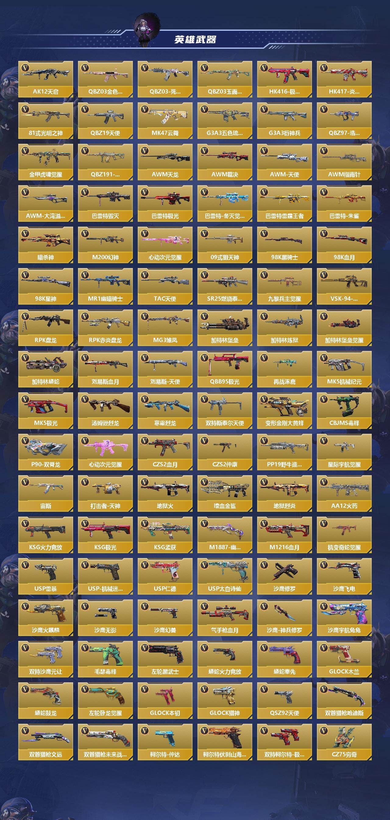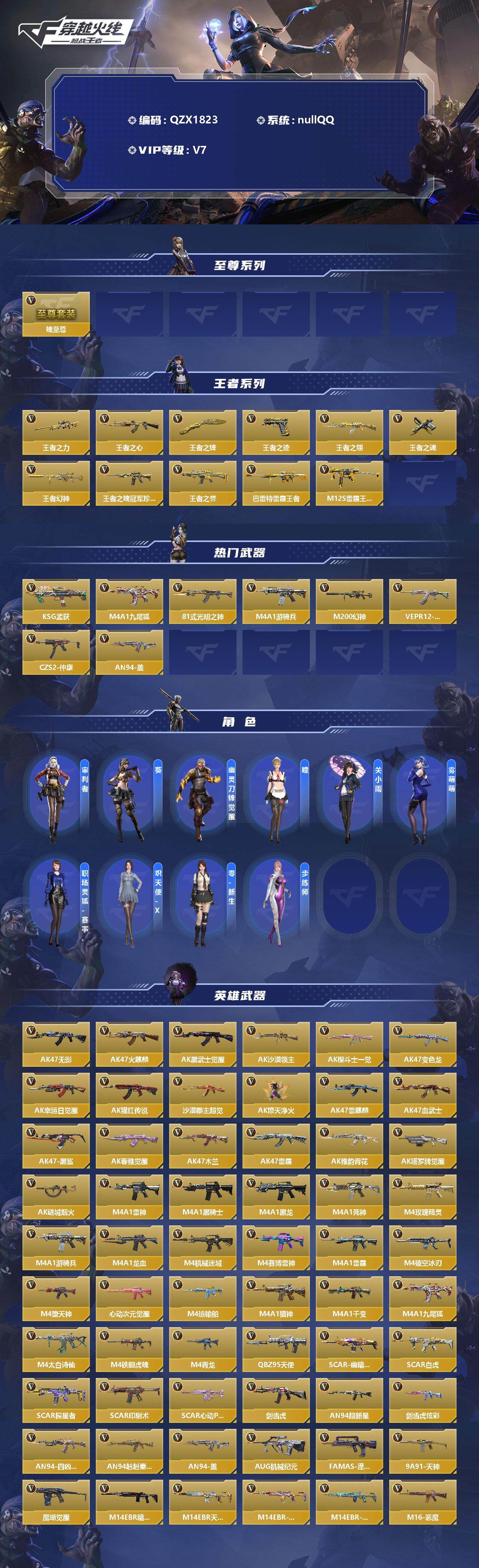 【QZX1823】VIP7/294V/魄至尊/王者之力/王者之心/王者之锋/王者之迹/王者之翎/王者之魂/王者幻神/王者之魄冠军珍藏/王者之誉/巴雷特-雷霆王者/M12S-雷霆王者/KSG-孟获/M4A1-九尾狐/81式-光明之神/M4A1-游骑兵/M200-幻神/VEPR12-宙斯/CZS2-仲康/AN94-盖/审判者/葵/幽灵刀锋觉醒/瞳/关小雨/雾萌萌/职场灵狐赛事经理/炽天使-X/零-新生/步练师/AK47-无影/AK47-火麒麟/AK47-黑武士觉醒/AK47-沙漠领主/AK47-樱斗