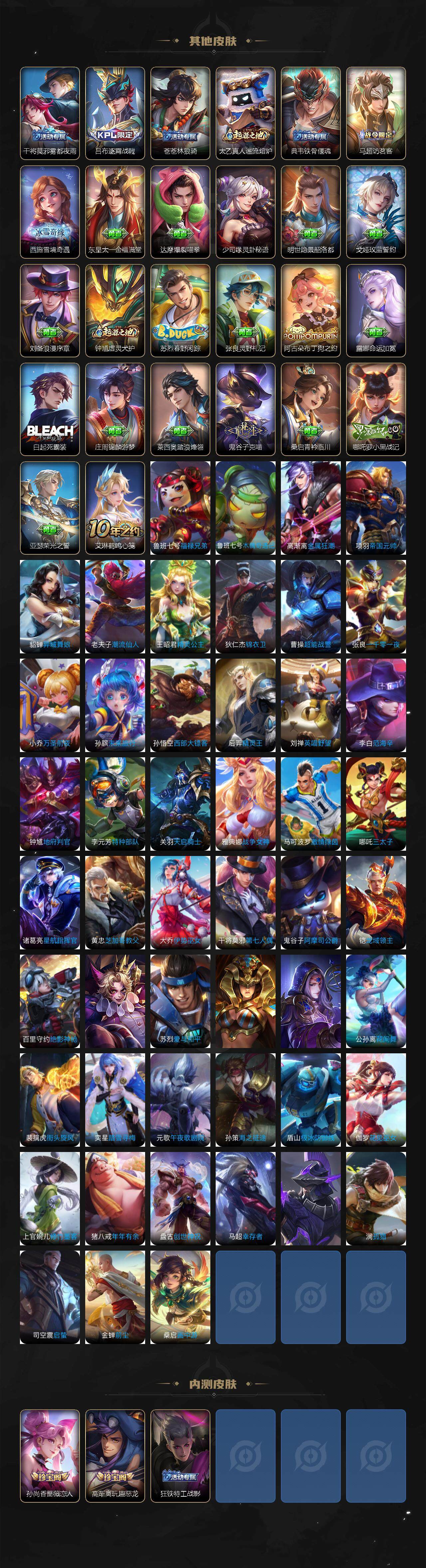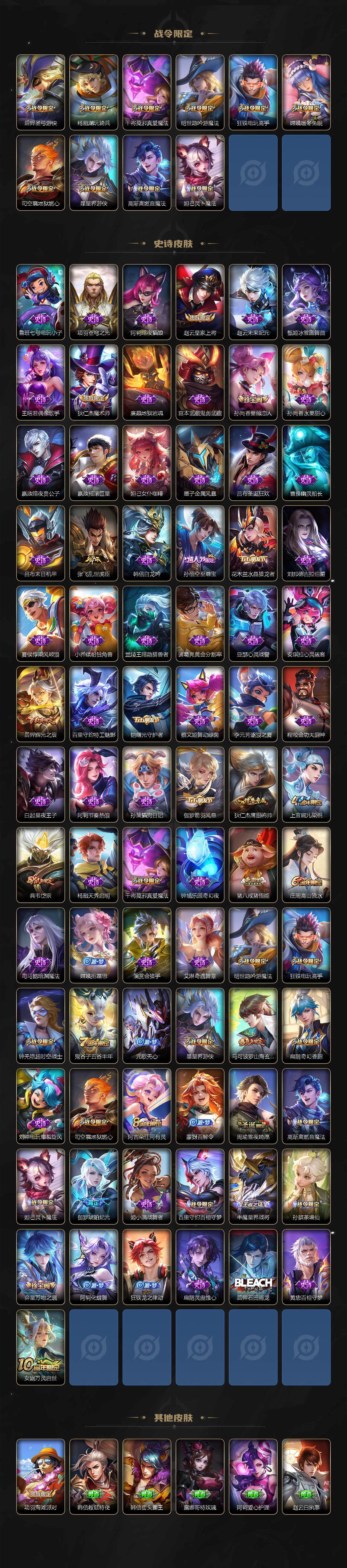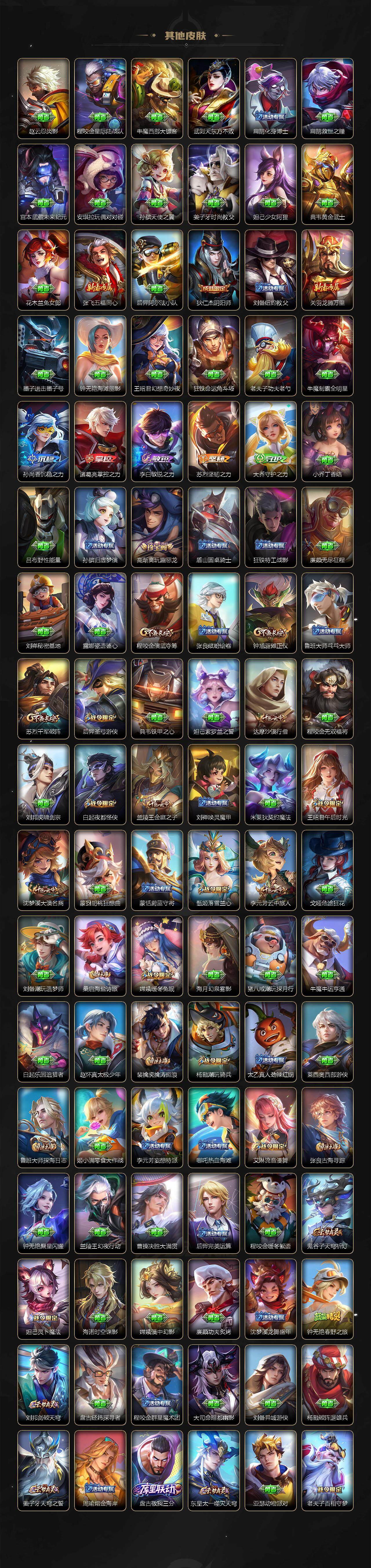 【限定皮肤】:姜子牙天穹之誓,杨戬破阵退雄兵,狄仁杰阴阳师,赵云皇家上将,孙尚香蔷薇恋人,庄周高山流水,高渐离玩趣恶龙,钟无