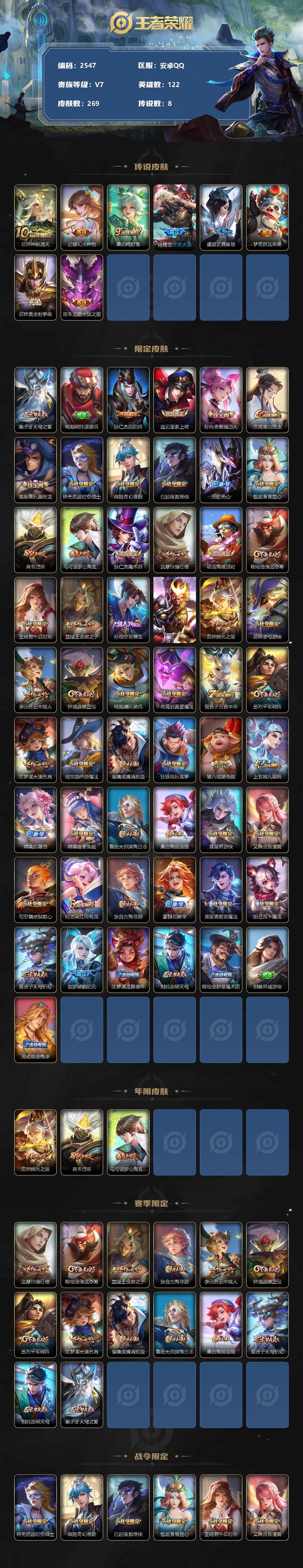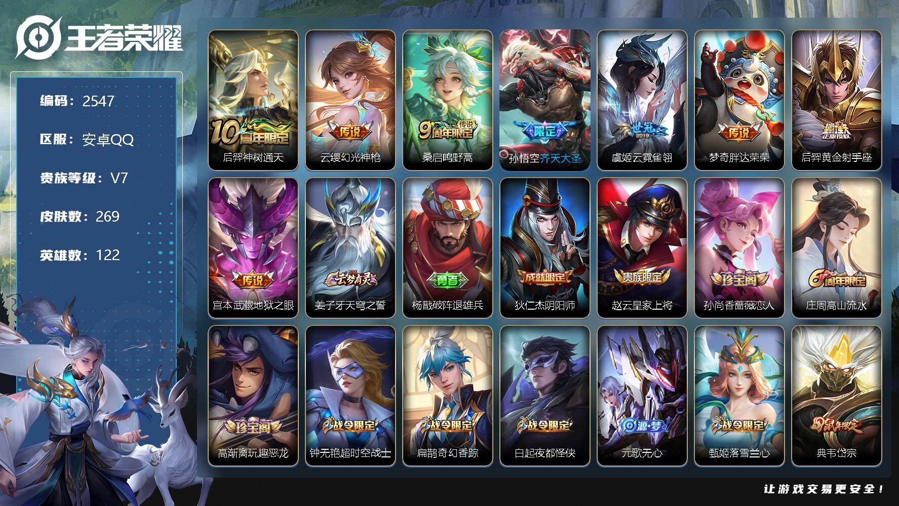 王者荣耀【安卓QQ】安卓Q-V7-最强王者段位-122英雄-269皮肤-0典藏-0珍品无双-0无双