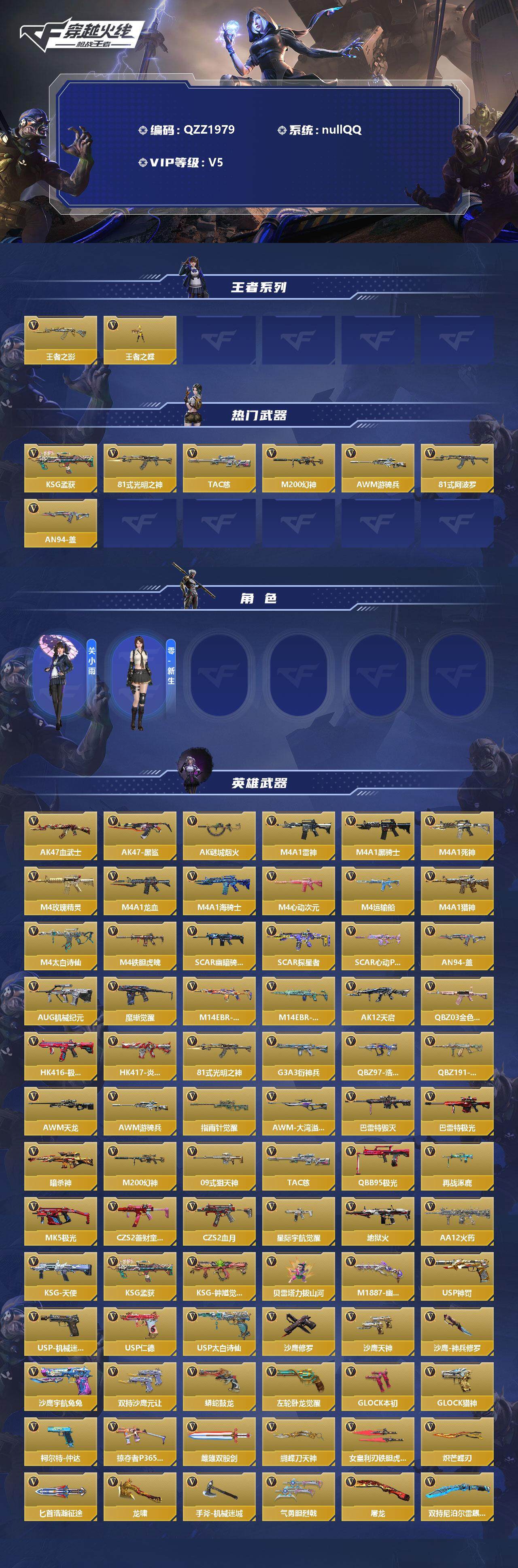 【QZZ1979】VIP5/182V/2王者/王者之影/王者之蝶/KSG-孟获/81式-光明之神/TAC-慈/M200-幻神/AWM-游骑兵/81式-阿波罗/AN94-盖/关小雨/零-新生/AK47-血武士/AK47-黑鲨/AK47-谜城烟火/M4A1-雷神/M4A1-黑骑士/M4A1-死神/M4A1-玫瑰精灵/M4A1-龙血/M4A1-海骑士/M4A1-心动次元/M4A1-运输船/M4A1-猎神/M4A1-太白诗仙/M4A1-铁胆虎魄/SCAR-幽暗骑士/SCAR-探星者/SCAR-心动PIC