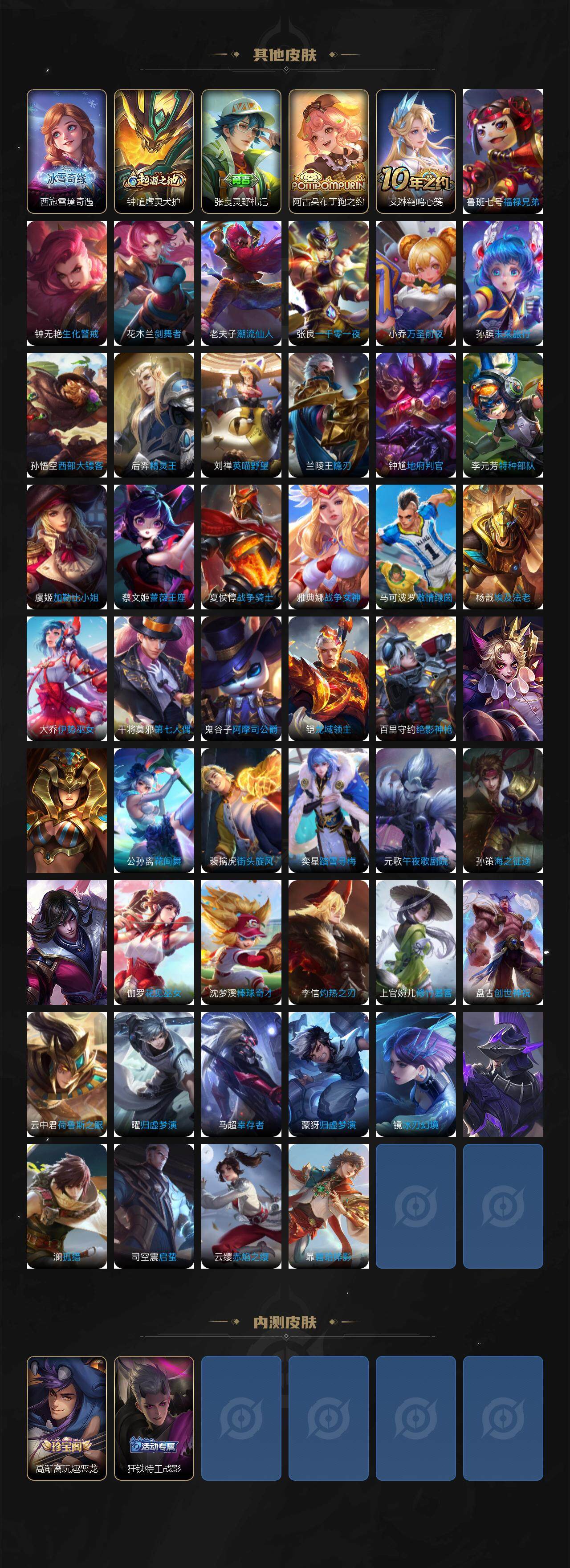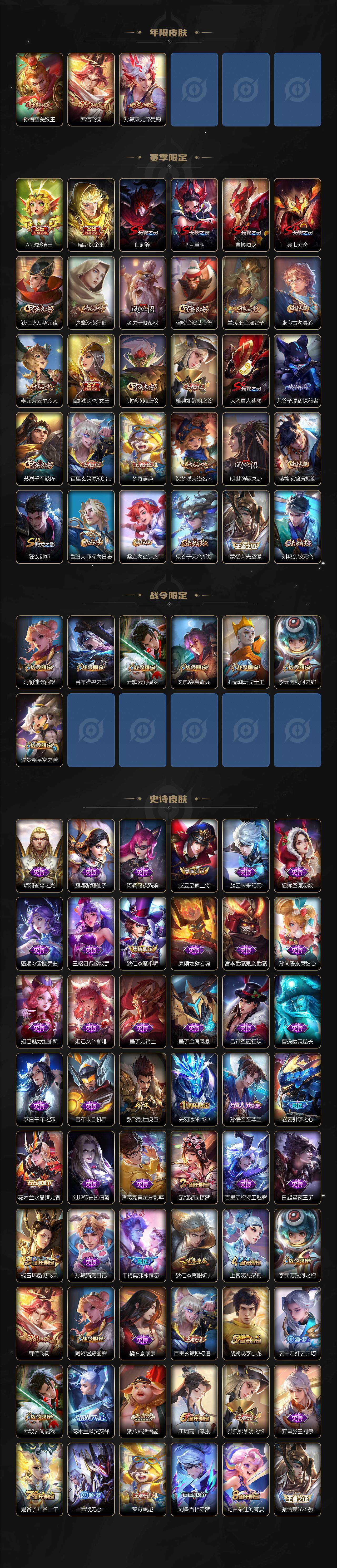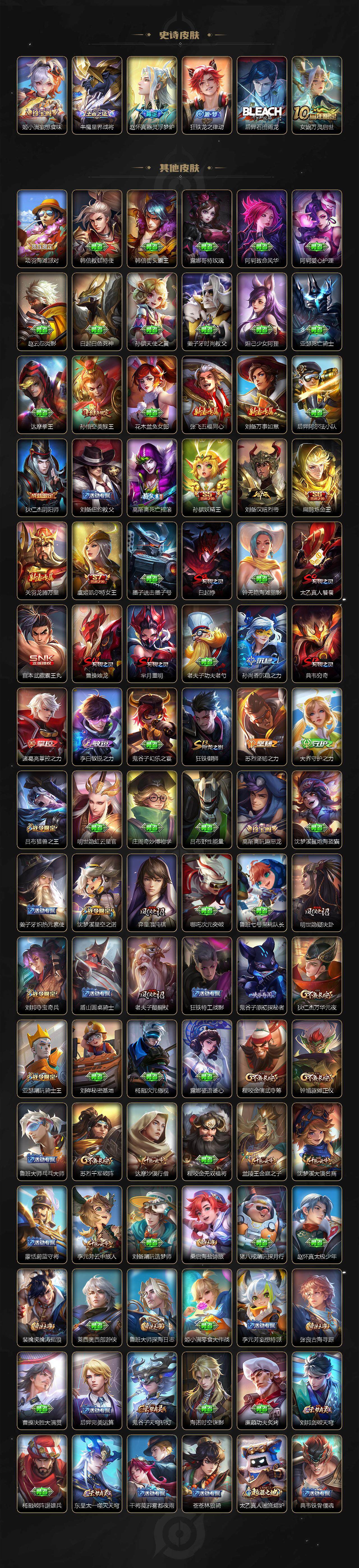 【传说皮肤】:后羿神树通天,干将莫邪千山共赴,澜愿照九州拓,孙策乘龙淬吴钩,马可波罗妄想实况,东皇太一灼幽烈阳,李白诗剑行,赵云淬星耀世,孙悟空零号赤焰,曜云鹰飞