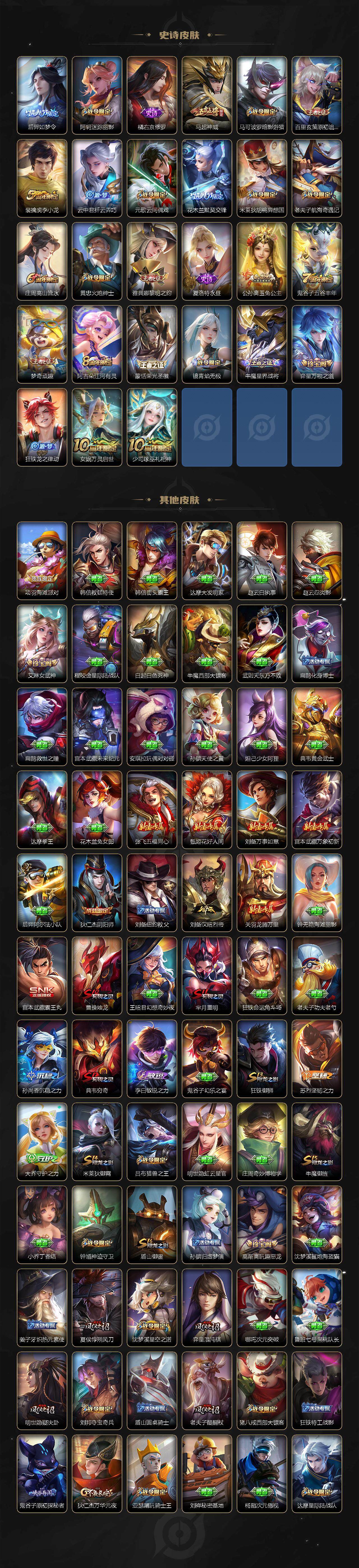 【传说皮肤】:后羿神树通天,司空震愿照山河定,云缨幻光神枪,桑启鸣野蒿,李信一念神魔,伽罗太华,达摩黄金狮子座,梦奇胖达荣荣