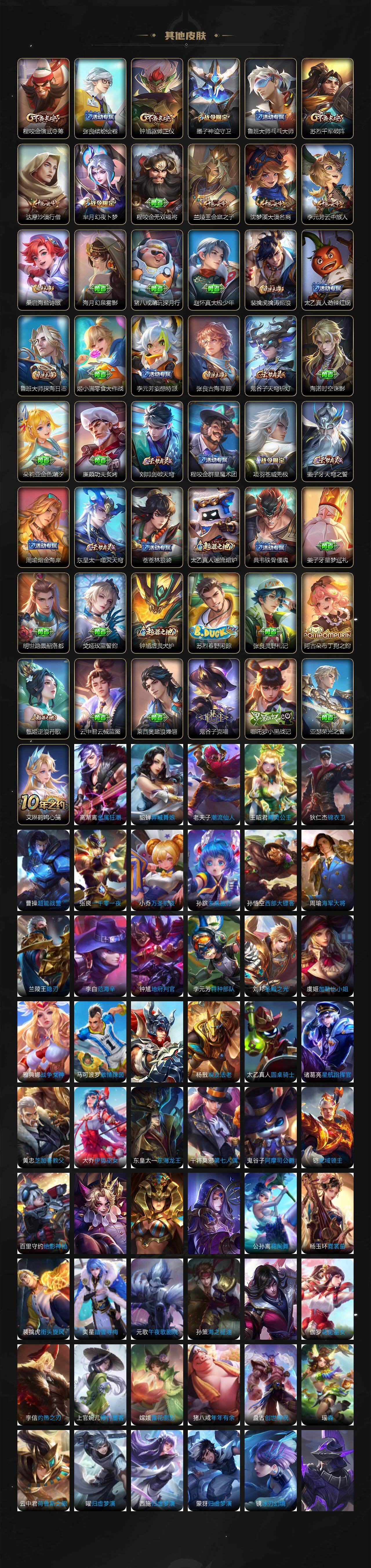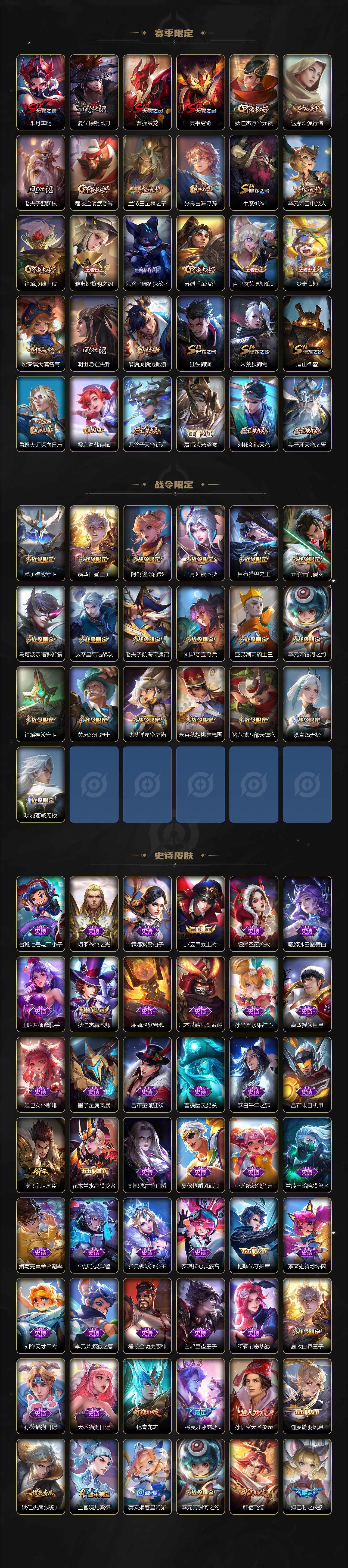 【限定皮肤】:姜子牙天穹之誓,狄仁杰阴阳师,赵云皇家上将,墨子神迹守卫,妲己时