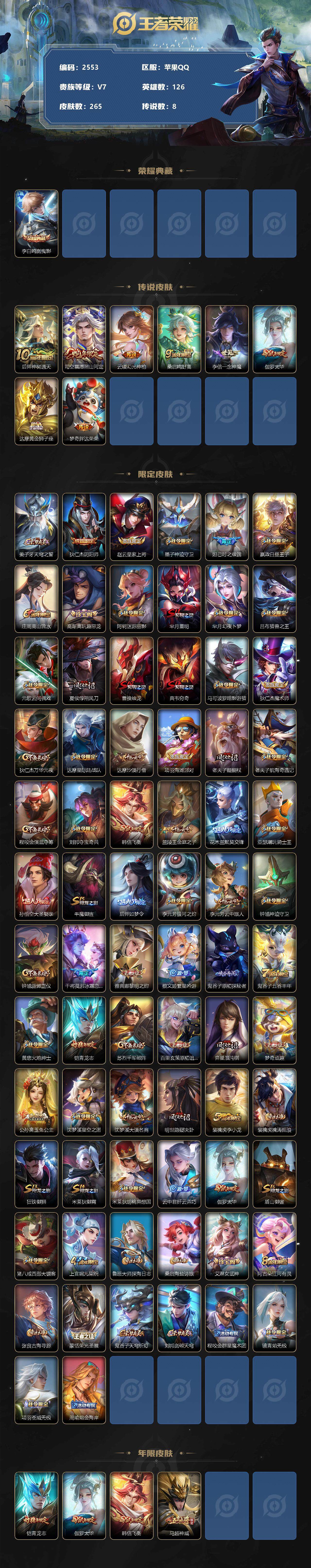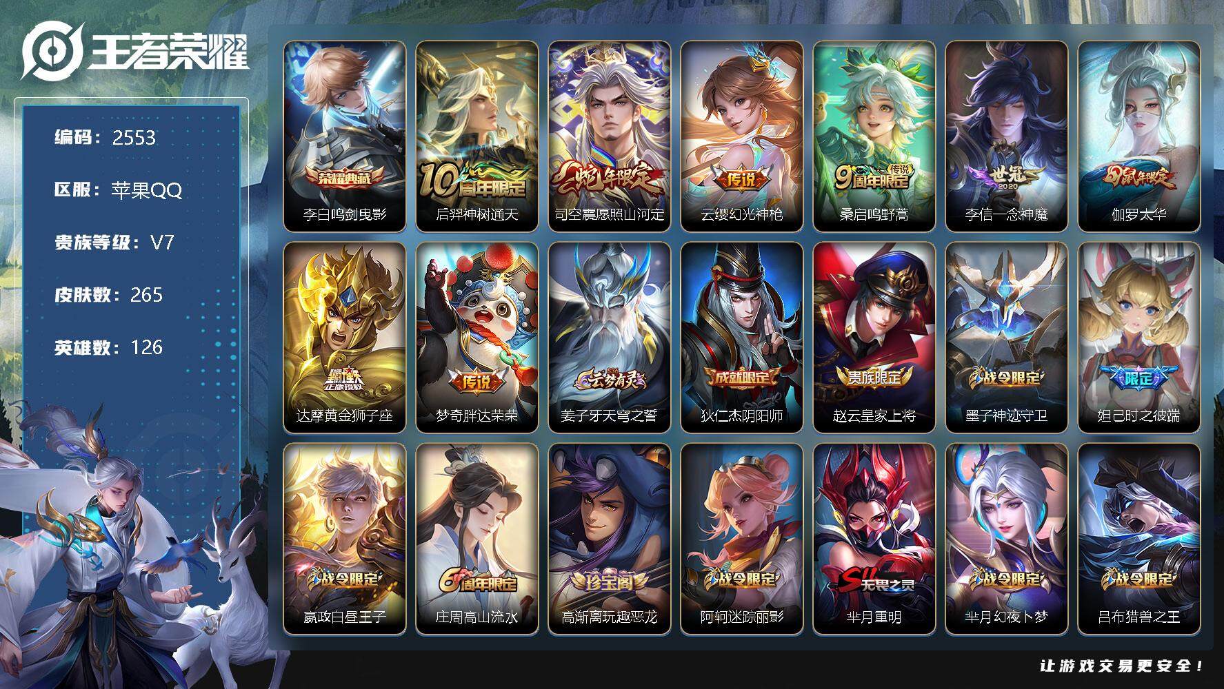 王者荣耀【苹果QQ】苹果Q-V7-最强王者段位-126英雄-265皮肤-1典藏-0珍品无双-0无双
