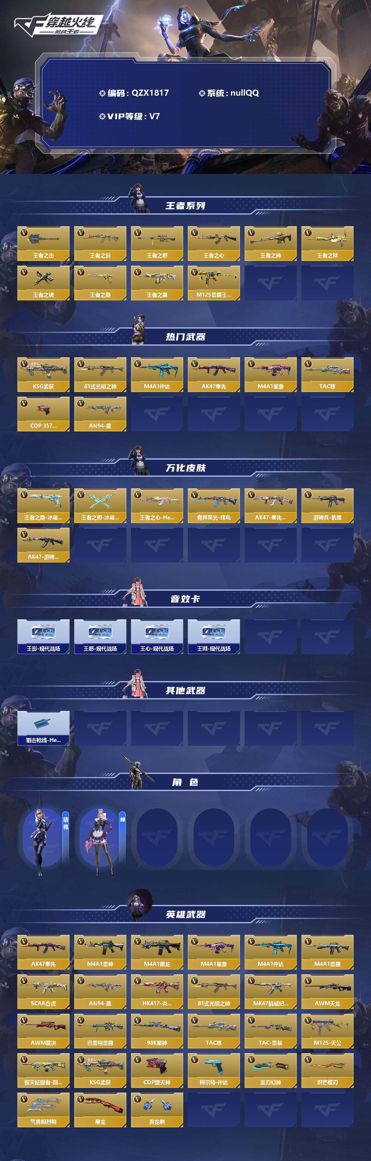 【QZX1817】VIP7/80V/王者之击/王者之影/王者之怒/王者之心/王者之神/王者之狱/王者之魂/王者之隐/王者之霆/M12S-雷霆王者/KSG-孟获/81式-光明之神/M4A1-仲达/AK47-奉先/M4A1-星象/TAC-慈/COP 357-堕天神/AN94-盖/AK47-奉先-无双/AK47-竞界荣光-蜂鸟/AK47-游骑兵-紫魇/王者之心-HeartShot/M4A1-游骑兵-紫魇/王者之隐-冰霜奇迹/王者之仞-冰霜奇迹/王者之影-现代战场/王者之怒-现代战场/王者之心-现代战场