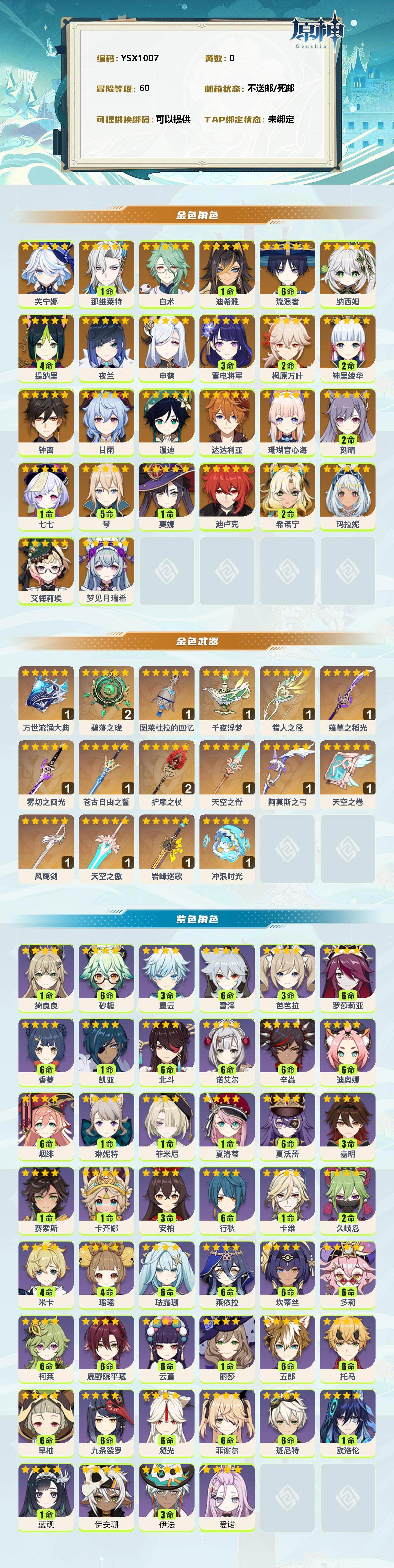 【YSX1007】60级/女主/28个五星角色/梦见月瑞希/2命希诺宁/玛拉妮/艾梅莉埃/芙宁娜/1命那维莱特/白术/1命迪希雅/满命流浪者/纳西妲/4命提纳里/夜兰/申鹤/珊瑚宫心海/3命雷电将军/2命神里绫华/2命枫原万叶/甘雨/钟离/达达利亚/温迪/5命琴/2命刻晴/迪卢克/1命莫娜/1命七七/岩峰巡歌/冲浪时光/万世流涌大典/精2碧落之珑/图莱杜拉的回忆/千夜浮梦/猎人之径/薙草之稻光/雾切之回光/苍古自由之誓/精2护摩之杖/天空之傲/天空之卷/阿莫斯之弓/风鹰剑/天空之脊/0命爱诺/3