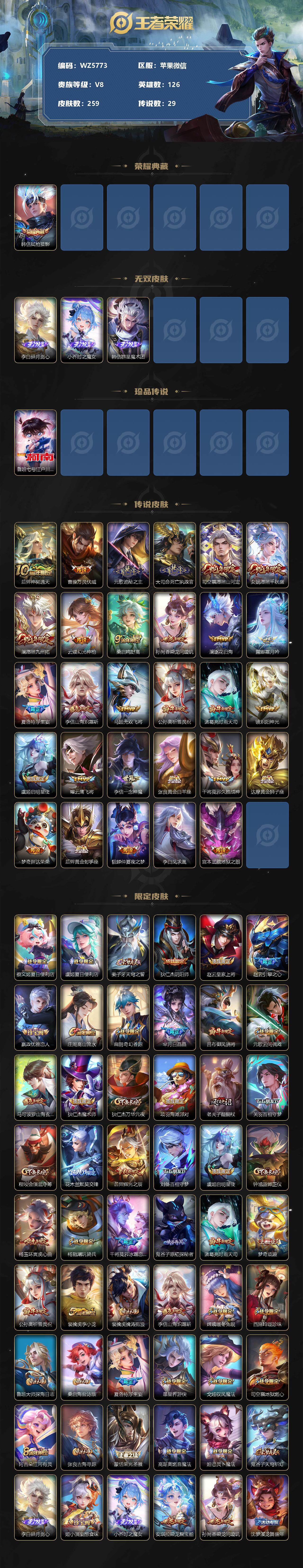 苹果WX-V8-最强王者段位-126英雄-259皮肤-1典藏-0珍品无双-3无