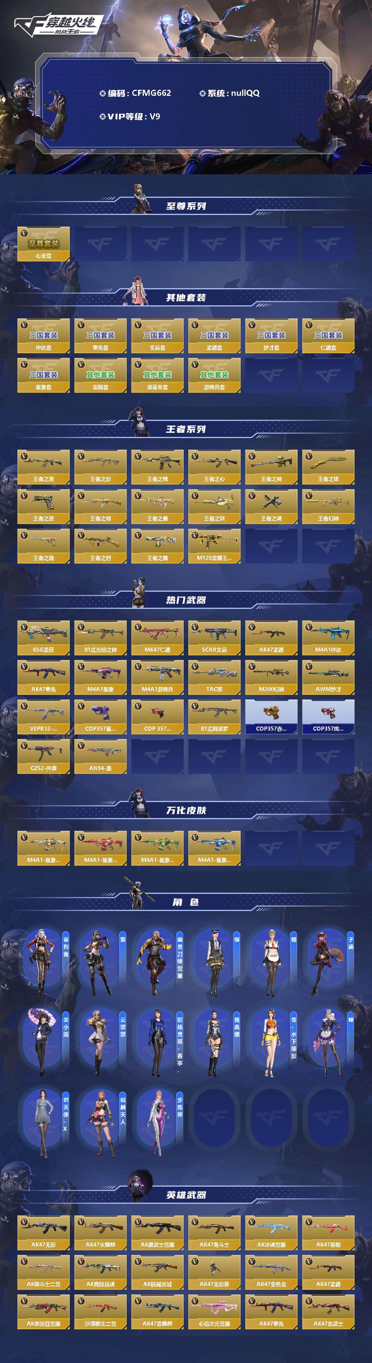 【CFMG662】VIP9/405V/16王者/心至尊/仲达套/文远套/星象套/孟德套/奉先套/仁德套/妙才套/宙斯套/波塞冬套/游骑兵套/王者之翼/王者之影/王者之魄/王者之心/王者之神/王者之锋/王者之迹/王者之翎/王者之兽/王者之狱/王者之魂/王者幻神/王者之隐/王者之烈/王者之霆/M12S-雷霆王者/KSG-孟获/81式-光明之神/MK47-仁德/SCAR-文远/AK47-孟德/M4A1-仲达/AK47-奉先/M4A1-星象/M4A1-游骑兵/TAC-慈/M200-幻神/AWM-妙才/V